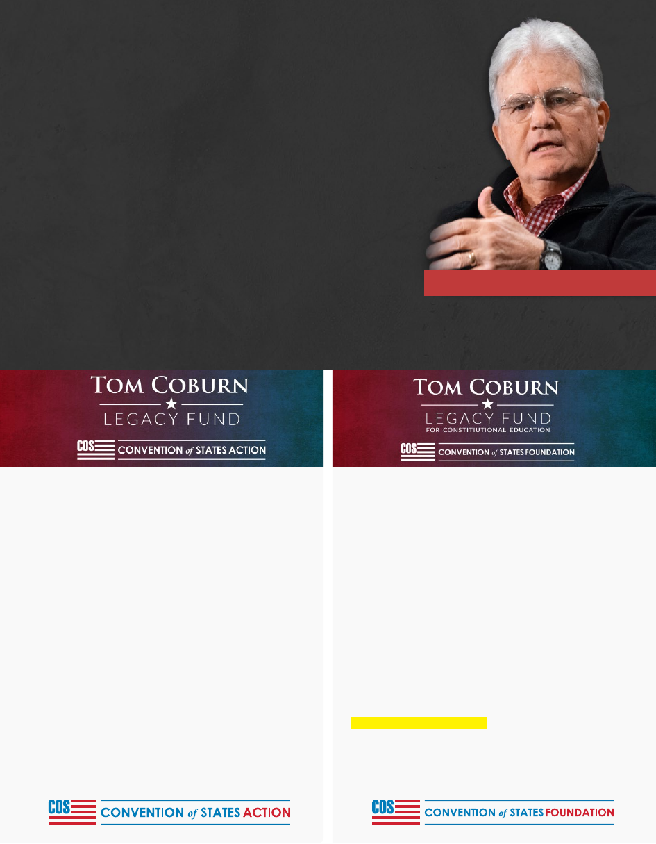 ![]() ![]() ![]() ![]() ![]() ![]() ![]() ![]() REMEMBERING AN AMERICAN STATESMAN ON MARCH 28, 2020 the nation lost its greatest living statesman: a father, grandfather, husband, and a great friend of the Republic—US Senator, Dr. Tom Coburn. When asked why he left the Senate early to become the Senior Advisor to Convention of States (COS) he responded: “After many years in Washington, one of the reasons I left was because I no longer believe that Washington is capable of reining itself in… the only avenue to change is the one given to us by our Founders in the Constitution- an Article V Convention of States, where the people, not the politicians, are in charge.” He often referred to his work with COS as, “the most important work of my lifetime.” Senator Coburn served alongside us for the last 5 years of his life, right up until he passed. In honor of his mem- ory, COS Action and the COS Foundation have launched legacy programs in his name to complete the most important work of his life by calling an Article V Convention of States. by Mark Meckler US SENATOR TOM COBURN COS Action, a 501©(4) non-profit, will continue the ini- tiatives developed under Dr. Coburn’s leadership including… Proven Legislative Strategies - Executing state strategies based on legislative calendars, committee assignments, and whip counts from all 50 states. Recruiting Campaigns - Recruiting and deploying activists from every district. Voter Outreach Program - Conducting voter outreach in key districts. Political Canvassing - Telephone bank and canvass to se- cure legislative support. Contributions received: COS Action, c/o The Tom Coburn Legacy Fund, 5850 San Felipe Suite 580 Houston, TX 77057 (512)487-5525 www.conventionofstates.com/tom-coburn-legacy Convention of States Foundation, a 501©(3) tax- deductible non-profit, is proud to announce The Tom Coburn Legacy Fund for Constitutional Education. Tom was a visionary who dreamed of a day when all Amer- icans understood their constitutional right to impose fiscal restraints on Congress, limit the power and jurisdiction of the federal government, and limit the terms of office for members of Congress and its officials. He knew this could only be done through calling an Article V Convention of States. The Tom Coburn Legacy Fund for Constitutional Education seeks to heighten awareness of the Convention of States movement and provide training to millions of Americans. Tax-deductible contributions received: COS Foundation, c/o The Tom Coburn Legacy Fund for Constitutional Education, 5850 San Felipe Suite 575, Houston, TX 77057 (512)487-5525 www.conventionofstates.com/tom-coburn-legacy |