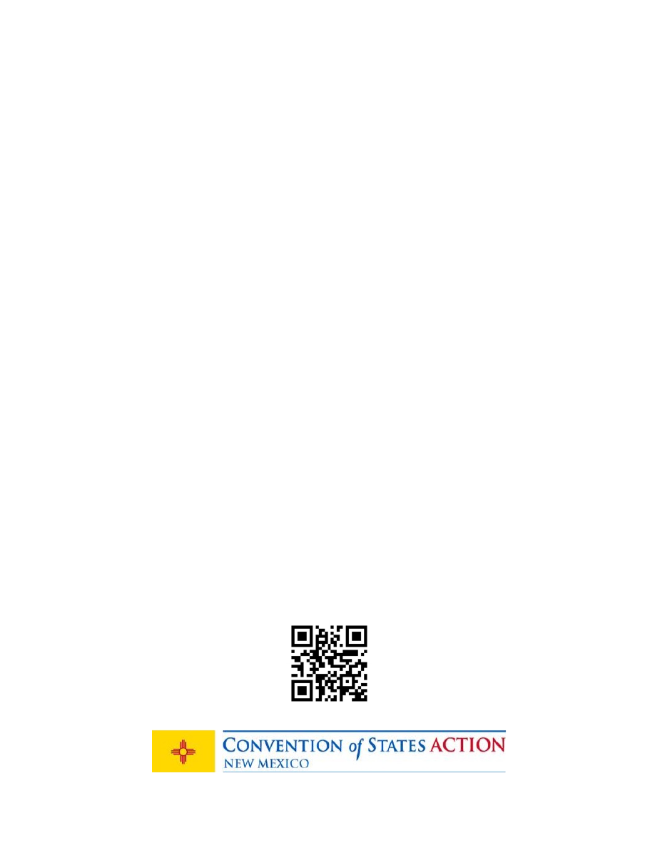 ![]() PROPOSE TERM LIMITS IMPOSE FISCAL RESTRAINTS REDUCE THE SIZE AND POWER OF THE FEDERAL GOVERNMENT TO BE INTRODUCED IN THE 2024 NEW MEXICO LEGISLATURE: WHEREAS, the Governor of New Mexico is constitutionally required to submit a balanced budget, and the New Mexico Legislature is constitutionally required to pass a balanced budget, thereby preserving the State's financial solvency and integrity; and WHEREAS, meanwhile, the federal government continues to accrue enormous increases in the national debt, obligating New Mexico's citizens and future generations to insurmountable financial burdens; and WHEREAS, otherwise necessary federal regulatory protections become costly, unworkable, and oppressive when congested by an excess of unnecessary and obsolete rules and mandates, causing hardships on New Mexico's local governments, small businesses, and working families; and WHEREAS, a professionalized congress, whose members are more subject to the power of organized pressure groups than to the interests of the majority of the citizens, fails in its service to those citizens and proves unresponsive to fiscal excess and government over-reach; and WHEREAS, constitutionally applied mechanisms for establishing sound requirements for accountability of federal spending, regulation, and public service are necessary to the well- being of the people; NOW, THEREFORE, BE IT RESOLVED BY THE LEGISLATURE OF THE STATE OF NEW MEXICO that the legislature of New Mexico hereby applies to Congress, under the provisions of Article V of the Constitution of the United States, for the calling of a convention of the states limited to proposing amendments to the Constitution of the United States to [1] impose fiscal restraints on the federal government, [2] limit the power and jurisdiction of the federal government, and [3] limit the terms of office for its officials and for Members of Congress, and BE IT FURTHER RESOLVED that the New Mexico secretary of state is hereby directed to transmit copies of this application to the President and Secretary of the United States Senate and to the Speaker and Clerk of the United States House of Representatives, and BE IT FURTHER RESOLVED that this application constitutes a continuing application in accordance with Article V of the Constitution of the United States until the legislatures of at least two-thirds of the several states have made applications on the same subject. IF YOU AGREE, SCAN HERE TO SIGN THE PETITION |