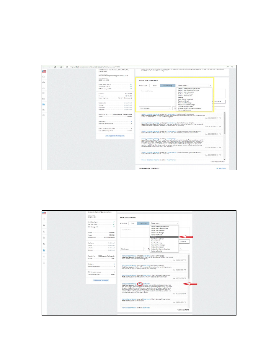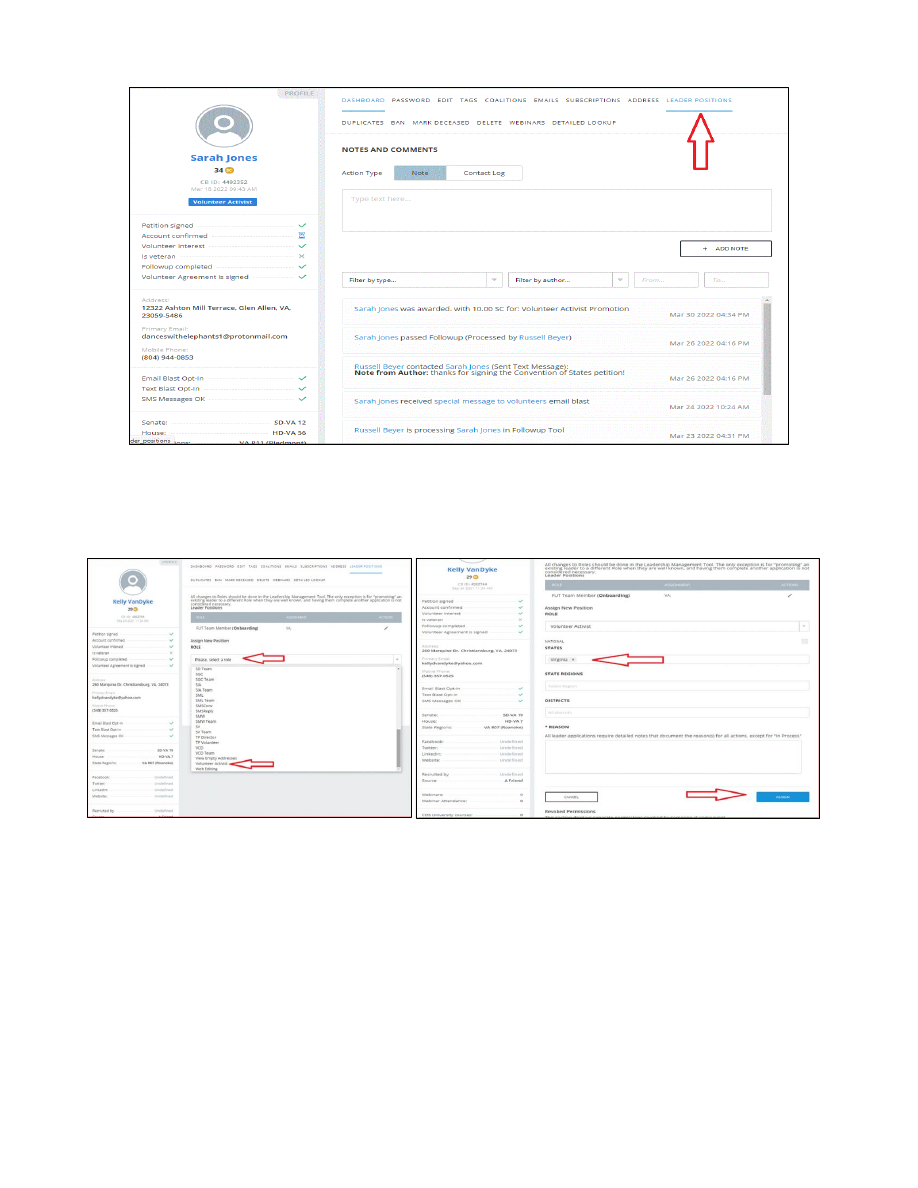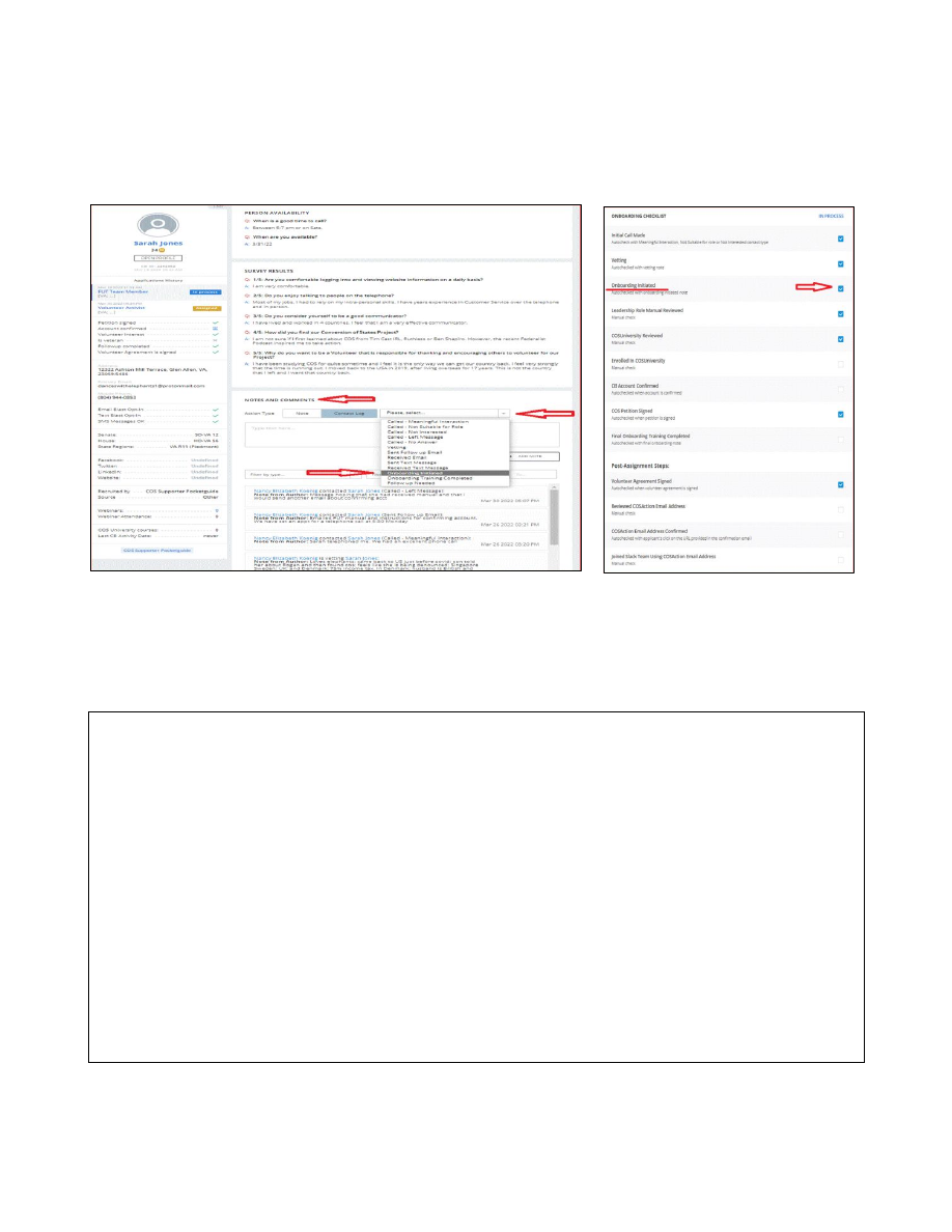 ![]() New Applicant On-boarding • Go to your dashboard and verify that there are volunteers in LMT • In LMT, click on applicant's name ![]() • Initiate the onboarding by looking under Notes and Comments on the right and clicking on Contact Log. A menu will come down. Towards the bottom, click on Initiate Onboarding . Fill in the box with e.g., Attempting phone call . Click on Add Note . The applicant will now be assigned to you and the 3 rd box in the Checklist with automatically be checked off. • On the applicant’s profile, notice if the Account confirmed box and Volunteer Agreement is signed box are checked off. Both of these needs to checked before applicant can be on boarded. When you contact the applicant, alert her/him to this fact and send an email with instructions on how to fix the technical issues. Instructions for correcting technical issues: In order to process an application, a confirmed account is required. The attachment linked below has instructions. Please DO NOT have them sign the petition again because that will create another profile which will cause difficulties. Have the applicant sign in using the email address the message was sent and create a password. S/he will receive an email to confirm the account. Click on the link below for the document that shows you what to do. https://conventionofstates.com/files/create-and-confirm-cos-account-step-by-step Secondly, please have applicant look for an email with a COS banner asking her/him to sign the volunteer agreement electronically. The instructions are inside the email. It might have gone to spam, so please have applicant look there if they do not see it in the inbox. ![]() • Click on Contact Log and attempt to call the applicant. Choose the appropriate title from the menu ( Meaningful Interaction, left VM , etc.) and record notes on conversation or message left. Click on Add Note. If you were able to have a conversation ( Meaningful Interaction ) the box on the checklist will have checked off and the applicant will move on the LMT to In Process . Before Meaningful Interaction for a DC applicant, the applicant will remain in Open Applicants. • If/When you have a conversation with the applicant, some of the conversation should be recorded under Vetting . After clicking Add Note , move to Vetting from the menu. Vetting is more personal information about the applicant e.g., place of work or from what work s/he retired; family; personality and temperament . The applicant will never be able to see these notes, but state leadership will. ![]() • If you are unable to reach the person by phone, send a text of thanks and ask for a good time to speak with her/him. Of course, identify yourself and give your COS title. The application includes the question of a good time to speak, but it is not always answered, or the person is not always available during that time. • Make 3 attempts . I usually send a final text asking if s/he is still interested and then reject the applicant if I do not hear from her/him. • Copy and paste in the application profile any text that you send or receive. • After having spoken with the applicant and s/he sounds like a good fit, assign the task of completing all 4 public courses. Give the expectation of a two-week completion. Ask for confirmation of completion. • Sample email: Thank you so very much for volunteering. The next task is to register at COSUniversity cosuniversity.com . There are 4 videos open to the public and 17 videos for those with a role. The best way is to go to conventionofstates.com. In the upper right-hand corner, sign in with your email address and password. Then go all the way to the very bottom of the webpage where in the second column, you’ll find COSUniversity in tiny letters. Click on that. When you are at the above site, go to My Courses in the top bar. The program will keep track of where you are in viewing. In that way, you can stop and start at will. Within the next two weeks, we hope that you’ll have had the opportunity to take these Courses: GOV 100 Constitutional Literacy DC 100 District Captain Leadership Training COS 200 Responding to Opposition COS 100 Introduction to Convention of States VOL 100 Introduction to Volunteer Each of the above Courses has Modules divided into several Units. The Units are usually about 7 minutes each. At first, the number looks daunting, but I have found each very engaging and informative. Thank goodness, there is neither a daily quiz, nor a final exam inquirers, you’ll find that you remember what you learned from the courses. Please let me know when you have completed the courses. Again, thank you so very much. We look forward to having you on the team. ![]() • Check up on progress by going to the Tool box on the left column of the dashboard. Click on COSU. Find the applicant’s name. Click there to see course progress. Text applicant with encouragement or reminder. After 3 attempts for progress send text saying that you will put the application on hold and ask for notification if applicant wants to re-engage. Reject applicant for not following through on tasks. • When you have received confirmation of completion of the 4 public COSU courses, send the latest edition of the DC manual (currently 2021), assign the Volunteer Activist role and TP by clicking Open Profile found under applicant’s name. • On the right top, click on Leadership Positions . ![]() • Click on the rectangle under Role and select Volunteer Activist . Click below to add Virginia in the States field. Fill in box with e.g., assigning as VolAct, and click assign . Repeat actions to assign as TP. RC sends email to applicant with 3 tasks: 1. Read DC manual and have them send you a photo or scan of the signed final page of the manual. (Send this document to applicant with instructions for how to sign in for first time on Citizen Builder). 2. Confirm cosaction account. Once the cosaction acct is confirmed invite her/him to SLACK. 3. A
