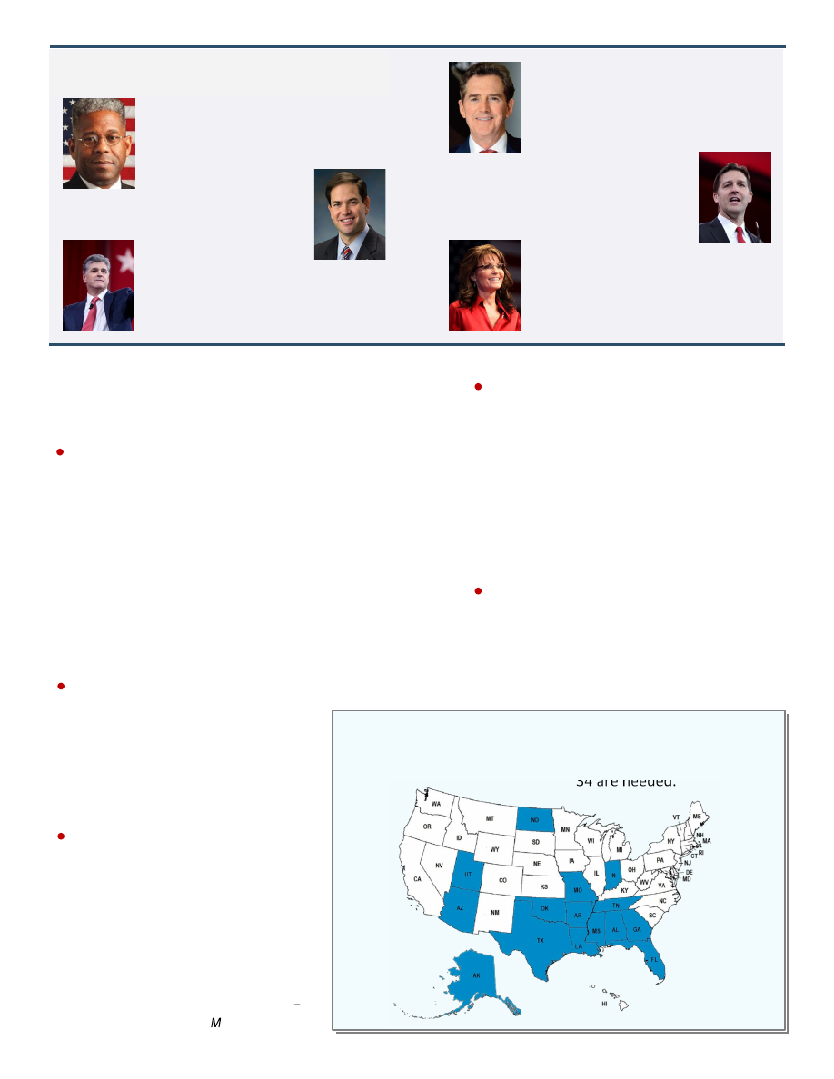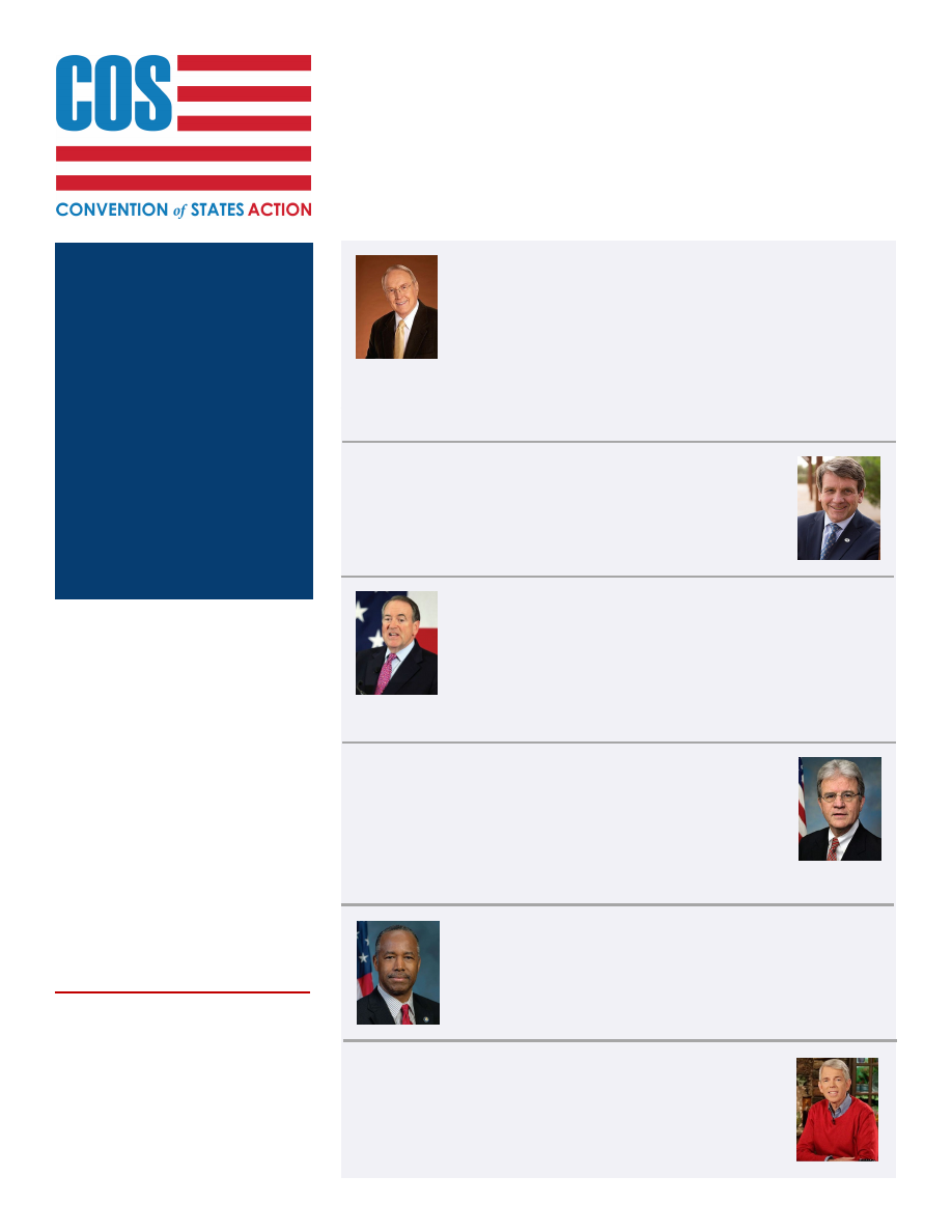 ![]() The Convention of States Project advocates using Ar cle V of the U.S. Cons tu on to: • Limit the power and jurisdic on of the federal government • Impose fiscal restraints on the federal government • Limit the terms of office for federal officials and members of Congress Join these Christian leaders calling for a Convention of States Dr. James Dobson, Family Talk “ The genius of our Founding Fathers is on full display in the Conven on of the States Ar cle V process, which empowers We the People at a local level to con nue preserving and protec ng the fundamental rights of every individual and keeping America’s limited government In check. Let us raise our collec ve voices and challenge the entrenched powers in Washington by finally, and for the first me, calling for a Conven on of the States.” Michael Farris, Alliance Defending Freedom “Only a Conven on of States will give us effec ve solu ons to the abuse of power in Washington, D.C. It is our moral obliga- on to protect liberty for ourselves and our posterity.” David Barton, WallBuilders “I urge you to support all of the Cons tu on, and thus the efforts of the Conven on of States to pass their extremely well -thought- out and strategic legisla on in your home state and thus join us in a call to restore our cons tu onal republic.” Mike Huckabee, former governor of Arkansas “My long me friend, Michael Farris—who is an excellent cons tu- onal li gator and professor—has joined with Mark Meckler and Citizens for Self-Governance to actually bring [a Convention of States] into reality. I have reviewed their plan and it is both innova ve and realistic. I urge you to join me in supporting the Convention of States Project.” Dr. Tom Coburn, former U.S. Sen. from Oklahoma “There is not enough poli cal will in Washington to fix the real problems facing the country. It's me for the people to take back their country. The plan put forth by Conven on of States is a great way to do just that by using the process the founders gave us for reining in the federal government.” “The ultimate test of a moral society is the kind of world it leaves for its children.” — Dietrich Bonhoeffer Dr. Ben Carson, HUD Secretary “[O]ur founders knew that there would probably come a me when you might have to make some adjustments to the Cons tu on.” Sign the pe on and join the team Conven onOfStates.com/ chris an-leaders ![]() Marco Rubio, U.S. Senator from Florida Lt. Col. Allen West, former Congressman from Florida These pastors and leaders are working to save our Republic… “ I believe that our view of govern- ment has been turned upside down…The Ar cle V Conven on of States the only peaceful method whereby our cons tu onal republic might be restored. Everyone who loves liberty should sign on!” — Paul Becker, Tennessee volunteer Pastor, Lutheran Church issouri Synod “I believe that God cares about poli cs, that the throne is established by righteousness, and that religious lead- ers should not be afraid to discuss poli cs even from the pulpit. I believe that an Ar cle V Conven on of States is the only cons tu onally authorized remedy to save our na on and defeat an out of control tyrannical government that is a8emp ng to destroy our freedom of religion rather than protect it.” — Lyle Hill, Tennessee State Director for Grassroots Pastor, nondenomina onal church Jim DeMint, former U.S. Senator from South Carolina More Endorsers… Ben Sasse, U.S. Senator from Nebraska Sarah Palin, former governor of Alaska “It’s me for all intercessors to take their places on the wall and rebuild the broken ruins.” — Coraleen Stuart, Virginia TelePatriot Volunteer Prayer elder “ Our once - great Republic is on the brink, and we are in danger of losing it. Fortunately, the Founders saw this coming, and Ar cle V gives ‘we the people’ the only way to rescue it. I pray that God will inspire millions of patriots to take up this cause.” — John Aukerman, Indiana Media Liaison Pastor and seminary professor, Church of God (Anderson, Indiana) Sean Hannity, TV and radio personality Progress Map These 15 states have called for a Conven on of States* — “Volunteering for the Conven on of States movement is a great way to ‘do poli cs chris anly.’” — Sharon Correll, Texas State Communica ons Coordinator Missionary and Colson Fellow 34 are needed. *status as of April 2019 |