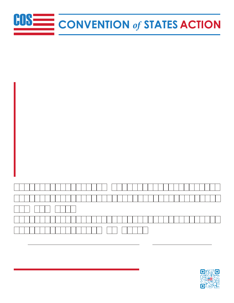 ![]() END WASHINGTON’S OVERREACH Washington, D.C., will never voluntarily relinquish power. Article V of the Constitution offers the single best remedy for the crisis our nation is facing. The most important thing you can do to be a part of the solution is to tell your elected state legislators your position. Please act now and sign the petition below. Thank you for your commitment to restore constitutional government. Dear [State Representative], Almost everyone knows that our federal government is on a dangerous course. The unsustainable debt, combined with crushing regulations on states and business, is a recipe for disaster. What is less known is that the Founders gave state legislatures the power to act as a final check on abuses of power in Washington, D.C. Article V of the U.S. Constitution authorizes the state legislatures to call a convention for proposing needed amendments to the Constitution. The Convention of States Project seeks to call an Article V convention to propose only amendments that would impose fiscal restraints on the federal government, limit its power and jurisdiction, and impose term limits on its officials and members of Congress. I support this approach. I want our state to be one of the necessary 34 states to pass a resolution calling for this kind of Article V Convention. You can find a copy of the model resolution and the Article V Pocket Guide (which explains the process and answers many questions) here: http://www.conventionofstates.com/handbook_pdf I ask that you support the Convention of States Project and consider becoming a co-sponsor of the resolution. Please respond to my request by informing the national COS team of your position, or sending them any questions you may have: [email protected] or (540) 441-7227. Thank you for your service to the people of our district. Respectfully, First Name* Email* Phone Address* City* State* Zip* Last Name* ☐ Send me text message updates Signed Date ☐ Yes, I would like to get more involved with Convention of States! ☐ Do not send me email updates ☐ I am a U.S. Veteran. Please mail completed petition to: Convention of States, 5850 San Felipe Street, Suite 580A, Houston, TX 77057 PEND LEARN ABOUT ARTICLE V The Founders gave us Article Vin the Constitution for a reason. Learn from leading thinkers and Constitutional scholars at conventionofstates.com/resources |