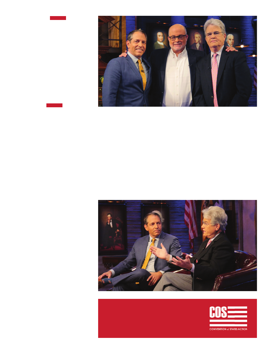 ![]() T he earliest ‘meeting of the minds’ to discuss Article V of the Constitution was when the Constitutional Convention met in Philadelphia in 1787. In 2018, a similar meeting took place when Convention of States President Mark Meckler and former U.S. Senator Tom Coburn appeared on Fox News Life, Liberty & Levin with long- time Article V Convention of States advocate Mark Levin. For the full hour, these political thought leaders discussed the state of American politics and how to stop an overreaching government bent on our nation’s destruction. Like the Founders, they unanimously believe a Convention of States is essential to halting government growth and tyranny. “If you dig in, what you fi nd historically is we have created a structural problem. It’s not a personnel issue,” Meckler said, “We’ve actually broken the structure of our government.” Sen. Coburn tried to correct the nation’s course in the Senate for ten years concluding, “What’s wrong with our country isn’t going to get fi xed by the career politicians that are in the Senate or the House. So I left looking for another method with which we can cheat history and not be a republic that falls. We need the decision-making process to be closer to the people instead of unelected bureaucrats. We have a solution that will actually solve this great problem.” Thankfully, the solution can be found in Article V of the Constitution, which gives the people, acting through their state legislatures, power to call a Convention of States for the purpose of proposing amendments to restrain government tyranny. Mark Levin pointed out, “Today the Supreme Court amends the Constitution, Congress passes MARK LEVIN FEATURES CONVENTION OF STATES FOR A FULL HOUR ON LIFE, LIBERTY & LEVIN “We need the decision-making process to be closer to the people instead of unelected bureaucrats. We have a solution that will actually solve this great problem.” ![]() statues that amend the Constitution. [Article V of the Constitution] is a legitimate way to address eff orts to act outside the Constitution boundaries.” Meckler explained, “This is, by the way, why the left opposes us so much because they have been doing this for over a century. They amend through the courts. Over 250 [leftist groups] signed a press release together attacking [a Convention of States] saying… this is intended to reverse 115 years of progressivism. “And we say, ‘yes, it is!’ ” This leftist opposition can’t stop the growing momentum of the Convention of States, which boasts over 3.5 million supporters across the political spectrum. “This is a fi ght about who decides - Washington, D.C., versus the people. The Framers answered that question very clearly at the beginning of the Constitution in big bold calligraphy, ‘We, the people decide,’ ” said Meckler. Sen. Coburn added, “The American spirit is about liberty and freedom. This movement is about restoring decision making to the states. It’s about honoring the vision of our Founders that we will decide as sovereign citizens of the state. We give the power to the government. They don’t give it to us. We have the right to maintain and focus on our own freedom and our own decisions within our own states.” This watershed interview brought awareness of the Convention “If you dig in, what you find historically is we have created a structural problem. It’s not a personnel issue,” Meckler said, “We’ve actually broken the structure of our government.” of States Project to a new level, dispelled myths, and ended with Levin’s powerful admonition: “The American people will decide their own fate. That’s the bottom line, and you two gentleman are among the leaders of a movement that is showing them the way to do it. Is there a solution?” he asked. “Yes. Embrace the Constitution.” conventionofstates.com/take_action info@conventi onofstates.com Save America’s Future: 512-487-5525 • |