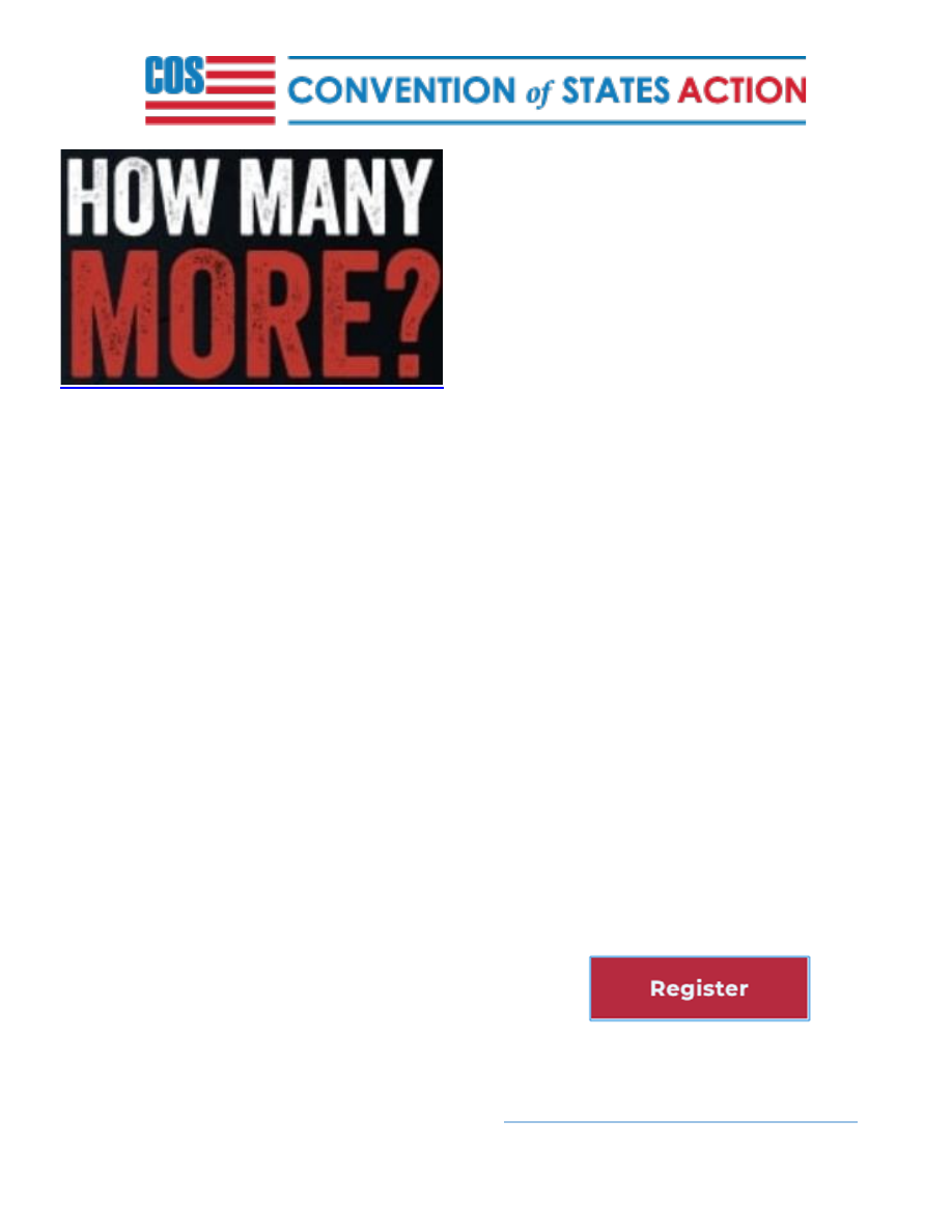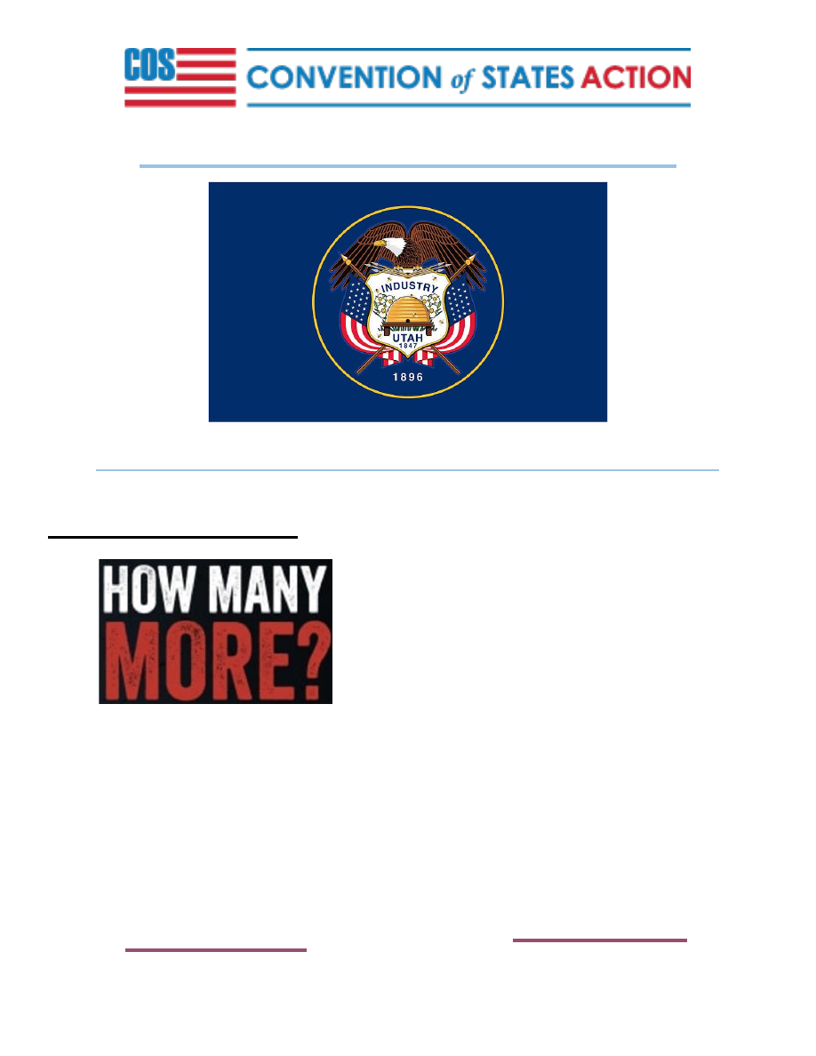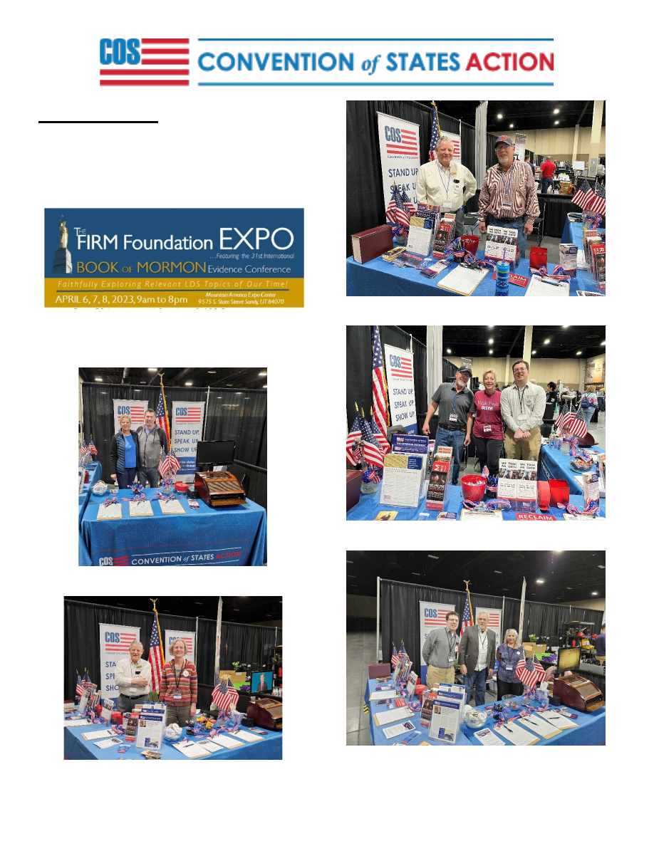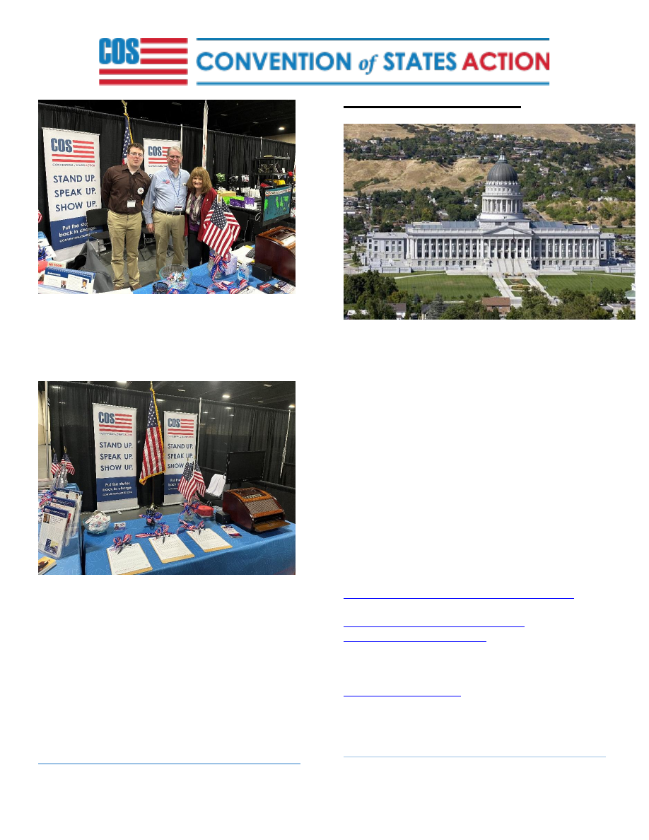 ![]() Page 1 of 7 April 2023 Utah Pioneer Patriots Newsletter Let’s Go Team Utah!! ______________________________________________________________________ COS National Update: Huge National Event “How Many More”- Please join us - Date: Saturday, April 29 th Time: 1:00 to 4:00 pm CT Location: Austin, Texas Capitol – 1100 Congress Avenue., Austin, Texas 78701 **MORE INFO** ** ** THE TIME FOR ACTION IS NOW. A RALLY TO DEMAND ACTION We need to fix our Southern border!!! On April 29, we will assemble at the Texas Capitol in Austin to demand that our elected leaders take action to end the humanitarian crisis at our southern border. Our elected leaders have failed to secure the border and repel the invasion. The failure of our current border policies makes every American complicit in the spread of human misery. We will no longer accept the erosion of America or its values by allowing the humanitarian crisis at our southern border to continue. **RSVP NOW** ** ** ![]() Page 2 of 7 Now, if we don’t stop it, we are all complicit in what is a massive humanitarian and national security crisis. How many more innocent people must die? How many more children must be sold into sexual slavery? How many more migrants must be raped, drowned, and murdered? How many more billions of dollars will we allow Mexican cartels to earn? How far into the heartland of our nation must we allow the cartels to spread? We must act NOW to repel this unprecedented invasion. Our nation’s leaders have failed to act, so now it’s up to us — the American people — to demand action. Convention of States Action has the largest organization of liberty-loving grassroots activists in the United States. Although our primary objective is to pass the COS Resolution and call an Article V Convention, we simply cannot sit by and watch as mass genocide sweeps across our southern border. If we do nothing, we are complicit. That’s why our team of activists are taking bold action. As one of our supporters, we wanted you to hear about this from us – COS - before you start to see it in the news. W e’re excited to announce that Rep. Matt Schaefer has officially filed a bill in the Texas legislature that would establish a Texas Border Defense Unit to defend US citizens from cartels and help end the humanitarian and national security crisis on the southern border. Imagine the impact of Texas passing this ground-breaking legislation. Think about if our southern states step up and do what the federal government has failed to — secure the border against an invasion of dangerous cartels… Cartels that are known to kidnap and repeatedly rape eleven and twelve year old girls, only to then sell them into a life of slavery. Not on our watch. Not in our America. The road to victory won’t be easy. But this is a battle we MUST fight with everything we’ve got. If not, can we truly call ourselves “the land of the free and home of the brave?” Together we will stand for liberty and justice, Mark Meckler President Convention of States Action __________________________________ ![]() Page 3 of 7 Utah Update: COS Utah Team had a booth at: The Firm Foundation Expo April 6, 7, & 8 2023 - Mountain America Expo Center We had some great COS volunteers come out to help us at the COS booth for this conference. Our participation in this conference was under the topic of The Constitution. Debra & Dave Warnas Dean Klingler and Heidi McDonald Dean Klingler and Scott Pratt Scott Pratt, Debra, and James Beer James Beer, Bill Misrasi, and Barbara Metaxas ![]() Page 4 of 7 James Beer, Bill Pressgrove and Lara Christensen Bill Pressgrove did a nice COS presentation in one of the conference classrooms on Saturday afternoon. Thank you to all the COS volunteers that were there to help out! And sorry to the ones we didn ’t get pictures of but we want to recognize you too! Thank you again!!! Kristin Small Mary Wenner Julie Olsen Bill Corless Nichole Klosowiak Maurine Miles _____________________________________ Legislative Liaison: Be sure to contact your Legislators - Elected officials represent our community and our interests, so let them know who you are and what you care about! Take time to introduce yourself and your organization to public officials serving your community – including both federal and state representatives. Make an appointment and discuss: 1- Their stance on Convention of States. 2- What Bills they are working on that COS could possibly get behind and support. 3- Notify your District Captain, or Regional Captain, or Legislative Liaison with the results after contacting them. Contact Your Government Official| | Utah.gov Contact the House| | Utah House of \\ Representatives (utleg.gov) Utah State Legislative District Maps (Expires January 1, 2023) District Map (utah.gov) by Nichole Klosowiak _____________________________________ ![]() Page 5 of 7 Utah Veterans Update: Welcome to all our Veterans! Thank you for your service to all our citizens and our beloved country! Rodney Huckleberry National Veterans Coalition Coordinator rhuckleberry@cosaction.com < > 314-709-0327 _____________________________________ Monthly Spotlight: Name: Heidi McDonald COS Title: Volunteer Activist City raised in: Eureka, CA. City current living in: Logan, Utah Favorite Hobbies: Reading, learning do-it- yourself skills, being active outdoors What brought you to COS (Your Why): I found out about COS from my daughter, who lives in Pennsylvania and is more political than I am. I was really excited by the idea of making a positive, constructive, and unifying change, rather than just siding with a particular political party and/or contributing to the contention. Inspirational thought: “A new commandment I give unto you, That ye love one another, as I have loved you”, John 13:34. Also, “All you need is love. But a little chocolate now and then doesn't hurt.” (Charles Schultz) More about You: I home school my 9-year- old son who has autism, I have a bachelor