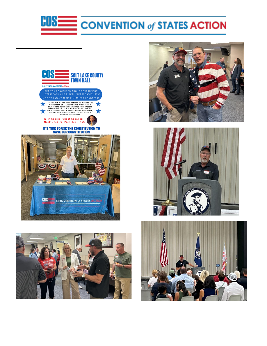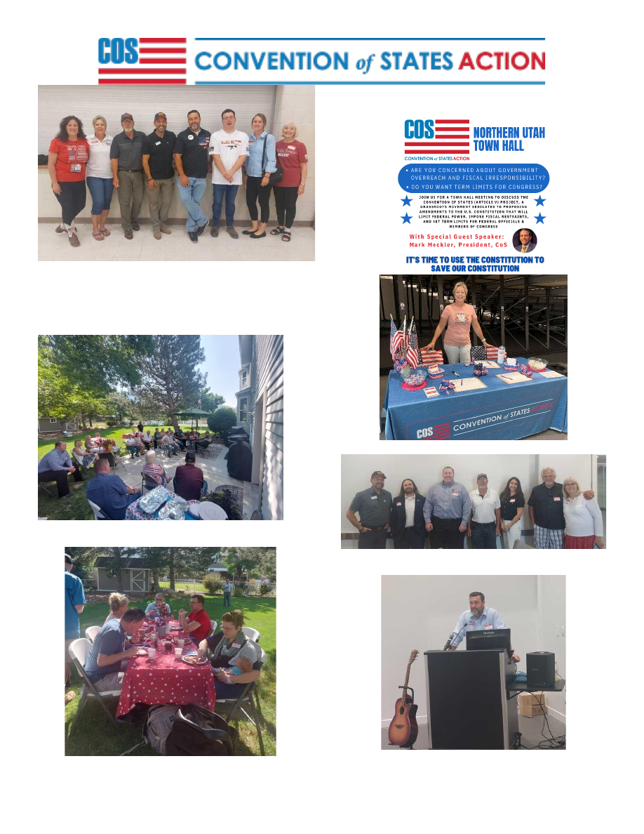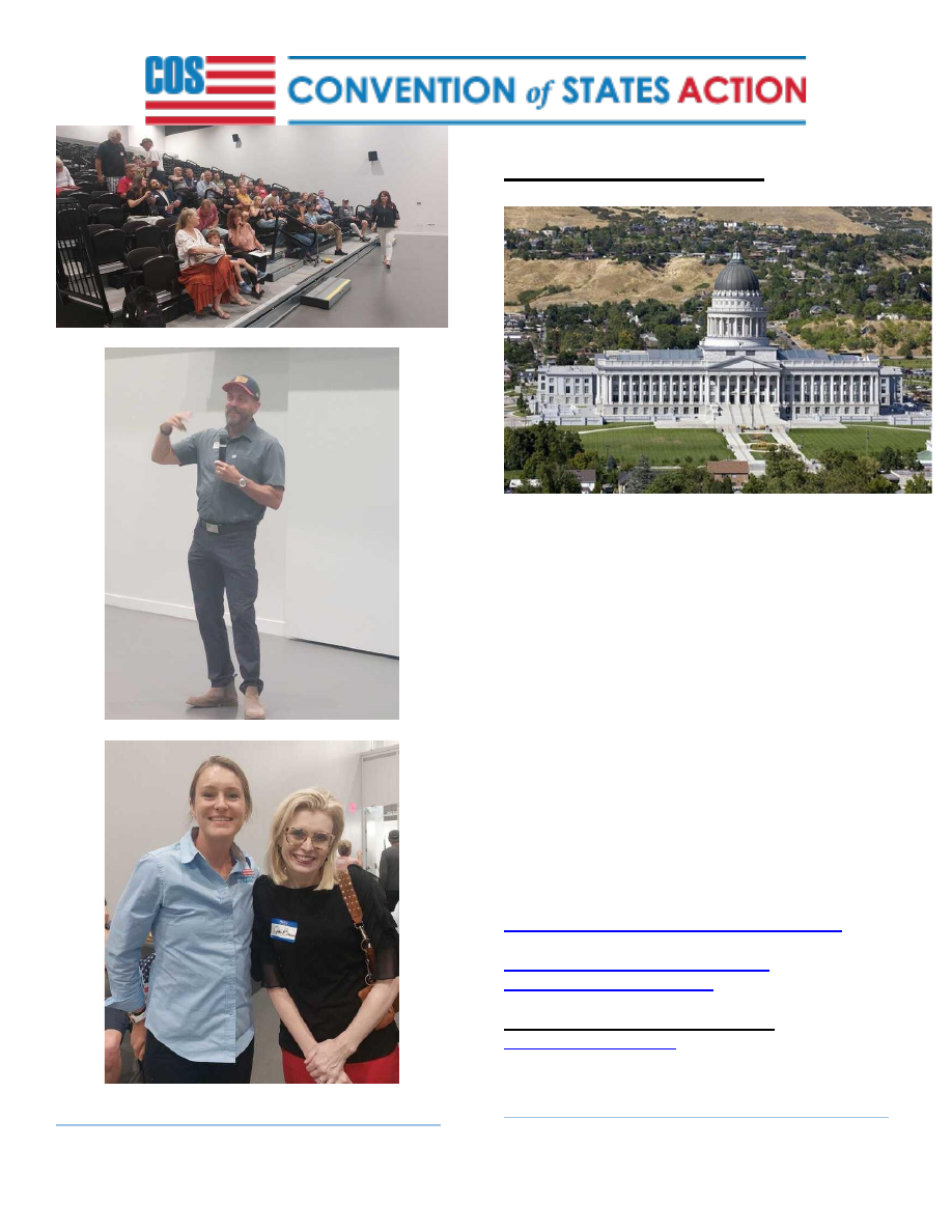 ![]() Page 1 of 8 August 2024 Utah Pioneer Patriots Newsletter Let’s Go Team Utah!! ______________________________________________________________________ COS National Update: Premiering COS @ Home this month – Jonathan Viaud will be interviewing Georgetown University Law Center professor Randy E. Barnett as our featured guest. Date: Wednesday, August 7 th Time: 6:00 pm MTN, 8:00 pm. ET **Register For This Episode of COS At Home** The conversation with Professor Barnett will highlight the grassroots' work across the country and how we can use current events to maintain this focus. In addition to the interview, we will delve into Professor Barnett’s extensive work, including hundreds of books, articles, reviews, and op- eds on the Constitution. These resources are invaluable for COS supporters seeking to deepen their understanding and enhance their advocacy. _____________________________________ COS Nat ’l Last Month: Former President Donald Trump, who officially clinched his party’s 2024 presidential nomination, has chosen Senator, best-selling author, and Convention of States supporter J.D. Vance as his running mate. This is pivotal as the swing state of Ohio is still mulling support for our resolution. This is a big win for COS as now one of our supporters is in line to be the second most prominent politician in Washington, D.C. **Read More Here.** ** ** _____________________________________ ![]() Page 2 of 8 Utah August 2024 Update: Please join us for the first – “Just Say KNOW” 6-week classes Hosted by Utah - Convention of States In conjunction with: Patriot Academy Our Utah COS friends are hosting this class for their friends and supporters and have invited others to join them Live and On-line : Date: Thursday, August 15, 2024 Time: 7:00 to 9:00 pm MT Location: In-Person – Larry Miller Sandy Campus, 9690 South 300 West, Sandy Third floor, The Mill, Classroom 330 Zoom link: Information on how to attend this event On-line will be emailed to you after registration. Save The Date and time for this 6-week course (every Thursday evening at 7:00 pm MT) Starting August 15, 2024 August 22, 2024 August 29, 2024 September 5, 2024 September 12, 2024 September 19, 2024 In this 6 week course we will learn the 6 “ KNOW ” to restore and maintain the Constitutional Balance that secures our rights. Here's the best part … if we will study and understand our role and the limits, divisions and balance of governing powers in our exceptional structure of American government, working together we can do this indispensable job in as little as 5 MINUTES A WEEK! Join us for this 6-week class, as we will write these laws of American self-government on our hearts and in our minds, and build Impact Councils throughout our States to restore and “secure the blessings of liberty to ourselves and our posterity.” Click the link to register for these classes: https:%%//%%www.patriotacademy.com/coach/\\ register/8742 This event is hosted by Ken Ivory in conjuntion with COS Utah. Please contact [email protected] or (801) 694-8380 with any questions you may have. Or contact: Scott 801-918-9238, Mary 801- 518-2290, or Debra 801-971-4534. We look forward to seeing you at the classes. _____________________________________ ![]() Page 3 of 8 COS Utah Last Month : We had great events with Mark Meckler, COS President visiting our beautiful state of Utah. Monday, July 8, 2024 - Evening Welcome to the SL County Town Hall – Debra Warnas. VIP Meet & Greet with Mark Meckler and COS Utah Team VIP Meet & Greet with Mark Meckler and Ken Ivory. Scott Pratt, State Director and SL County MC. Mark Meckler visiting with the great audience. We had a wonderful evening of patriotic discussions, music and prayer. ![]() Page 4 of 8 Some of COS Utah Team – Mary Wenner, Debra Warnas, Scott Pratt, Mark Meckler , Sean McKenzie, James Beer, Nichole Klosowiak., and Maurine Miles. Tuesday, July 9, 2024 - Breakfast Scott Pratt, State Director beautiful backyard and some of COS Utah Team with Mark Meckler. Some of COS Utah Team in Scott Pratt ’s backyard. Tuesday, July 9, 2024 - Evening Welcome to the Roy Town Hall – Debra Warnas. Mark Meckler Tim Jiminez, Quinn Kotter, Scott Pratt, guest, Bill Misrasi, and Candice Daly. Sean McKenzie, Regional Captain and Roy MC. ![]() Page 5 of 8 Roy Library audience for Mark Meckler. Mark Meckler visiting with Roy Library audience. Nichole Klosowiak and Jen Brown _____________________________________ Legislative Liaison: Be sure to contact your Legislators – YOU ARE THE BOSS!! Act like it!!! Elected officials represent our community and our interests, so let them know who you are and what you care about! Take time to introduce yourself and your organization to public officials serving your community – including both federal and state representatives. Make an appointment and discuss: 1- Their stance on Convention of States. 2- What Bills they are working on that COS could possibly get behind and support. 3- Notify your District Captain, or Regional Captain, or Legislative Liaison with the results after contacting them. Contact Your Government Official| | Utah.gov Contact the House | Utah House of \\ Representatives (utleg.gov) Utah State Legislative District Maps District Map (utah.gov) by Nichole Klosowiak Legislative Liaison Utah _____________________________________ ![]() Page 6 of 8 Message from State Director: A BIG Thank you to all our Team members, volunteers, and supporters that made the Mark Meckler visit to Utah a huge success! Now how do we carry on from there? On a hot summer morning - for just a few minutes the flag on my patio unfurled and waved on the breeze - the Universe was reminding me that we, as freedom loving citizens of this great Republic, do not have the luxury of giving in to discouragement. Not even when the darkness seems to be closing in all around. We have been given A Call to muster all the courage and strength we possess, and alongside our brothers 