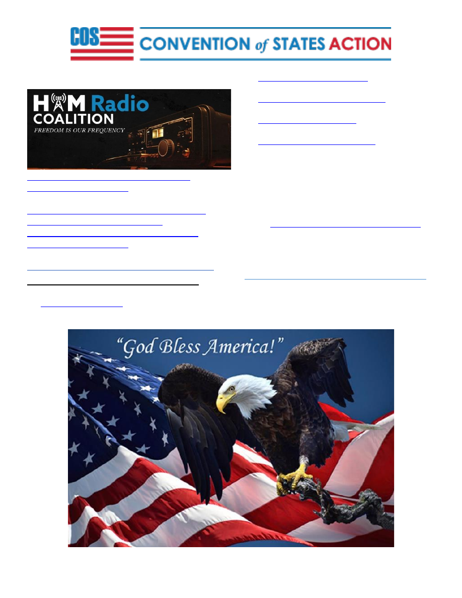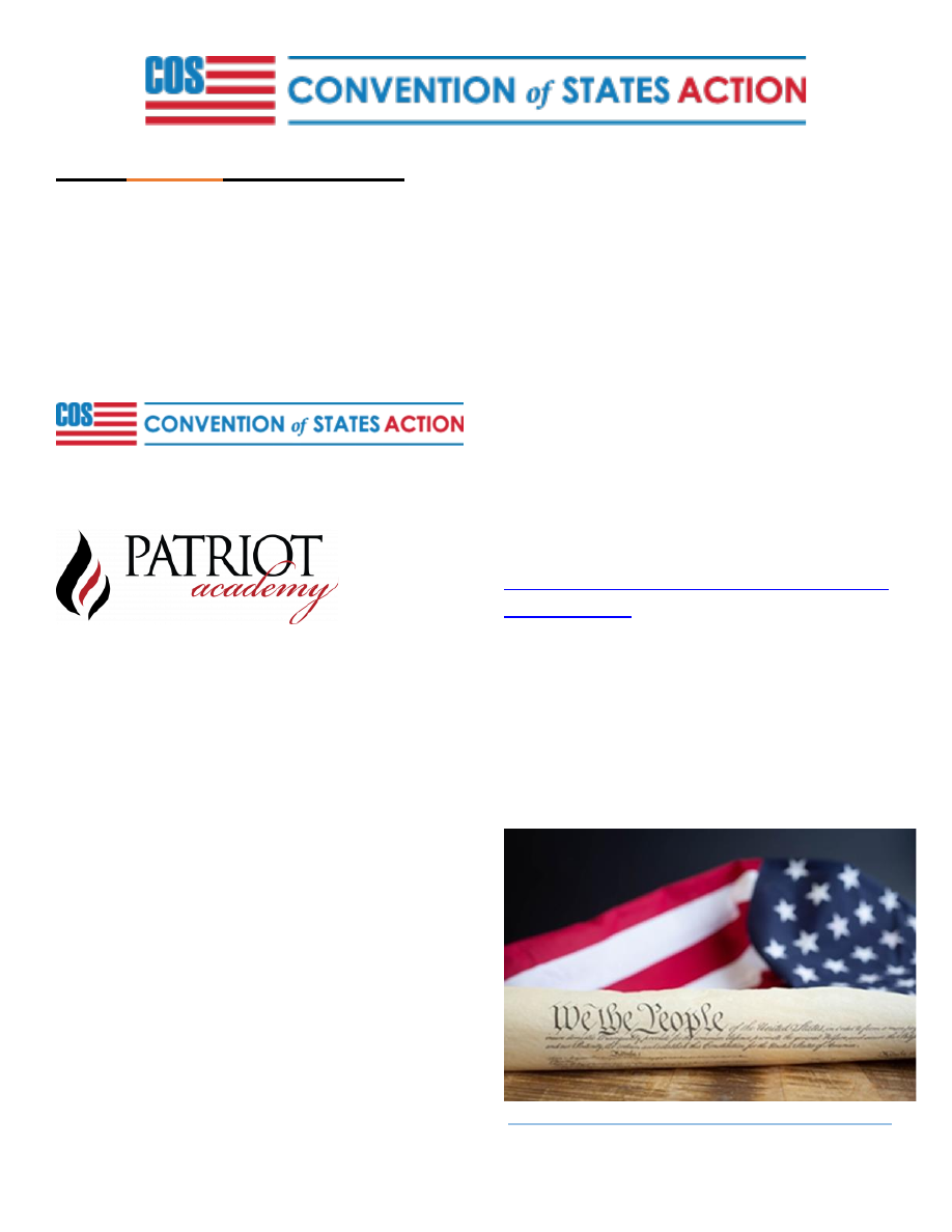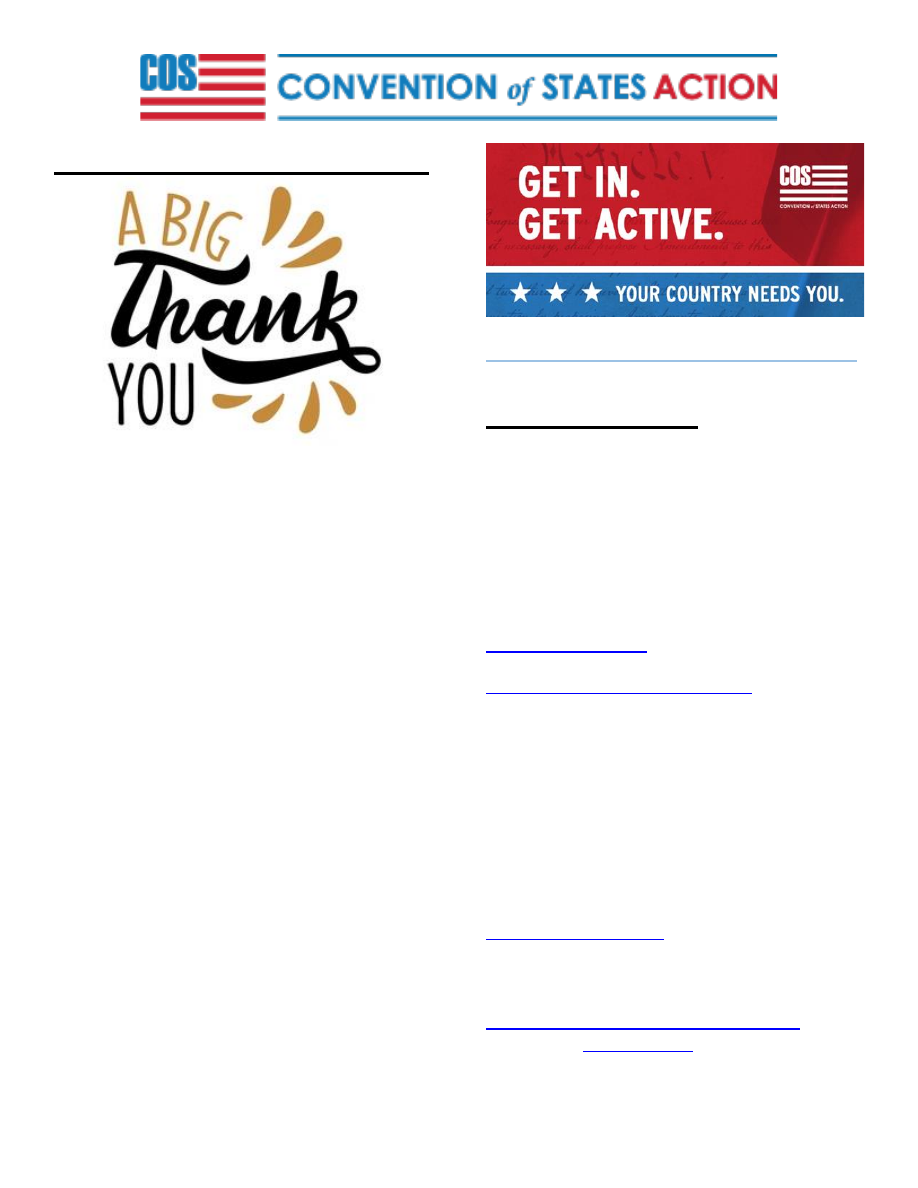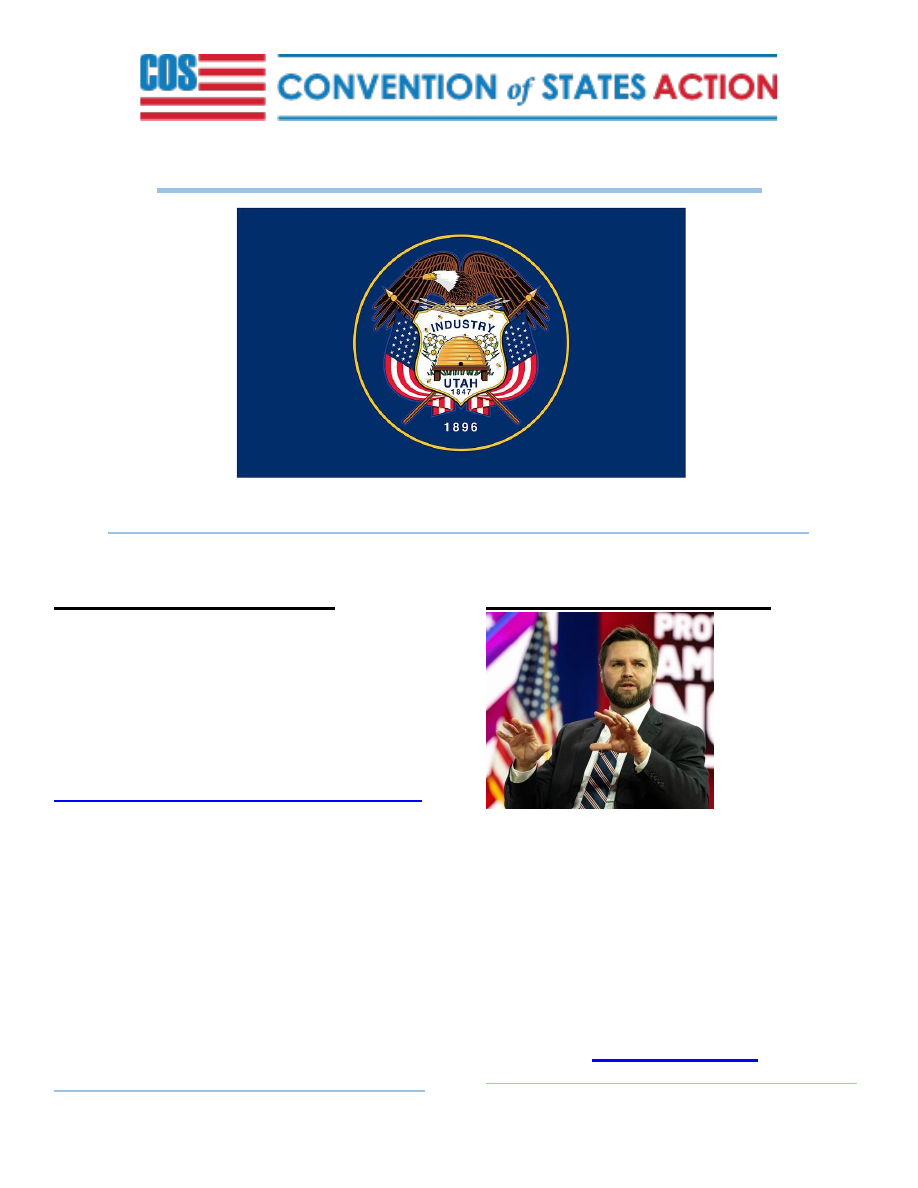 ![]() Page 1 of 8 August 2024 Utah Pioneer Patriots Newsletter Let’s Go Team Utah!! ______________________________________________________________________ COS National Update: Premiering COS @ Home this month – Jonathan Viaud will be interviewing Georgetown University Law Center professor Randy E. Barnett as our featured guest. Date: Wednesday, August 7 th Time: 6:00 pm MTN, 8:00 pm. ET **Register For This Episode of COS At Home** The conversation with Professor Barnett will highlight the grassroots' work across the country and how we can use current events to maintain this focus. In addition to the interview, we will delve into Professor Barnett’s extensive work, including hundreds of books, articles, reviews, and op- eds on the Constitution. These resources are invaluable for COS supporters seeking to deepen their understanding and enhance their advocacy. _____________________________________ COS Nat ’l Last Month: Former President Donald Trump, who officially clinched his party’s 2024 presidential nomination, has chosen Senator, best-selling author, and Convention of States supporter J.D. Vance as his running mate. This is pivotal as the swing state of Ohio is still mulling support for our resolution. This is a big win for COS as now one of our supporters is in line to be the second most prominent politician in Washington, D.C. **Read More Here.** ** ** _____________________________________ ![]() Page 2 of 8 Utah August 2024 Update: Please join us for the first – “Just Say KNOW” 6-week classes Hosted by Utah - Convention of States In conjunction with: Patriot Academy Our Utah COS friends are hosting this class for their friends and supporters and have invited others to join them Live and On-line : Date: Thursday, August 15, 2024 Time: 7:00 to 9:00 pm MT Location: In-Person – Larry Miller Sandy Campus, 9690 South 300 West, Sandy Third floor, The Mill, Classroom 330 Zoom link: Information on how to attend this event On-line will be emailed to you after registration. Save The Date and time for this 6-week course (every Thursday evening at 7:00 pm MT) Starting August 15, 2024 August 22, 2024 August 29, 2024 September 5, 2024 September 12, 2024 September 19, 2024 In this 6 week course we will learn the 6 “ KNOW ” to restore and maintain the Constitutional Balance that secures our rights. Here's the best part … if we will study and understand our role and the limits, divisions and balance of governing powers in our exceptional structure of American government, working together we can do this indispensable job in as little as 5 MINUTES A WEEK! Join us for this 6-week class, as we will write these laws of American self-government on our hearts and in our minds, and build Impact Councils throughout our States to restore and “secure the blessings of liberty to ourselves and our posterity.” Click the link to register for these classes: https:%%//%%www.patriotacademy.com/coach/\\ register/8742 This event is hosted by Ken Ivory in conjuntion with COS Utah. Please contact [email protected] or (801) 694-8380 with any questions you may have. Or contact: Scott 801-918-9238, Mary 801- 518-2290, or Debra 801-971-4534. We look forward to seeing you at the classes. _____________________________________ ![]() Page 3 of 8 COS Utah Last Month : We had great events with Mark Meckler, COS President visiting our beautiful state of Utah. Monday, July 8, 2024 - Evening Welcome to the SL County Town Hall – Debra Warnas. VIP Meet & Greet with Mark Meckler and COS Utah Team VIP Meet & Greet with Mark Meckler and Ken Ivory. Scott Pratt, State Director and SL County MC. Mark Meckler visiting with the great audience. We had a wonderful evening of patriotic discussions, music and prayer. ![]() Page 4 of 8 Some of COS Utah Team – Mary Wenner, Debra Warnas, Scott Pratt, Mark Meckler , Sean McKenzie, James Beer, Nichole Klosowiak., and Maurine Miles. Tuesday, July 9, 2024 - Breakfast Scott Pratt, State Director beautiful backyard and some of COS Utah Team with Mark Meckler. Some of COS Utah Team in Scott Pratt ’s backyard. Tuesday, July 9, 2024 - Evening Welcome to the Roy Town Hall – Debra Warnas. Mark Meckler Tim Jiminez, Quinn Kotter, Scott Pratt, guest, Bill Misrasi, and Candice Daly. Sean McKenzie, Regional Captain and Roy MC. ![]() Page 5 of 8 Roy Library audience for Mark Meckler. Mark Meckler visiting with Roy Library audience. Nichole Klosowiak and Jen Brown _____________________________________ Legislative Liaison: Be sure to contact your Legislators – YOU ARE THE BOSS!! Act like it!!! Elected officials represent our community and our interests, so let them know who you are and what you care about! Take time to introduce yourself and your organization to public officials serving your community – including both federal and state representatives. Make an appointment and discuss: 1- Their stance on Convention of States. 2- What Bills they are working on that COS could possibly get behind and support. 3- Notify your District Captain, or Regional Captain, or Legislative Liaison with the results after contacting them. Contact Your Government Official| | Utah.gov Contact the House | Utah House of \\ Representatives (utleg.gov) Utah State Legislative District Maps District Map (utah.gov) by Nichole Klosowiak Legislative Liaison Utah _____________________________________ ![]() Page 6 of 8 Message from State Director: A BIG Thank you to all our Team members, volunteers, and supporters that made the Mark Meckler visit to Utah a huge success! Now how do we carry on from there? On a hot summer morning - for just a few minutes the flag on my patio unfurled and waved on the breeze - the Universe was reminding me that we, as freedom loving citizens of this great Republic, do not have the luxury of giving in to discouragement. Not even when the darkness seems to be closing in all around. We have been given A Call to muster all the courage and strength we possess, and alongside our brothers 
