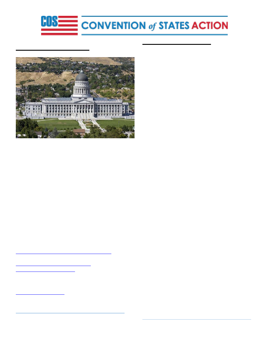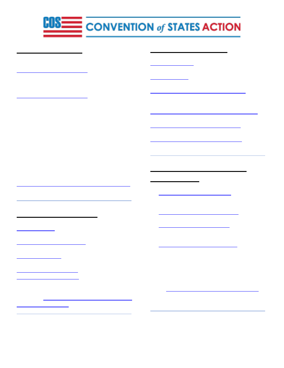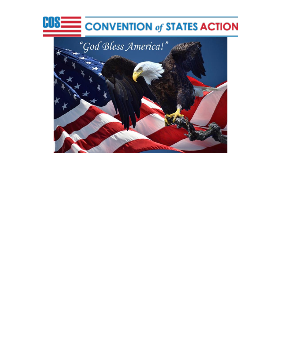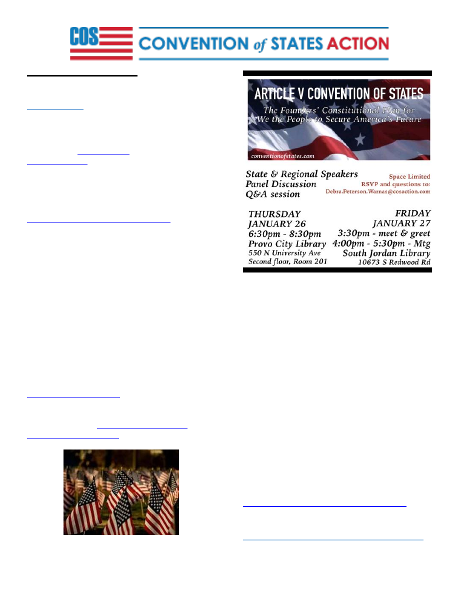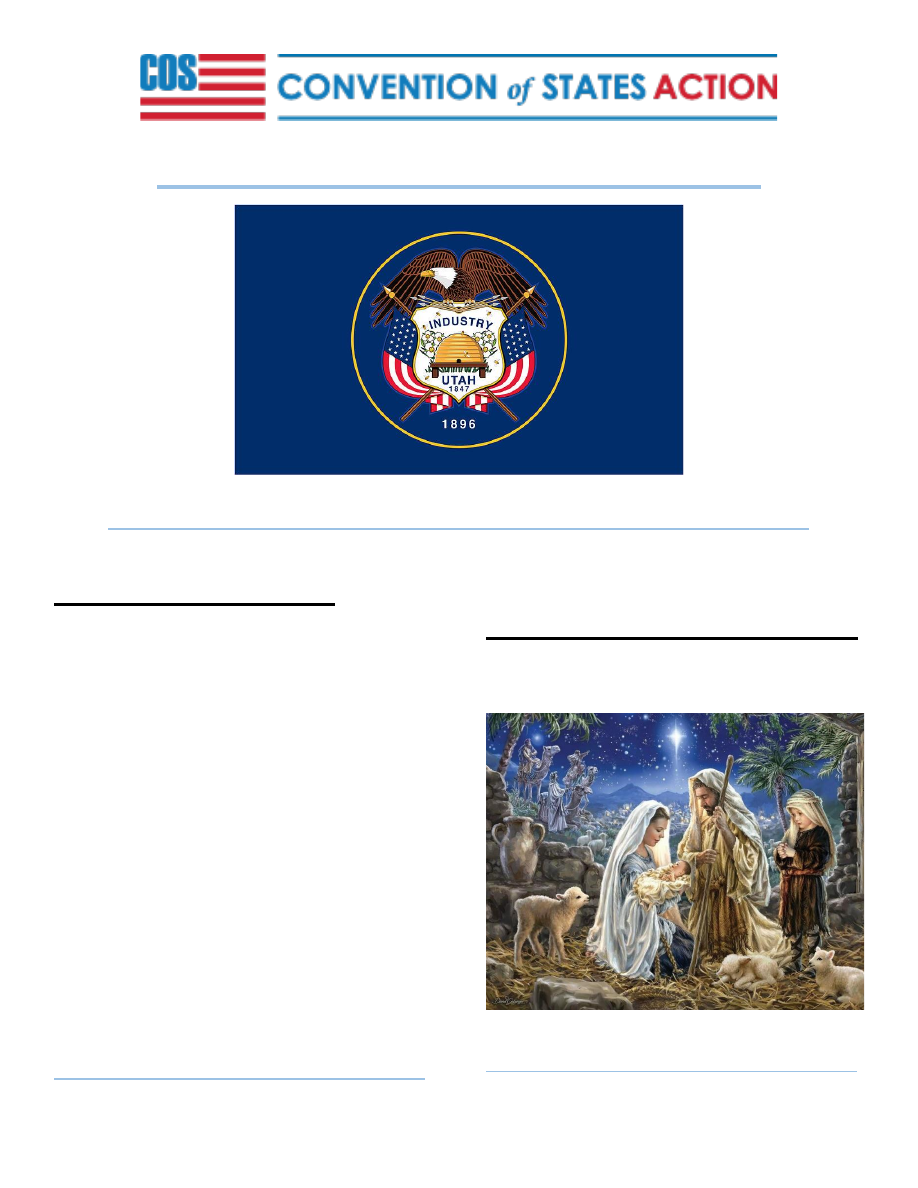 ![]() Page 1 of 6 December 2022 Utah Pioneer Patriots Newsletter Let’s Go Team Utah!! ______________________________________________________________________ COS National Update: This is our moment in history. Frustration with the federal government continues to skyrocket, crossing party lines. NOW is the time to unite behind a nationwide effort to call a Convention of States and propose ironclad amendments that cut the congressional credit card and force the feds to live on a budget. The Founders entrusted us with Article V for just such a time as this… a time when the feds have grown so massive and corrupt that they will never limit their own power. Here’s the good news, 19 states have already passed our Resolution to call the convention and it only takes 34 to make it happen. In a matter of weeks, 41 states will kick off their legislative sessions, many of which have pending COS Resolutions, ready to be heard. Now is the time to sprint across the finish line while the public sentiment is on our side. Convention of States Action Team _____________________________________ COS Utah December Update: Merry Christmas to you and yours! Remember, Jesus is the reason for the Season! from the COS Utah Team _____________________________________ ![]() Page 2 of 6 Legislative Liaison: Be sure to contact your Legislators - Elected officials represent our community and our interests, so let them know who you are and what you care about! Take time to introduce yourself and your organization to public officials serving your community – including both federal and state representatives. Make an appointment and discuss: 1- Their stance on Convention of States. 2- What Bills they are working on that COS could possibly get behind and support. 3- Notify your District Captain, or Regional Captain, or Legislative Liaison with the results after contacting them. Contact Your Government Official| | Utah.gov Contact the House| | Utah House of \\ Representatives (utleg.gov) Utah State Legislative District Maps (Expires January 1, 2023) District Map (utah.gov) by Nichole Klosowiak and Barbara Metaxas _____________________________________ Last Month Event: Election’s Over, Now What? Well, the elections are over. Individuals have been elected to office in the various races. Many of them were “uncontested” races, but they were still elected. So, now what? It seems that our society has the impression that they have done their duty and now it’s up to the elected officials to do their part. Actually, voting (or not voting) is just the tip of the iceberg . Let me put it this way. Whether you voted for the individual that is elected or not, they are still your political servants. The citizens in this country are the sovereigns. Therefore, “We the People” retain the rights to governance no matter who is elected to the office. I have heard it said by some elected officials that, “You put me into office now I will do what I think is right.” Would you hire a servant to take care of your household business and then never tell that servant how you want the household to run? Obviously not. The mindset of the citizens as well as those elected must change. The public servants we elect to office are there to do the bidding of the citizenry, not to tell the citizenry how things are going to be done. Just because they are elected to office doesn’t mean that they have the right to ignore the citizens and do what they want. However, if the citizenry doesn’t make any effort to give guidance to the elected officials, then they get the feeling that whatever they do is, not IN the best interest of the public but IS, the best interest of the public. That is why voting is just the tip of the iceberg . It doesn’t matter if the person we voted for gets into office or not, the one individual that won the election is still our representative in whatever office they are elected to. Their responsibility is to listen to their constituents and evaluate whether the issue is in the best interests of all their constituents, not just those who voted for them, but if they never hear from their constituents, well then …We need to be in contact with our representatives!!! By William Pressgrove _____________________________________ ![]() Page 3 of 6 Monthly Spotlight: Name: Nichole Klosowiak COS Title: Legislative Liaison City raised in: San Antonio, Texas City current living in: Provo, Utah Favorite Hobbies: Running, Crafts, Politics What brought you to COS (Your Why): After interning one summer for a member of the US House of Representatives in Washington, D.C., I recognized that our federal government is broken. I believe that a Convention of States is our best shot at fixing it. Inspirational thought: “Do your best, let God do the rest.” More about You: I’m a proud wife of a business owner, here in Utah, and a mother of 2 beautiful girls. I work as an engineer for my husband’s business. My faith is a big part of my life. by Nichole Klosowiak _____________________________________ Utah Veterans Update: Welcome to all our Veterans! Thank you for your service to all our citizens and our beloved country! Tony Galvez, SVCD Gold Star Father of Cpl. Adam Galvez USMC. WIA 07-29-2006, KIA 08-20-2006. ____________________________________ ![]() Page 4 of 6 Calendar Events: Citizen Builder (CB) Training Register here. Every Tuesdays at 7:00 pm MTN – National - District Captains (DC) / Volunteer webinar call: Register here. Call Recordings. First Wednesday of each month at 7:00 pm MTN – COS Utah Statewide Leaders/Volunteers Zoom call: https://us02web.zoom.us/j/5439732886 Second Wednesday of each month at 7:00 pm MTN – Regional Captain (RC) meeting with their District Captains (DC) check with your Regional Captain for details. Third Wednesday of each month at 7:00 pm MTN – District Captain (DC) meeting with their Volunteers - check with your District Captain for details. On any Wednesday evening that you do not have a meet