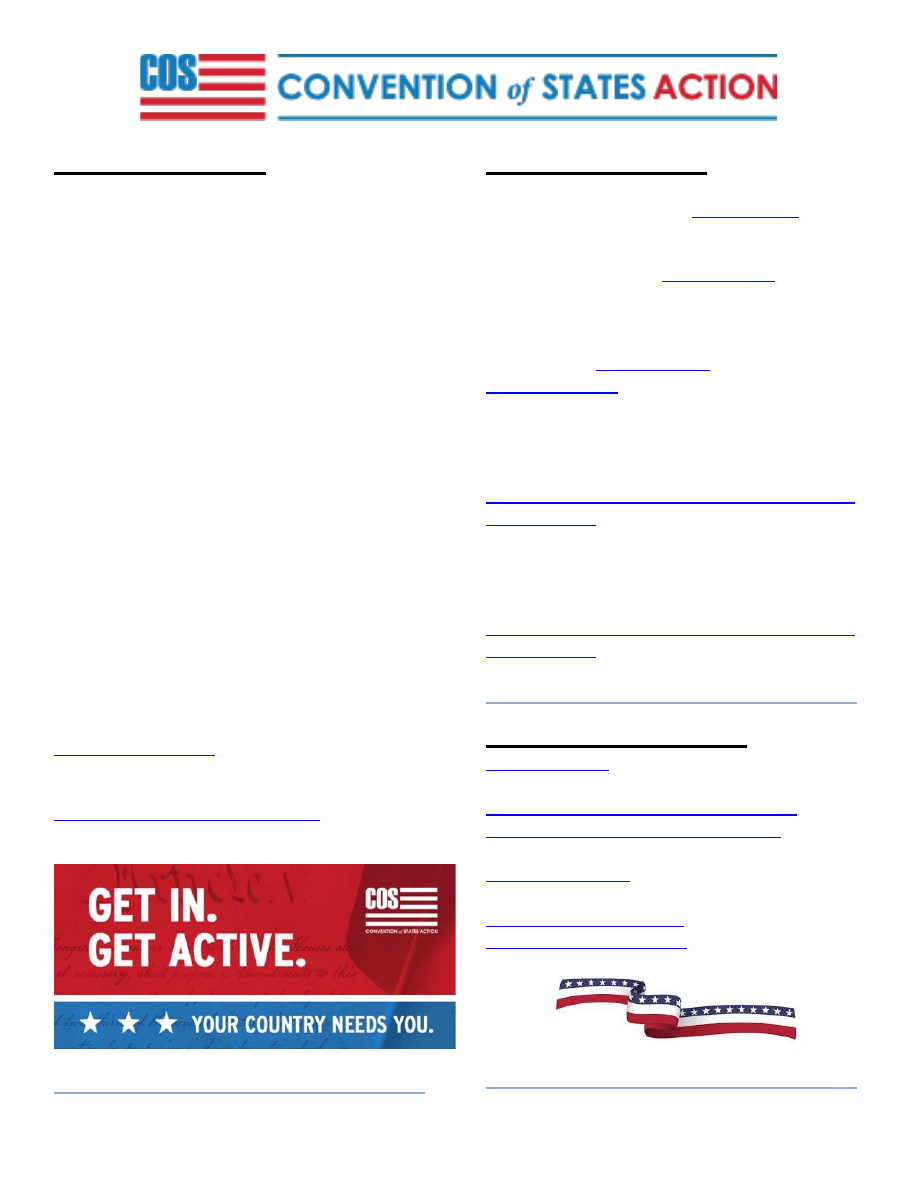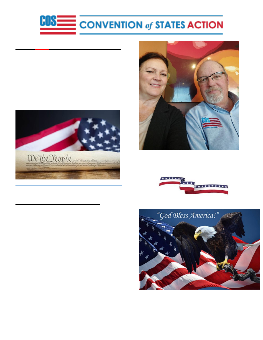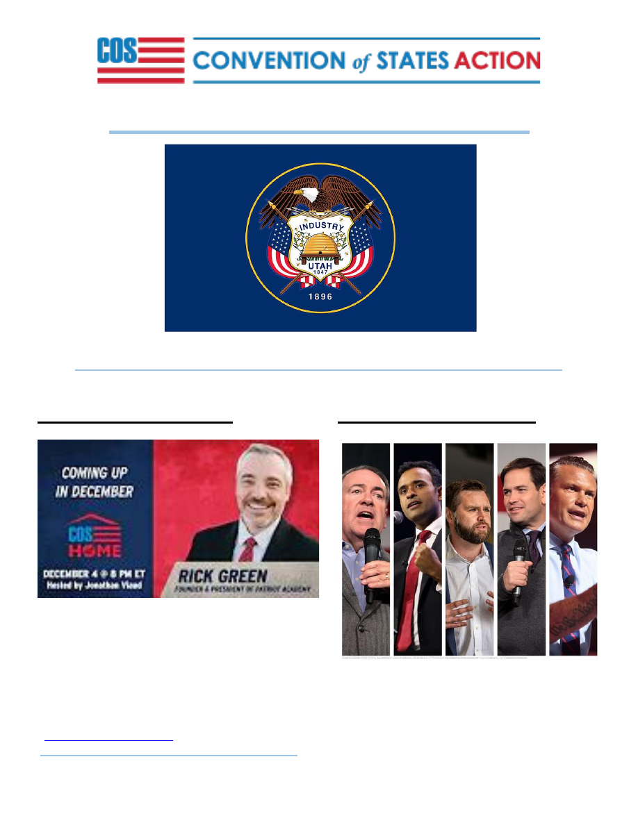 ![]() Page 1 of 6 December 2024 Utah Pioneer Patriots Newsletter Let’s Go Team Utah!! ______________________________________________________________________ COS National Update: For the final show of 2024, America's Constitution Coach Rick Green–the President of Patriot Academy and a passionate champion for COS–will join us for an electrifying hour of inspiration and education. Rick will share his thoughts on the elections, what to expect from the second iteration of a Trump Administration, and how everyday patriots can turn the tide for America in 2025. . https://lnkd.in/gjb-wUvz _____________________________________ COS Nat ’l Last Month: Convention of States supporters are stepping into our nation’s highest offices. You heard that right ––nearly ALL of President Trump’s new appointees are vocal supporters of calling an Article V convention to permanently limit federal power. ![]() Page 2 of 6 But don’t take our word for it! Here’s what they have to say… From PETE HEGSETH , selected to serve as Secretary of Defense: “The Convention of States Project is the only constitutional pathway for citizens to save our Republic by restoring it to her citizens.” From SENATOR MARCO RUBIO , selected to serve as Secretary of State: “The Convention of States Project is a genuine grassroots movement to achieve that goal and one that I am proud to be a part of.” From VIVEK RAMASWAMY , selected to lead Trump’s Department of Government Efficiency alongside Elon Musk: “Article V convention…I’d say do it! It’s going to be good for the country.” From MIKE HUCKABEE , U.S, Ambassador to Israel: “I urge you to join me in supporting the Convention of States Project.” Even VICE PRESIDENT-ELECT JD VANCE has indicated his support for calling an Article V convention. And as they head into office, they will be greeted by REP. MIKE JOHNSON , our sitting Speaker of the House and an outspoken supporter of COS. This new wave of leadership gets it – they recognize that the only way to secure real, systematic, long-term changes in Washington, D.C. will be through the states. _____________________________________ Utah December 2024 Update: We will be holding our recurring In-Person COS multi-Utah House District (HD) and Regional meeting to sign Christmas cards to our state Legislators and state Senators: Date: December 11th (the 2nd Wednesday of each month) Location: Sandy Library, 10100 South Petunia Way, Sandy, Utah Time: 7:00 to 8:30 pm – We will be signing Christmas cards for all our state Legislators and state Senators. We will be putting our COS business cards and pictures in the cards. We could definitely use your help in getting all these cards completed and out in the mail. This will be a group of likeminded people meeting together to discuss our ideas on how to progress the COS grass roots movement here in Utah, utilizing COS volunteers and Article V of our divinely inspired constitution. Hope you can join us! Merry Christmas to you and yours! Remember, Jesus is the reason for the Season! _____________________________________ ![]() Page 3 of 6 Utah Dec . Update continued: Scott Pratt is inviting you to a scheduled - Welcome to COS Utah - Zoom call - Date: Wednesday, December 4th , 2024 Time: 8:00 PM - 8:45 PM Zoom link: https:%%//%%us02web.zoom.us/j/3261341350?omn=\\ 87906669284 _____________________________________ COS Utah Last Month : Last month we were invited by Jerry Sheets to come and visit with the Bonneville Kiwanis Club. If you are not familiar with Kiwanis, they are an international service organization that supports youth and community programs. They wanted to know more about Convention of States . So, Scott Pratt, our Utah State Director and Mary Wenner, our Utah State Grassroot Coordinator, met with them on November 20th to present a short (20-30 min) presentation followed by Q&A over lunch. This was a great opportunity for our COS Utah Team to meet with more people and educate them on Convention of States . A BIG Thank you to Scott and Mary! Scott Pratt, our Utah State Director and Mary Wenner, our Utah State Grassroot Coordinator _____________________________________ ![]() Page 4 of 6 Legislative Liaison: Be sure to contact your Legislators – YOU ARE THE BOSS!! Act like it!!! Elected officials represent our community and our interests, so let them know who you are and what you care about! Take time to introduce yourself and your organization to public officials serving your community – including both federal and state representatives. Make an appointment and discuss: 1- Their stance on Convention of States. 2- What Bills they are working on that COS could possibly get behind and support. 3- Notify your District Captain, or Regional Captain, or Legislative Liaison with the results after contacting them. Contact Your Government Official| | Utah.gov Contact the House | Utah House of \\ Representatives (utleg.gov) Utah State Legislative District Maps District Map (utah.gov) by Nichole Klosowiak Legislative Liaison Utah _____________________________________ Utah Veterans Update: Welcome to all our Veterans! Thank you for your service to all our citizens and our beloved country! Rodney Huckleberry National Veterans Coalition Coordinator rhuckleberry@cosaction.com < > 314-709-0327 _____________________________________ ![]() Page 5 of 6 Training Events: National - Citizen Builder Training – With Bill Wiltschko: Mondays at 6:00 pm MNT. The October series will start on October 7 th . This will be the last series in 2024. The next series will start next March. Each week of the month covers different topics regarding Citizen Builder. • Week 1 Citizen Builder Accounts • Week 2 People • Week 3 Messaging • Week 4 Tools Bill will hold the training whether a holiday falls on that day or not. This means we have a session on Columbus Day, Oct 14th. Bill does not record the training, in order to encourage questions. You can join the training in any week, 