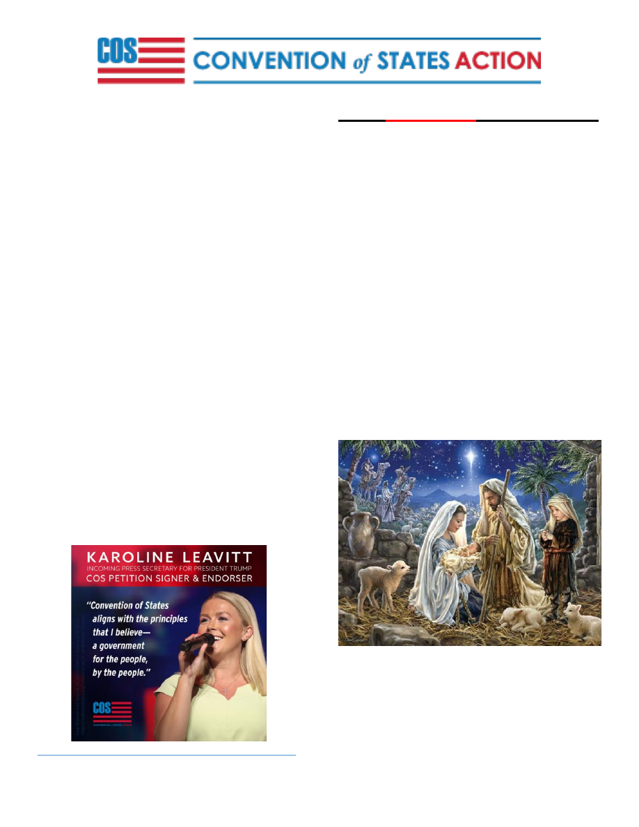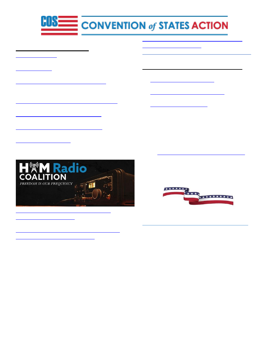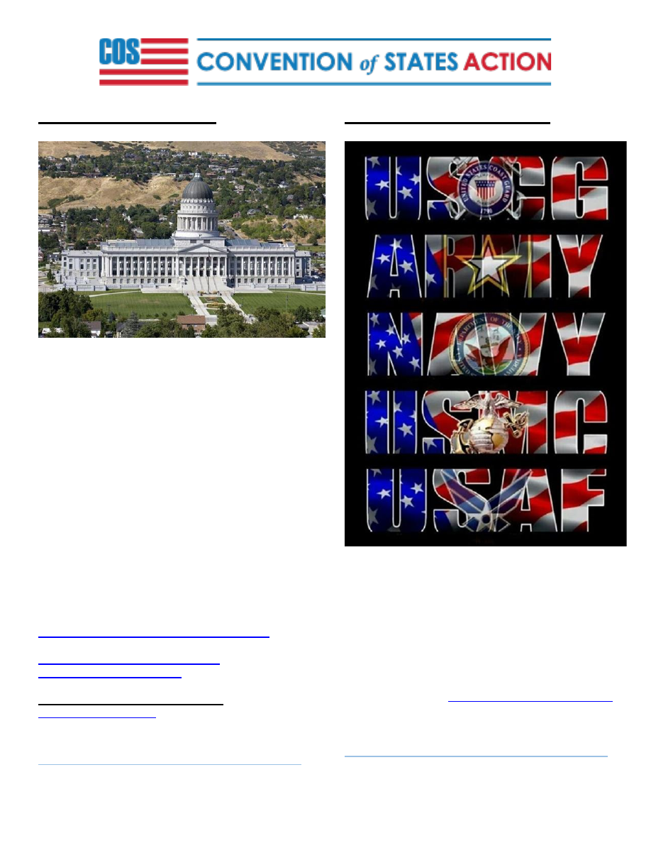 ![]() Page 1 of 6 December 2024 Utah Pioneer Patriots Newsletter Let’s Go Team Utah!! ______________________________________________________________________ COS National Update: For the final show of 2024, America's Constitution Coach Rick Green–the President of Patriot Academy and a passionate champion for COS–will join us for an electrifying hour of inspiration and education. Rick will share his thoughts on the elections, what to expect from the second iteration of a Trump Administration, and how everyday patriots can turn the tide for America in 2025. . https://lnkd.in/gjb-wUvz _____________________________________ COS Nat ’l Last Month: Convention of States supporters are stepping into our nation’s highest offices. You heard that right ––nearly ALL of President Trump’s new appointees are vocal supporters of calling an Article V convention to permanently limit federal power. ![]() Page 2 of 6 But don’t take our word for it! Here’s what they have to say… From PETE HEGSETH , selected to serve as Secretary of Defense: “The Convention of States Project is the only constitutional pathway for citizens to save our Republic by restoring it to her citizens.” From SENATOR MARCO RUBIO , selected to serve as Secretary of State: “The Convention of States Project is a genuine grassroots movement to achieve that goal and one that I am proud to be a part of.” From VIVEK RAMASWAMY , selected to lead Trump’s Department of Government Efficiency alongside Elon Musk: “Article V convention…I’d say do it! It’s going to be good for the country.” From MIKE HUCKABEE , U.S, Ambassador to Israel: “I urge you to join me in supporting the Convention of States Project.” Even VICE PRESIDENT-ELECT JD VANCE has indicated his support for calling an Article V convention. And as they head into office, they will be greeted by REP. MIKE JOHNSON , our sitting Speaker of the House and an outspoken supporter of COS. This new wave of leadership gets it – they recognize that the only way to secure real, systematic, long-term changes in Washington, D.C. will be through the states. _____________________________________ Utah December 2024 Update: We will be holding our recurring In-Person COS multi-Utah House District (HD) and Regional meeting to sign Christmas cards to our state Legislators and state Senators: Date: December 11th (the 2nd Wednesday of each month) Location: Sandy Library, 10100 South Petunia Way, Sandy, Utah Time: 7:00 to 8:30 pm – We will be signing Christmas cards for all our state Legislators and state Senators. We will be putting our COS business cards and pictures in the cards. We could definitely use your help in getting all these cards completed and out in the mail. This will be a group of likeminded people meeting together to discuss our ideas on how to progress the COS grass roots movement here in Utah, utilizing COS volunteers and Article V of our divinely inspired constitution. Hope you can join us! Merry Christmas to you and yours! Remember, Jesus is the reason for the Season! _____________________________________ ![]() Page 3 of 6 Utah Dec . Update continued: Scott Pratt is inviting you to a scheduled - Welcome to COS Utah - Zoom call - Date: Wednesday, December 4th , 2024 Time: 8:00 PM - 8:45 PM Zoom link: https:%%//%%us02web.zoom.us/j/3261341350?omn=\\ 87906669284 _____________________________________ COS Utah Last Month : Last month we were invited by Jerry Sheets to come and visit with the Bonneville Kiwanis Club. If you are not familiar with Kiwanis, they are an international service organization that supports youth and community programs. They wanted to know more about Convention of States . So, Scott Pratt, our Utah State Director and Mary Wenner, our Utah State Grassroot Coordinator, met with them on November 20th to present a short (20-30 min) presentation followed by Q&A over lunch. This was a great opportunity for our COS Utah Team to meet with more people and educate them on Convention of States . A BIG Thank you to Scott and Mary! Scott Pratt, our Utah State Director and Mary Wenner, our Utah State Grassroot Coordinator _____________________________________ ![]() Page 4 of 6 Legislative Liaison: Be sure to contact your Legislators – YOU ARE THE BOSS!! Act like it!!! Elected officials represent our community and our interests, so let them know who you are and what you care about! Take time to introduce yourself and your organization to public officials serving your community – including both federal and state representatives. Make an appointment and discuss: 1- Their stance on Convention of States. 2- What Bills they are working on that COS could possibly get behind and support. 3- Notify your District Captain, or Regional Captain, or Legislative Liaison with the results after contacting them. Contact Your Government Official| | Utah.gov Contact the House | Utah House of \\ Representatives (utleg.gov) Utah State Legislative District Maps District Map (utah.gov) by Nichole Klosowiak Legislative Liaison Utah _____________________________________ Utah Veterans Update: Welcome to all our Veterans! Thank you for your service to all our citizens and our beloved country! Rodney Huckleberry National Veterans Coalition Coordinator rhuckleberry@cosaction.com < > 314-709-0327 _____________________________________ ![]() Page 5 of 6 Training Events: National - Citizen Builder Training – With Bill Wiltschko: Mondays at 6:00 pm MNT. The October series will start on October 7 th . This will be the last series in 2024. The next series will start next March. Each week of the month covers different topics regarding Citizen Builder. • Week 1 Citizen Builder Accounts • Week 2 People • Week 3 Messaging • Week 4 Tools Bill will hold the training whether a holiday falls on that day or not. This means we have a session on Columbus Day, Oct 14th. Bill does not record the training, in order to encourage questions. You can join the training in any week, 