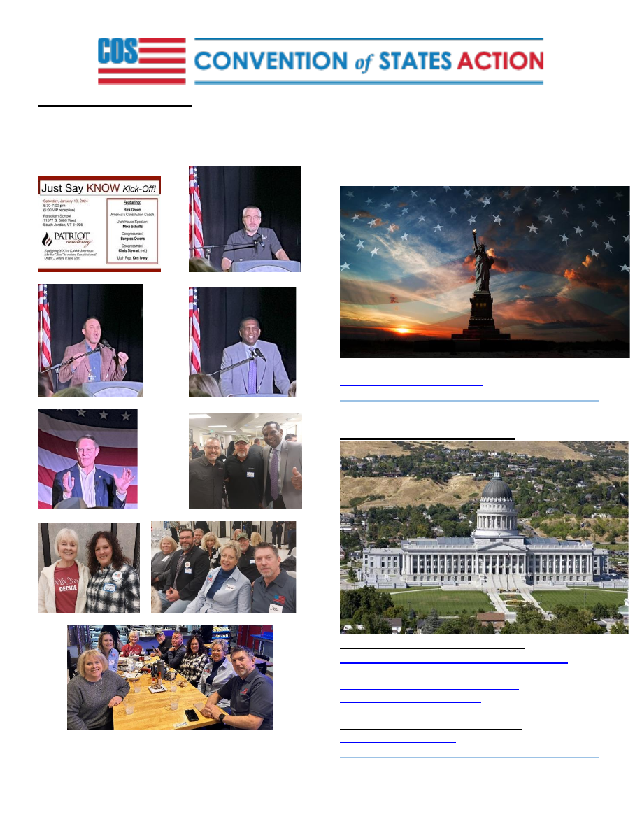 ![]() Page 1 of 7 February 2024 Utah Pioneer Patriots Newsletter Let’s Go Team Utah!! ______________________________________________________________________ COS National Update: The past few weeks have been a whirlwind, as Mark Meckler has been on the road speaking at Capitol Days across the country and meeting with state legislators as they prepare to vote on the Convention of States Resolution. With votes on COS quickly coming down the pike, our COS teams are working around the clock to lay the groundwork for victory. With so much in motion we wanted to give you a list of the state where our legislation is currently active: 1 – Delaware 2 – Illinois 3 – Iowa 4 – Kentucky 5 – Massachusetts 6 – Minnesota 7 – New Jersey 8 – New York 9 – North Carolina 10 – Ohio 11 – Pennsylvania 12 – Rhode Island 13 – South Dakota 14 – Vermont 15 – Washington by Mark Meckler, President COS Action _____________________________________ COS Nat ’l Last Month: The 2024 Legislative Season Kicks Off with numerous States Filing the COS Resolution: As the 2024 legislative season ramps up, state legislatures are lining up to consider Convention of States Action's resolution that calls for an Article V convention to rein in the federal government. ![]() Page 2 of 7 By January 4, the COS Resolution was introduced by 15 more states: The Convention States Resolution has already passed in 19 states, and just 15 more are needed to trigger the first-ever Article V convention. To support the grassroots effort, please sign the petition below. Take action - COSAction \\ (conventionofstates.com) Get the full scoop here: 34 Trillion Reasons, 2024 Legislative Kickoff| | \\ COS NOW EP01, 2024 (youtube.com) _____________________________________ Utah February 2024 Update: Please join us for our annual COS Utah State Capitol Rally – Date: Tuesday, February 13 th , 2024 Location: Utah Capitol Hill in the Seagull room (here is the link to the Seagull room): https:%%//%%utahstatecapitol.utah.gov/capitol-event-\\ spaces/seagull-room-2/ Time: 9:00 am to 12:00 noon at the Capitol Lunch: We will be gathering for lunch after the rally at the SLC Chuck Arama, 744 East 400 South, SLC, Utah 84012: Salt Lake - Chuck-A-Rama Buffet And directions: Google Maps Hope you can all join us! If you have any questions regarding any of this information, please contact: Scott Pratt, SD – 801-918-9238 Mary Wenner, SGC – 801-518-2290 Nichole Klosowiak, LL – 210-307-8026 Debra Peterson-Warnas, SCC – 801-971-4534 _____________________________________ ![]() Page 3 of 7 Utah Last Month: COS Utah team attended a live Patriot Academy event featuring: Rick Green, Mike Schultz-Utah House Speaker, Congressman Burgess Owens, and Ken Ivory-Utah Rep. Rick Green Mike Schultz Burgess Owens Ken Ivory Rick, Scott Pratt, and Burgess. Maurine & Mary: Heidi, Sean, Debra, Dave, Stac,& Scott Dinner after – Heidi, Nichole Maurine, Scott Tom, Mary Debra and Dave. And Utah Rep. Ken Ivory wrote a letter for COS National newsletter detailing why it's necessary for the American people to realize they are “The Boss” to reclaim self- governance. Read The Full Story Here _____________________________________ Legislative Liaison: Be sure to contact your Legislators - Contact Your Government Official| | Utah.gov Contact the House | Utah House of \\ Representatives (utleg.gov) Utah State Legislative District Maps District Map (utah.gov) _____________________________________ ![]() Page 4 of 7 Message from our State Director (SD), Scott Pratt: I would like to tell you about the wonderful Convention of States (COS) folks that I am privileged to associate with every day. They are indeed the people that Joe Walsh referred to when he penned Ordinary Average Guy. Just ordinary people willing to stand for what is good and right. Their efforts, however, are extraordinary. Everyone has a story, and I could go on for hours but here are just a few gems: There is the brand-new volunteer from southern Utah that despite physical challenges, dedicates a goodly portion of her young life to the preservation of Liberty. I wished you could meet the great grandmother in Utah County that will never ever quit, even in 104-degree heat when the rest of us retreat into the shade of the exhibit canopy. I am so inspired by the young woman barely out of her teens who somehow, someway, finds the means to take an active role from her remote family subsistence farm in the Basin. There is the veteran whose 20 years of service and multiple deployments were “just not enough”. I work with a two-time cancer survivor who absolutely will not tolerate the tyranny being thrust on his young daughter. There are so many who are just trying to keep a roof over their head and food on the table. A good percentage of the team are retired and have worked a lifetime so that they could just relax and “go fishin' ” in their twilight years. Yet here they all are – volunteering to save our country!!! We all come from different places with diverse life experiences and varied religious/philosophical traditions, but it occurs to me that the glue that binds us all together is Love. Love of life and that which created it. Love of family and friends. Love of liberty and the document in which it is enshrined. Yeah, I'm just gonna put the “man's man” thing aside and say it: I really Love these “ordinary average guys.” If you are looking for a good home for your patriotism, I cannot recommend a finer place than here with the welcoming COS Utah family. “It's the singer not the song That makes the music move along. Come on and join together with the band. ” P. Townsend. _____________________________________ Message from our new State Grass Coordinator (SGC): My name is Mary Wenner, and I am an American freedom fighter! I have been a patriot my whole life but when Covid hit, we were locked down and masked without the proper authority. I was determined to protect our freedoms as Amer