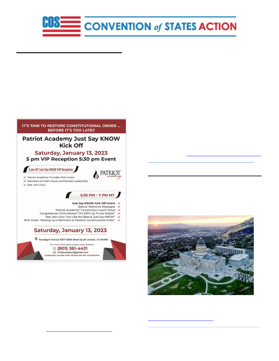 ![]() Page 1 of 7 January 2024 Utah Pioneer Patriots Newsletter Let’s Go Team Utah!! ______________________________________________________________________ COS National Update: The commitment of our leaders to educating and introducing the Convention of States (COS) initiative to friends, family, and neighbors nationwide is absolutely vital to our mission and does not go unnoticed. You can use the presentation below to introduce the COS movement in small group settings, train new members of your COS team, present in front of large audiences, or wherever you see fit. View the full presentation here. _____________________________________ COS Nat ’l Last Month: Newsmax host Carl Higbie introduced his audience to Convention of States in December 2023, “Hmm… Why haven't we heard about this? Well, because this process can actually circumvent federal power. And the mainstream media, we know they're in the tank for big government. So why would they report on this?” Read the full story and watch his commentary here. Read The Full Story Here _____________________________________ ![]() Page 2 of 7 Utah January 2024 Update: We will be holding our recurring Salt Lake County In-Person COS multi-Utah House District (HD) and Regional meeting in conjunction with Patriot Academy: Date: January 13th Location: Paradigm School, 11577 South 3600 West, South Jordan, Utah Time: 5:00 to 7:00 pm – We want to be respectful of your time, but if you would like to stay longer and chat that would be great. This will be a group of likeminded people meeting together to discuss our ideas on how to progress the COS grass roots movement here in Utah, utilizing COS volunteers and Article V of our divinely inspired constitution. If you have any questions, please contact: Scott Pratt:< > Scott.pratt@cosaction.com <.> We will be holding our recurring Utah County In-Person COS multi-Utah House District (HD) and Regional meeting: Date: January 10th (the 2nd Wednesday of each month) Location: American Fork Library, 64 South 100 East, American Fork, Utah Time: 6:30 to 8:00 pm – We want to be respectful of your time, but if you would like to stay longer and chat that would be great. This will be a group of likeminded people meeting together to discuss our ideas on how to progress the COS grass roots movement here in Utah, utilizing COS volunteers and Article V of our divinely inspired constitution. If you have any questions, please contact: Maurine Miles: Maurine.miles@cosaction.com <.> ___________________________________ Coming Up in Utah Feb 2024: Please save the date - Tuesday, February 13 th , 2024 . We will be holding our COS Utah State Capital Rally on Tuesday, February 13 th , 2024 . More Details to follow - Hope you can all join us! If you have any questions, please contact: Scott Pratt: Scott.pratt@cosaction.com <.> _____________________________________ ![]() Page 3 of 7 Utah Last Month: In our December 2023 In-Person meeting we had a great group of patriots helping us get Christmas cards hand signed, addressed, and ready to be mailed to our state Legislators and Senators. Front table: Heidi, Tom, Frank, Tony, Glora, Angie, Kelly, and Debra. Back table: James, Jolene, Stacey, Anthony, and Scott. Front table: Angie, and Kelly. Back table: Jolene, Stacey, and Anthony. Jolene, and Stacey. We even had Utah state Legislator, Ken Ivory Zoom call into our meeting and gave us a great message. Mary Wenner is taking great pictures! The Christmas cards are ready to be mailed out to our State Legislators and Senators. And Mary Wenner was even able to attend Ken Ivory’s Constitution class in Dec. at the Legacy shooting range. Great job Mary! _____________________________________ ![]() Page 4 of 7 Legislative Liaison: Be sure to contact your Legislators - Elected officials represent our community and our interests, so let them know who you are and what you care about! Take time to introduce yourself and your organization to public officials serving your community – including both federal and state representatives. Make an appointment and discuss: 1- Their stance on Convention of States. 2- What Bills they are working on that COS could possibly get behind and support. 3- Notify your District Captain, or Regional Captain, or Legislative Liaison with the results after contacting them. Contact Your Government Official | Utah.gov Contact the House| | Utah House of \\ Representatives (utleg.gov) Utah State Legislative District Maps District Map (utah.gov) by Nichole Klosowiak Legislative Liaison Utah _____________________________________ Utah Veterans Update: Welcome to all our Veterans! Thank you for your service to all our citizens and our beloved country! Rodney Huckleberry National Veterans Coalition Coordinator rhuckleberry@cosaction.com < > 314-709-0327 _____________________________________ ![]() Page 5 of 7 Quote of the Week: There’s one thing that progressives fear more than Donald Trump winning the primary: Convention of States calling an Article V Convention to drain the swamp… permanently! Already, 250 Soros-funded organizations have announced a coalition in opposition to our efforts. That’s bigger than any Leftist coalition assembled in recent history…and yet they are unified against COSA! We’ve found their operatives infiltrating state legislatures before our votes, we’ve uncovered Google ads meant to pull in people looking for our website that take them to web pages filled with lies and misinformation, and we know that they have launched massive text campaigns to flood legislators with calls against our legislation. And this is only the beginning. We expect that as we get closer and closer to convention, we’ll begin to face off against everyone from mainstream media and movie stars to social media influencers with millions of followers. Even in the last few weeks, we’ve seen what has appeared to be a coordinated uptick in hit pieces against COS going out in the news. I don’t think it’s a coi