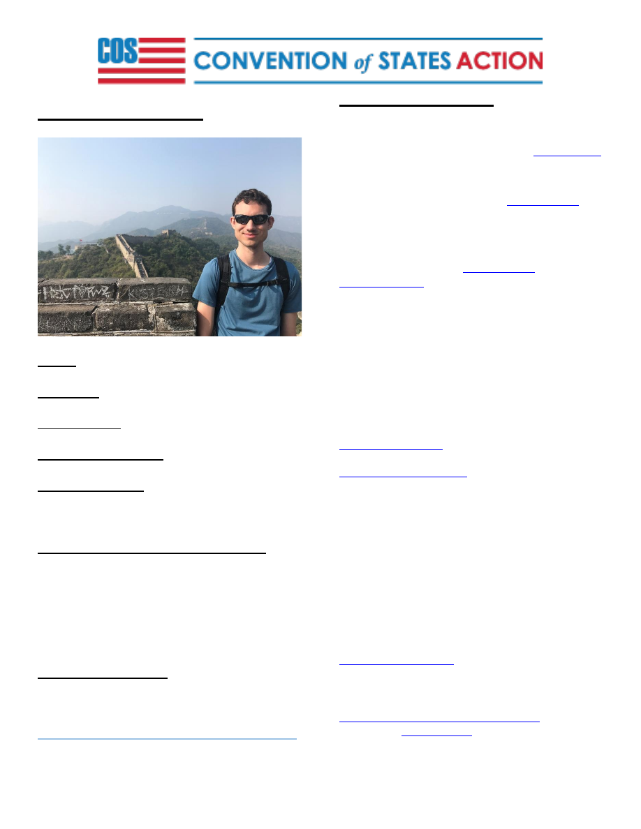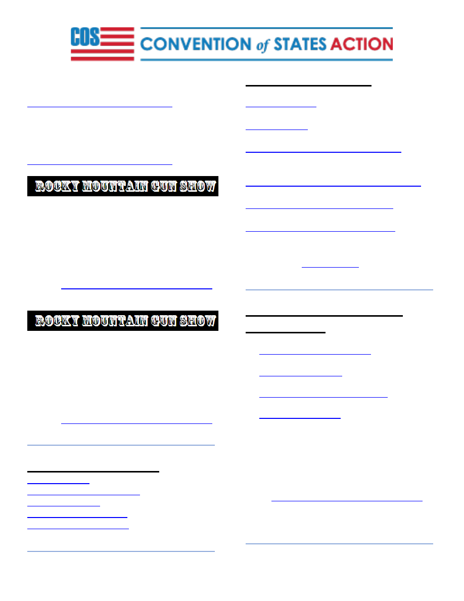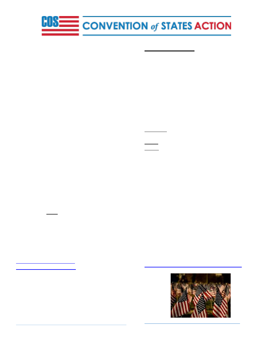![]() Page 1 of 7 June 2023 Utah Pioneer Patriots Newsletter Let’s Go Team Utah!! ______________________________________________________________________ COS National Update: The Big Government leftists already have a virtual monopoly on the levers of power in Washington. Those who sit on the sidelines and do nothing give approval to their continued destruction of our freedom. You either stand with Tucker Carlson , Mark Levin , Mike Huckabee , Sean Hannity , Ben Shapiro , Dr. James Dobson , Sen. Marco Rubio , Sen. Rand Paul , the Framers of our Constitution, and over 5.3 MILLION of our fellow grassroots patriots in favor of an Article V Convention to save America … … or you stand with Hillary Clinton, George Soros, the Deep State, and the radical Left to perpetuate our nation’s disastrous slide into Big Government tyranny. T here simply is no middle ground, and I’m fed up with people who claim to love the Constitution but who refuse to use the Constitution to SAVE the Constitution. And don’t be fooled — not choosing is to make a choice. As a lover of our country and a fellow fighter for freedom, I know you’d never side with our opponents. Instead, I’m counting on you to choose liberty. Thanks to the faithful and generous partnership of America-loving patriots like you, we have secured passage of the Article V Resolution in 19 of the constitutionally required 34 states, and we have several more on the cusp of passage in the coming months. But to continue moving forward, we urgently need to increase our strength on the ground because – ![]() Page 2 of 7 we’re facing hostile and growing opposition from incumbent politicians, the bureaucratic “Deep State,” and the full force of the anti-American Left. In state after state, our grassroots activists are encountering left-wing protestors, smears and lies online, and even paid lobbyists funded by George Soros-affiliated groups. Meanwhile, in the fake media and on platforms like Facebook and Twitter, we’re enduring blistering opposition from some of America’s most notorious left-wing voices, including George Soros , Hillary Clinton , former Attorney General Eric Holder , and over 250 left-wing organizations including: - Planned Parenthood ; - The Sierra Club ; - America’s largest labor unions, including the AFL-CIO , SEIU , - AFSCME , and multiple teachers’ unions; - EMILY’s List ; - Common Cause ; - … and many, many more. Our success in calling an Article V Convention will spell the END of Big Government in America and solidify constitutional protections for our freedom once and for all! But we're not there yet – and the closer we get to the target, the more flak we’re going to take. Please Take Action and volunteer to help: Take action - COSAction \\ (conventionofstates.com) Thank you, Mark Meckler President Convention of States Action _____________________________________ Utah Update: We believe that everyone receiving this email has signed the COS petition and wants to hold our federal government accountable to follow and honor our divinely inspired Constitution, and to have the elected representatives full fill the oath of office they swore to serve “We the People”. We plan to hold a monthly COS South Salt Lake County In-Person meeting: Location: IHOP, 10815 South State Street, Sandy, Utah. Date: the 2nd Wednesday of each month Time: 5:30 to 6:30 pm - We want to be respectful of your time and just keep it to an hour, but if you would like to stay longer and chat that would be great. Everyone will be paying for their own dinner/drinks. This will be a group of likeminded people meeting together to discuss our ideas on how to progress this COS grass roots movement here in Utah, utilizing COS volunteers and Article V of our divinely inspired constitution. Hope to see you there for some lively conversations about freedom and the love we have for our beloved country and our divinely inspired constitution. Please RSVP or send questions to: Debra.Peterson.Warnas@cosaction.com < > ________________________________ ![]() Page 3 of 7 Utah Last Month: Last month I sent an email to my State Legislator to introduce myself and get his feelings regarding Convention of States. I also sent him a copy of our COS May 2023 newsletter. Maybe you could do the same to your local State Legislator? Here is an example of the letter I sent out – you are welcome to use it or adjust it to your local House District or your personality. I would like to introduce myself - My name is ___(your name)____________ and I am in your House District _(HD-#)____ here in __(city)____, Utah. I am an active member of Convention of States (COS) here in your House District _(HD-#)_____ and throughout _(your county)_______ County. I would like to know your feelings about Convention of States (COS). We will be holding an In-person monthly meeting the 2nd Wednesday of each month to help keep our likeminded supporters updated on our most recent activities within COS. We would love to have you come to one of these meetings and visit with some of your local constituents. Please let me know when you would be available. I am very proud of our beautiful state of Utah, and for our State Representatives for passing the resolution for Article V back in 2019. We here in COS feel that this grass roots organization will help give “We the People” and our local State Representatives the ability to get Washington DC back under control – Such as a balanced federal budget, term limits for federal elected officials and limit the overreach of the federal government. Each month for the past couple of years we have created and emailed out a COS Utah monthly newsletter to our nearly 8,000 + COS Utah supporters. Please see attached our latest COS Utah newsletter. We would love to have an interview with you in one of our future monthly newsletters to discuss your concerns and hopes for your HD-_(HD-#)____. Please let me know when you would be available to do an in