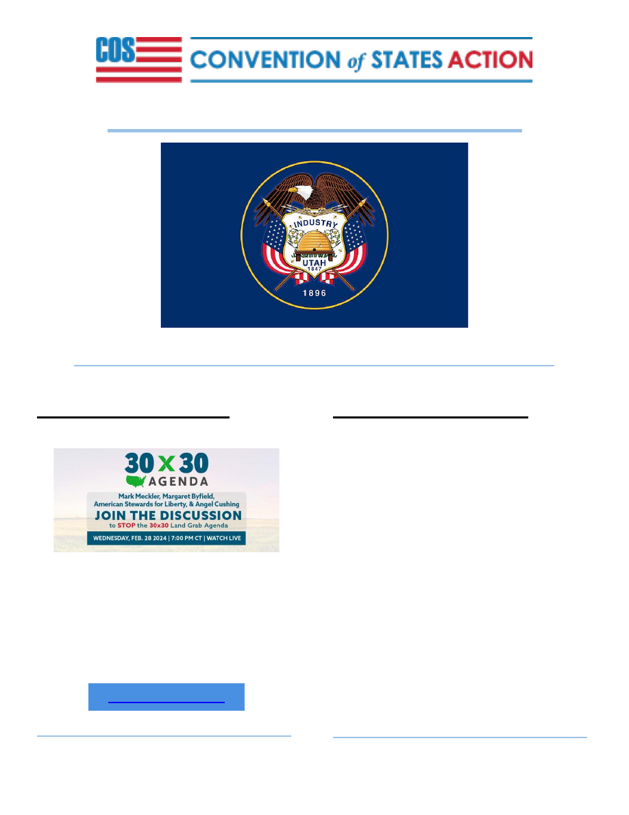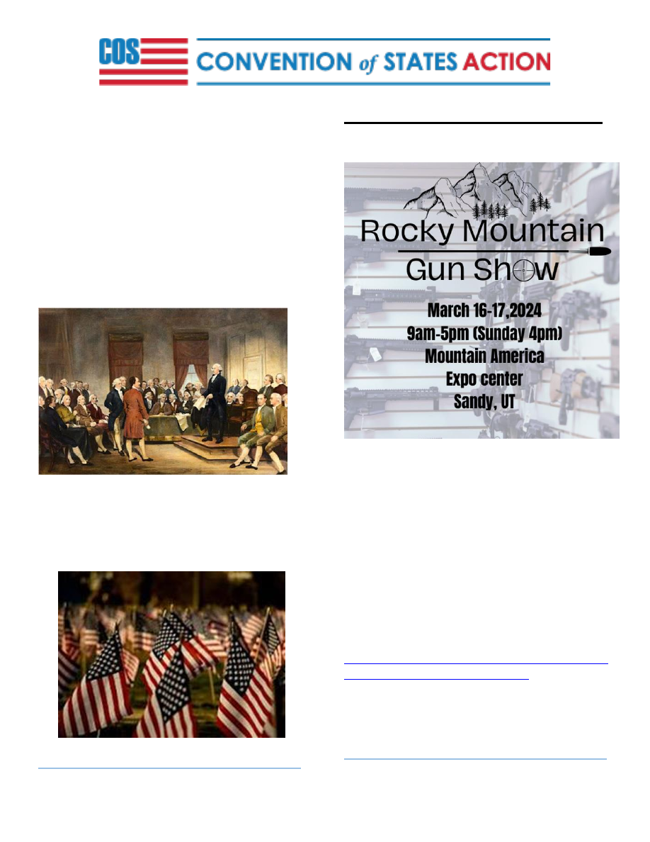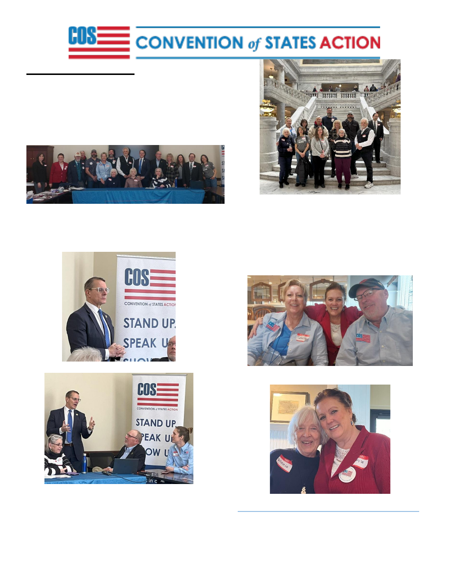 ![]() Page 1 of 7 March 2024 Utah Pioneer Patriots Newsletter Let’s Go Team Utah!! ______________________________________________________________________ COS National Update: Join Mark Meckler & experts to discuss gov. land grab agenda: A vitally important grassroots event concerning property rights and gigantic overreach by the federal government featuring COSA co-founder and president Mark Meckler and experts in land policy is taking place on the evening of February 28. The “30×30 Agenda” event will examine a climate policy executive order issued in Jan. 2021 by the Biden administration which directs various agencies of the executive branch to take steps to “conserve” at least 30% of U.S. land and resources by 2030 – 50% by 2050. Read The Full Story Here _____________________________________ COS Nat ’l Last Month: We are getting close - Idaho officially filed the COS Resolution and then swiftly held a hearing with passionate testimonies from Senator Rick Santorum and a room full of grassroots supporters, ultimately passing the legislation through committee with a vote of 6-3. We are getting close! In a noteworthy development, Massachusetts is once again embracing its historical legacy as the cradle of American liberty. The joint committee on Veterans & Legal Affairs in MA, composed of 13 Democrats and 3 Republicans, has successfully voted in favor of the COS Resolution! This significant achievement underscores our ability to bridge political divides and gain support from legislators on both sides of the aisle — unity that will be essential when it comes time to call the Convention and propose amendments with broad enough support to be ratified by 38 states. The Convention of States movement is becoming a unifying force among Americans, bringing “ We the People” together to pursue our shared objective of reining in the federal government's corruption and protecting the precious freedom that defines our great nation. _____________________________________ ![]() Page 2 of 7 Utah March 2024 Update: Please join us for the caucus of your choice - Primaries in Utah Republican Party events : Mar 5 – Jun 25, 2024 Utah Primaries - President Tuesday, March 5, 2024 PRECINCT PORTAL Precinct Portal – Neighborhood Caucus Night Resources Democratic Party events … Mar 5 – Jun 25, 2024 Utah Primaries - President Tuesday, March 5, 2024 Caucus Night - Utah Democrats _____________________________________ Utah March 2024 Continued: Please join us for our monthly COS Utah In-Person meetings: Salt Lake County In-Person meeting: Date: Wednesday, March 13th Location: South Jordan Library, 10673 South Redwood Road, South Jordan, Utah Time: 7:00 to 8:30 pm If you have any questions regarding the Salt Lake County meetings please contact: Scott at 801-918-9238, Mary at 801-518-2290, or Debra at 801-971-4534. Utah County In-Person meeting: Date: Wednesday, March 13th Location: American Fork Library, study room #2, 64 South 100 East, AF, Utah Time: 6:30 to 8:00 pm If you have any questions regarding the Utah County meetings please contact: Nichole at 210-307-8026, or Maurine at 801-636-8659. ![]() Page 3 of 7 We all want to be respectful of your time and just keep it to an hour or so, but if you would like to stay longer and chat that would be great. These will be groups of likeminded people meeting together to discuss our ideas on how to progress the COS grass roots movement here in Utah, utilizing COS volunteers and Article V of our divinely inspired constitution. We will have some lively conversations about freedom and the love we have for our country and constitution. How can you help? If you have scheduled your House District (HD) In-Person meetings and would like to announce them in the COS monthly newsletter just let me know. Thank you -Debra _____________________________________ Utah March 2024 Continued: Please join us at the COS Utah booth at the Rocky Mountain Gun Show: Mountain America Expo Center 9575 South State Street Sandy, Utah It’s fun to visit with our fellow patriots at our COS Utah booth. Saturday, March 16 th at 9:00 am to 5:00 pm Please join us for dinner after the Saturday show at Crown Burger just across the street, 9604 State St., Sandy, Utah Sunday, March 17 th at 9:00 am to 4:00 pm Please sign up to help us with a shift or two at our COS Utah booth on this Sign-Up Genius link: https:%%//%%www.signupgenius.com/go/10C0F4AAA\\ AC2CA4FFCF8-48287432-rocky If you have any questions regarding this event please contact: Scott at 801-918-9238, Mary at 801-518-2290, or Debra at 801-971-4534. _____________________________________ ![]() Page 4 of 7 Utah Last Month: We held our annual COS Utah State Capitol Rally – Tuesday, February 13 th , 2024 at the Utah Capital in the Seagull room in the Senate building 9:00 am to 11:30 am. Left to right: Karen Schuster, Nat’l. Reg. Director; Mary Wenner, SGC; William Wilson; Bill Marek; Mark Pingeton; Debra; Sean Mckenzie, Reg. Captain; Bill Misrasi; Rep. Ken Ivory, Scott Pratt, SD; Stacey Petric; Debbie Norris; Brian Wallenberg; Jolene Phelps. Seated left to right: Winnie Cain; Maurine Miles; Barbara Metaxas. We even had Rep. Ken Ivory visit with our group and answer questions. And then Rep. Ken Ivory and his intern, Miranda arranged a tour for our group of the Utah Capital. Top Row: Sean McKenzie, Reg. Captain; Mark Pingeton; Brian Wallenberg. Center Row: Debra, Karen Schuster, Nat’l. Reg. Director; Bill Marek; Stacey Petric; Bill Misrasi. Front Row: Winnie Cain; Jolene Phelps; Debbie Norris; Barbara Metaxas. After our visit to the Utah State Capital, the tour, and letters to our Legislators - A group of us went to lunch together to continue the fun day of friendship and discussion of our beloved country. Debra, Mary Wenner, SGC; Scott Pratt, State Director Winnie Cain and Mary Wenner. _____________________________________ ![]() Page 5 of 7 Legislative Liaison: Be sure to contact your Legislators – YOU ARE THE BOSS!! Act lik