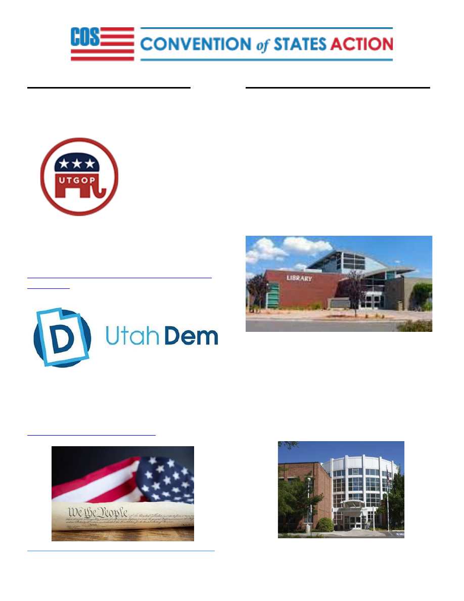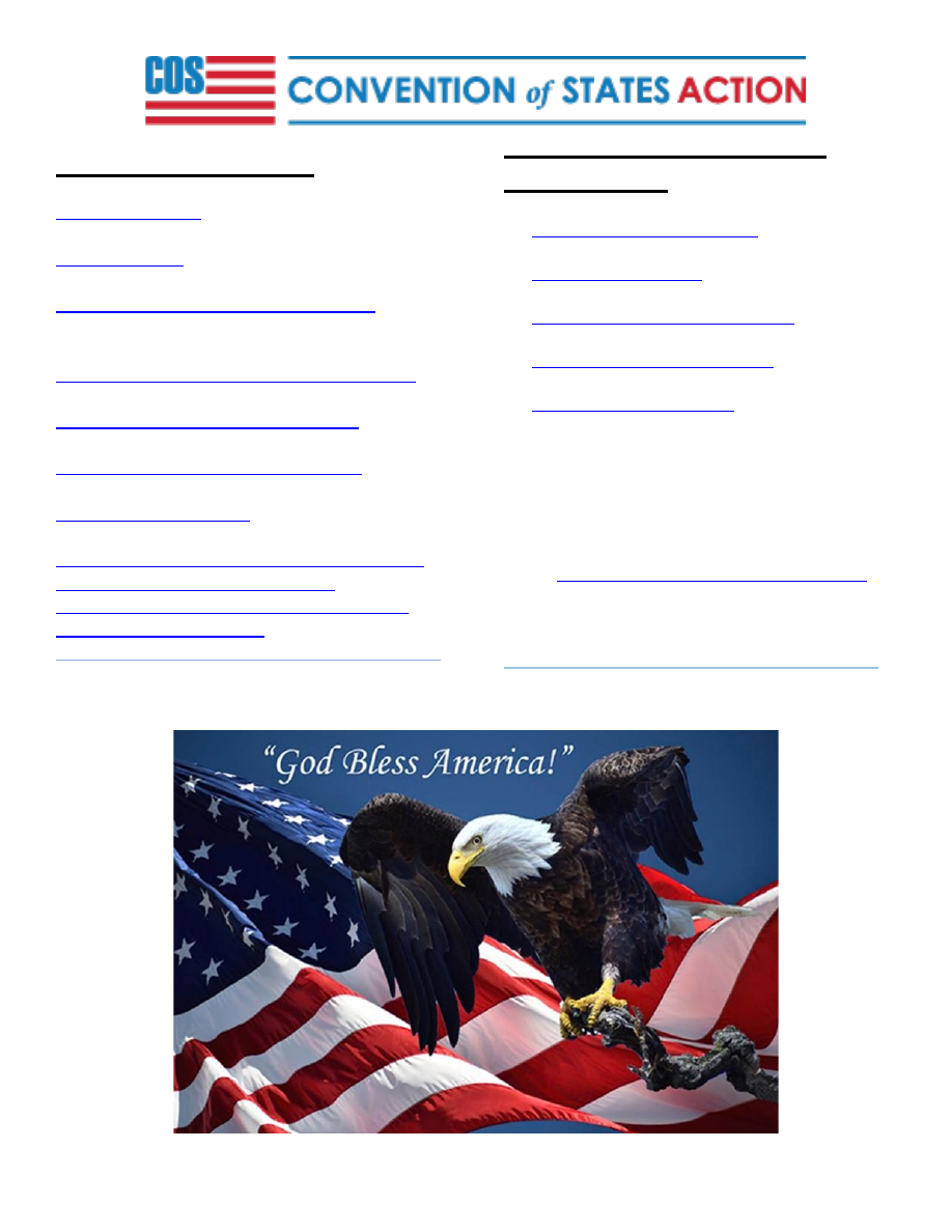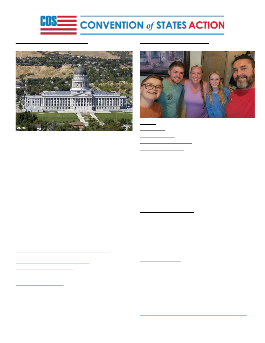 ![]() Page 1 of 7 March 2024 Utah Pioneer Patriots Newsletter Let’s Go Team Utah!! ______________________________________________________________________ COS National Update: Join Mark Meckler & experts to discuss gov. land grab agenda: A vitally important grassroots event concerning property rights and gigantic overreach by the federal government featuring COSA co-founder and president Mark Meckler and experts in land policy is taking place on the evening of February 28. The “30×30 Agenda” event will examine a climate policy executive order issued in Jan. 2021 by the Biden administration which directs various agencies of the executive branch to take steps to “conserve” at least 30% of U.S. land and resources by 2030 – 50% by 2050. Read The Full Story Here _____________________________________ COS Nat ’l Last Month: We are getting close - Idaho officially filed the COS Resolution and then swiftly held a hearing with passionate testimonies from Senator Rick Santorum and a room full of grassroots supporters, ultimately passing the legislation through committee with a vote of 6-3. We are getting close! In a noteworthy development, Massachusetts is once again embracing its historical legacy as the cradle of American liberty. The joint committee on Veterans & Legal Affairs in MA, composed of 13 Democrats and 3 Republicans, has successfully voted in favor of the COS Resolution! This significant achievement underscores our ability to bridge political divides and gain support from legislators on both sides of the aisle — unity that will be essential when it comes time to call the Convention and propose amendments with broad enough support to be ratified by 38 states. The Convention of States movement is becoming a unifying force among Americans, bringing “ We the People” together to pursue our shared objective of reining in the federal government's corruption and protecting the precious freedom that defines our great nation. _____________________________________ ![]() Page 2 of 7 Utah March 2024 Update: Please join us for the caucus of your choice - Primaries in Utah Republican Party events : Mar 5 – Jun 25, 2024 Utah Primaries - President Tuesday, March 5, 2024 PRECINCT PORTAL Precinct Portal – Neighborhood Caucus Night Resources Democratic Party events … Mar 5 – Jun 25, 2024 Utah Primaries - President Tuesday, March 5, 2024 Caucus Night - Utah Democrats _____________________________________ Utah March 2024 Continued: Please join us for our monthly COS Utah In-Person meetings: Salt Lake County In-Person meeting: Date: Wednesday, March 13th Location: South Jordan Library, 10673 South Redwood Road, South Jordan, Utah Time: 7:00 to 8:30 pm If you have any questions regarding the Salt Lake County meetings please contact: Scott at 801-918-9238, Mary at 801-518-2290, or Debra at 801-971-4534. Utah County In-Person meeting: Date: Wednesday, March 13th Location: American Fork Library, study room #2, 64 South 100 East, AF, Utah Time: 6:30 to 8:00 pm If you have any questions regarding the Utah County meetings please contact: Nichole at 210-307-8026, or Maurine at 801-636-8659. ![]() Page 3 of 7 We all want to be respectful of your time and just keep it to an hour or so, but if you would like to stay longer and chat that would be great. These will be groups of likeminded people meeting together to discuss our ideas on how to progress the COS grass roots movement here in Utah, utilizing COS volunteers and Article V of our divinely inspired constitution. We will have some lively conversations about freedom and the love we have for our country and constitution. How can you help? If you have scheduled your House District (HD) In-Person meetings and would like to announce them in the COS monthly newsletter just let me know. Thank you -Debra _____________________________________ Utah March 2024 Continued: Please join us at the COS Utah booth at the Rocky Mountain Gun Show: Mountain America Expo Center 9575 South State Street Sandy, Utah It’s fun to visit with our fellow patriots at our COS Utah booth. Saturday, March 16 th at 9:00 am to 5:00 pm Please join us for dinner after the Saturday show at Crown Burger just across the street, 9604 State St., Sandy, Utah Sunday, March 17 th at 9:00 am to 4:00 pm Please sign up to help us with a shift or two at our COS Utah booth on this Sign-Up Genius link: https:%%//%%www.signupgenius.com/go/10C0F4AAA\\ AC2CA4FFCF8-48287432-rocky If you have any questions regarding this event please contact: Scott at 801-918-9238, Mary at 801-518-2290, or Debra at 801-971-4534. _____________________________________ ![]() Page 4 of 7 Utah Last Month: We held our annual COS Utah State Capitol Rally – Tuesday, February 13 th , 2024 at the Utah Capital in the Seagull room in the Senate building 9:00 am to 11:30 am. Left to right: Karen Schuster, Nat’l. Reg. Director; Mary Wenner, SGC; William Wilson; Bill Marek; Mark Pingeton; Debra; Sean Mckenzie, Reg. Captain; Bill Misrasi; Rep. Ken Ivory, Scott Pratt, SD; Stacey Petric; Debbie Norris; Brian Wallenberg; Jolene Phelps. Seated left to right: Winnie Cain; Maurine Miles; Barbara Metaxas. We even had Rep. Ken Ivory visit with our group and answer questions. And then Rep. Ken Ivory and his intern, Miranda arranged a tour for our group of the Utah Capital. Top Row: Sean McKenzie, Reg. Captain; Mark Pingeton; Brian Wallenberg. Center Row: Debra, Karen Schuster, Nat’l. Reg. Director; Bill Marek; Stacey Petric; Bill Misrasi. Front Row: Winnie Cain; Jolene Phelps; Debbie Norris; Barbara Metaxas. After our visit to the Utah State Capital, the tour, and letters to our Legislators - A group of us went to lunch together to continue the fun day of friendship and discussion of our beloved country. Debra, Mary Wenner, SGC; Scott Pratt, State Director Winnie Cain and Mary Wenner. _____________________________________ ![]() Page 5 of 7 Legislative Liaison: Be sure to contact your Legislators – YOU ARE THE BOSS!! Act lik