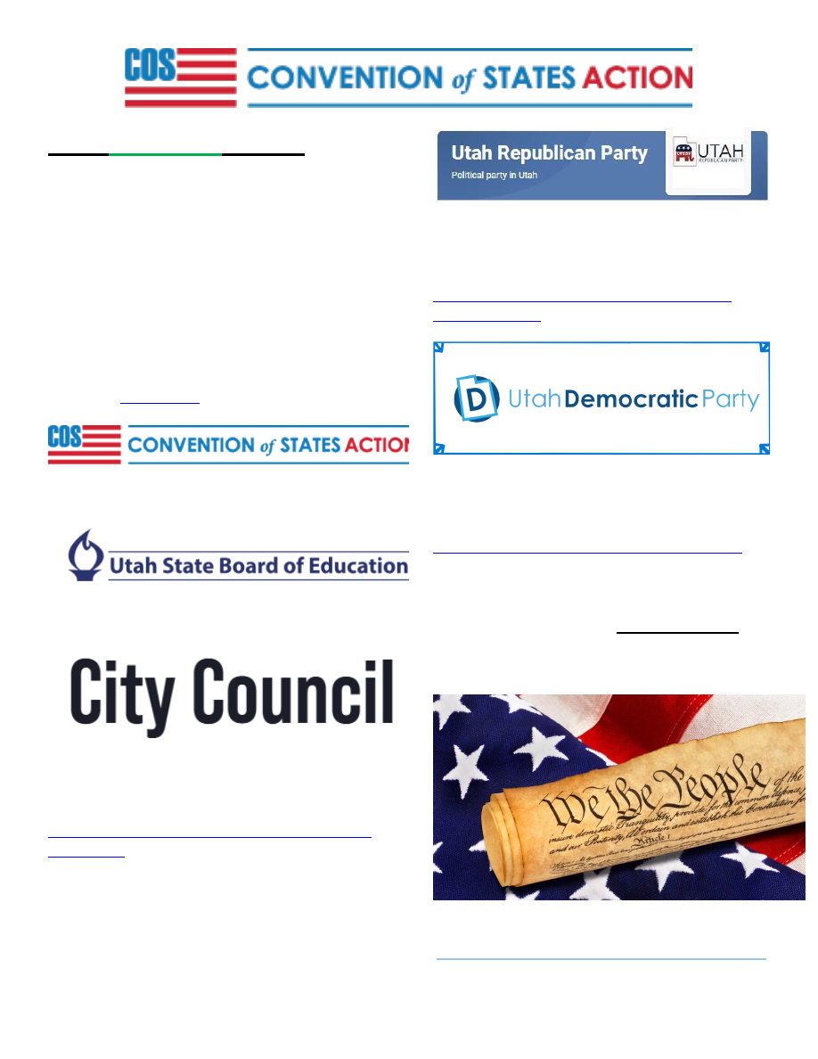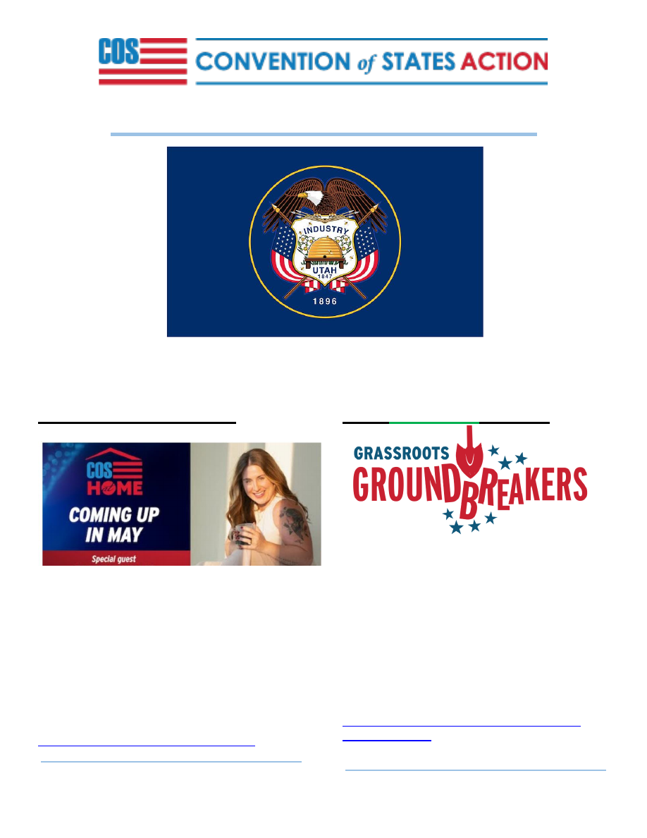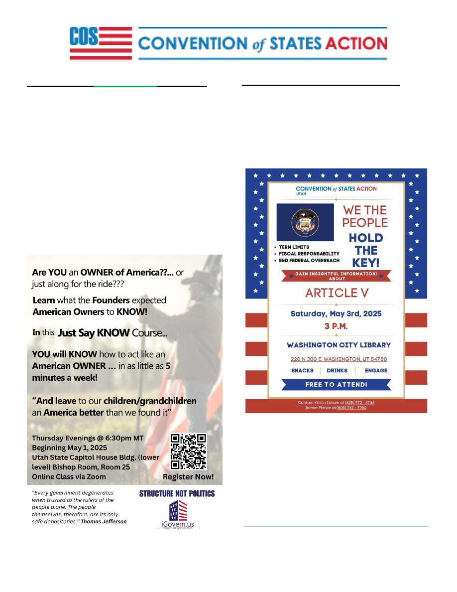 ![]() Page 1 of 8 May 2025 Utah Pioneer Patriots Newsletter Let’s Go Team Utah!! ______________________________________________________________________ COS National Update: COS @ Home With Blake Guichet (May 2025) Date: Wednesday, May 7, 2025 Time: 6:00 pm MTN (8:00 pm EST .) Join Jonathan Viaud and his special guest, Blake Guichet (May 2025). Bestselling author of “The Crappy Christian,” proud southerner, homeschool mom, history nerd, and host of The Speakeasy podcast. Here is the link to view COS at Home on May 7 th , 2025: https://conventionofstates.com/athome _____________________________________ COS May 2025 Update: Grassroots Groundbreakers is a 30-minute podcast hosted by Mike Ruthenberg, Chief Grassroots Officer for Convention of States, to activate, engage, and inspire patriots on the front lines of the battle for Article V! Join us every third Friday of the month for education, initiative, and inspiration as we get equipped to build the largest army of self- governing, grassroots activists in American history! https:%%//%%conventionofstates.com/grassroots-\\ groundbreakers . _____________________________________ ![]() Page 2 of 8 COS Utah May 2025 Update: “Just Say Know” with Representative Ken Ivory Date: starting Thursday, May 1st Time: 6:30 pm MTN Location: Utah State Capitol House Bldg.(lower level) Bishop Room, Room #25 Or Online class via Zoom Be sure to register with the QR code below: Southern Utah In-Person COS multi-Utah House District (HD) meeting Date : Saturday, May 3rd, 2025 Location: Washington City Library, 220 North 300 East, Washington, Utah Time: 3:00 to 4:00 pm – This will be a group of likeminded people meeting together to discuss our ideas on how to progress the COS grass roots movement here in Utah, utilizing COS volunteers and Article V of our divinely inspired constitution. If you have any questions regarding this meeting please contact: Kristin Isham at (435) 772-4734 or Jolene Phelps at (808) 747-7900. _____________________________________ ![]() Page 3 of 8 Utah May 2025 Article: Hello Utah patriots. Caucuses in Utah are an important part of our republic. Staying in touch with your neighbors regarding our constitutional freedom is vital to keeping our republic. We all need to do our part. The best we can do is to stay informed on our current events in Utah and nationally. Convention of states is a great resource to stay involved: COSAction Get involved in your local school boards. City and county councils. Attend their monthly meetings. Always be an informed voter. To keep our republic, it is vital to attend your caucus meetings. Here is a link for more Information: Precinct Portal – Neighborhood Caucus Night Resources Our state and county convention are coming up if you have been elected by your precinct to be a delegate please put these dates on your calendar: Saturday, May 17, 2025 - State republican Convention registration begins at 10:30 Location: UVU University in Utah county: 2025 Organizing Convention Registration- \\ Utah GOP new Saturday, May 31, 2025 - Utah Democratic Party for the 2025 Organizing Convention Location: Ogden High School in Ogden, Utah State Convention — Utah Democratic Party Caucus meetings with your precinct are the best way to stay in touch with your neighbors. Please consider hosting a caucus cottage meeting and keeping our Grassroots movement alive and active in Utah. _____________________________________ ![]() Page 4 of 8 COS Transitioning to Zulip : COS National is transitioning from Slack to Zulip. Here is the link for the Utah Zulip site: https://utah.zulip.conventionofstates.com/ https:%%//%%rumble.com/v5hzb8l-exploring-zulip-for-\\ efficient-communication.html If you are having difficulty getting your teams on Zulip , we now have several people we can call on to make that happen. If you need help, reach out to your RD and they can hook you up with assistance! For our state - Utah, our contact will be Susan Sigler ! Let's get our teammates on so we can make it the great communication tool it can be. We would like to see a more robust participation with this new format. Using the Zulip App is much easier than trying to work in a browser. Help your teams use the platform in the most effective way, have them download the app here: https://zulip.com/ _____________________________________ ![]() Page 5 of 8 Legislative Liaison: Be sure to contact your Legislators – YOU ARE THE BOSS!! Act like it!!! Elected officials represent our community and our interests, so let them know who you are and what you care about! Take time to introduce yourself and your organization to public officials serving your community – including both federal and state representatives. Make an appointment and discuss: 1- Their stance on Convention of States. 2- What Bills they are working on that COS could possibly get behind and support. 3- Notify your District Captain, or Regional Captain, or Legislative Liaison with the results after contacting them. Contact Your Government Official| | Utah.gov Contact the House | Utah House of \\ Representatives (utleg.gov) Utah State Legislative District Maps District Map (utah.gov) by Nichole Klosowiak Legislative Liaison Utah _____________________________________ Utah Veterans Update: Welcome to all our Veterans! Thank you for your service to all our citizens and our beloved country! Brett Kulbis, National Veterans Coalition Director _____________________________________ ![]() Page 6 of 8 Training Events: We're excited to invite you to our monthly Grassroots Leadership Focus session, happening on the second Tuesday of each month. Time: 7:00 PM MTN and 9:00 PM EST Where: meetn.com/coswebinar We'll have great training each month and provide updates on our transition from Slack to Zulip— our Chief Technology Officer, Simon Percival, will be on hand to answer any questions and offer clarity. **Submit a question by completing this \\ survey!** Submitted survey questions will receive priority! 