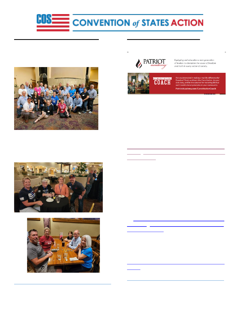 ![]() Page 1 of 7 October 2023 Utah Pioneer Patriots Newsletter Let’s Go Team Utah!! ______________________________________________________________________ COS National Update: When we launched Convention of States, our goal was clear: to create the most formidable grassroots army in America, strategically positioned in every state and congressional legislative district. Today, we proudly stand as America's largest grassroots network, covering every legislative district in the nation. But with this honor comes a great responsibility: to advocate for and pass crucial state-level legislation that aligns with our grassroots values. Unlike political parties that only mobilize volunteers before elections, we recruit, train, and deploy activists year-round, committed to long-term action. Here are some examples of what our dedicated activists have achieved: Louisiana: Our grassroots team championed legislation to protect children from life-altering sex change surgeries. When the governor vetoed the bill, our team rallied, and the veto was overturned. Thanks to COS activists, the children of Louisiana are now safe from irreversible, experimental procedures. Texas: We stepped up when Harris County needed election judges to oversee polling locations that were known to have discrepancies. Our activists swiftly recruited hundreds of election judge applicants and then lobbied for election integrity bills to secure free and fair elections. Now we're replicating this project in Ohio, where we know it’s needed, proving that the grassroots can bring real change to election integrity across the nation. These stories barely scratch the surface. We've played vital roles in securing victories on school choice, election integrity, border security, and more. We've turned out the vote in various elections, including school board races and primaries. And perhaps most importantly, we’ve passed the Convention of States resolution through 19 states — with many more preparing to file and vote in the coming months. With unwavering determination, Mark Meckler President Convention of States Action _____________________________________ ![]() Page 2 of 7 COS Nat ’l Passed States: Some of the Passed States came together for a Regional Summit in Kansas City, MO. on Saturday, September 30, 2023. We had some great COS passed States Leaders there sharing ideas on how to best help our states and our beloved country. We had breakout sessions on: - Building and Sustaining Success - Responding to rescission efforts - Recruitment Where we shared some great ideas and did some good brainstorming. Debra, Joyce, Nichole and Jonathan Dave, Debra, Debbie, Jim, and Ramona _____________________________________ Utah October Update: COS Utah will be attending in partnership with Patriot Academy - Constitution Coach Training Just Say KNOW , YOU Are the Answer to what Ails America With Rick Green and Rep. Ken Ivory Location: Paradigm School, 11577 South 3600 South, South Jordan, Utah Date: Saturday, October 7 , 2023 Time : 1:00 to 4:00 pm Please click this link to register: https:%%//%%www.patriotacademy.com/coach/registe\\ r/7171 ( https:%%//%%www.patriotacademy.com/coach /register/7171 ) And Fireside - How to Defend Our Divinely Inspired Constitution With Rick Green and Rep. Ken Ivory Location: Paradigm School, 11577 South 3600 South, South Jordan, Utah Date: Saturday October 7 , 2023 Time: 7:00 to 8:30 pm Please click this link to register: UT https:%%//%%www.patriotacademy.com/coach/regi ster/7177 ( https:%%//%%www.patriotacademy.com/co ach/register/7177 ) And Here is the link for the 7-week class that is starting October 11, 2023 : Please click this link to register. https:%%//%%www.patriotacademy.com/coach/registe\\ r/7170 _____________________________________ ![]() Page 3 of 7 Utah Last Month: At the Salt Lake County meeting last month – Wednesday, September 13, 2023 – We had good discussions on the Constitution and writing cards/letters to our state/local Representatives and letting them know how we want them to represent us and our values. Can you write your state/local Representative? Here is a link to help you if you don’t know who it is - Utah State Legislative District Maps District Map (utah.gov) We even had a great surprise visit from Ken Ivory, Representative of HD 39, here in Salt Lake County. Ken Ivory currently has 316 constitutes that are COS supporters, so we are a good organization that he knows he needs to go talk with. We would like to challenge ALL of our Utah state/local Representatives to come and visit with their COS constitutes at our COS In- Person meetings. Feel free to email me and we can get it scheduled: debra.peterson.warnas@cosaction.com < > Jared Lyman, District Captain in HD 70 participated in the Fall Festival in Redmond, Utah by having a COS table. Jared did a great job at this event! Thank you Jared!!! Jared Lyman, District Captain HD-70 If you are having an In-Person meeting or have a COS table at a local event you are helping with please let us know so we can get it on everyone ’s calendar, and in our state newsletter. Be sure to let me know the dates and please send me pictures. Thank you! Constitution Day – Sept. 17th Each year, on September 17th , Americans celebrate Constitution Day! The Constitution was written during the Philadelphia Convention —now known as the Constitutional Convention —which convened from May 25 to September 17, 1787. It was signed on September 17, 1787. _____________________________________ ![]() Page 4 of 7 Legislative Liaison: Be sure to contact your Legislators - Elected officials represent our community and our interests, so let them know who you are and what you care about! Take time to introduce yourself and your organization to public officials serving your community – including both federal and state representatives. Make an appointment and discuss: 1- Their stance on Convention of States. 2- What Bills they are working on that COS could po