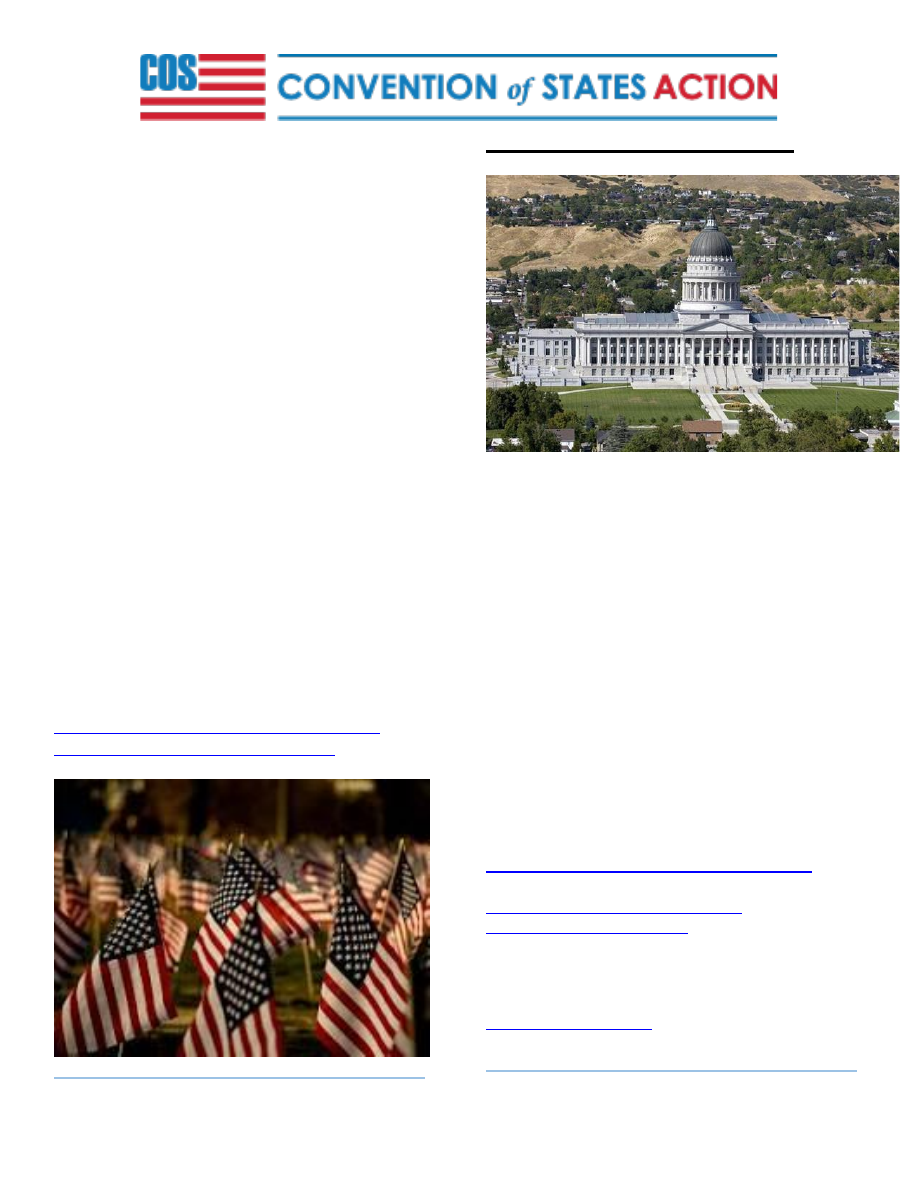 ![]() Page 1 of 7 September 2022 Utah Pioneer Patriots Newsletter Let’s Go Team Utah!! ______________________________________________________________________ COS National Update: On September 17 , 2022, is Constitution Day ! Also known as Citizenship Day, Constitution Day is an American holiday honoring the day 39 (our Founding Fathers) delegates to the Constitutional Convention signed the United States Constitution. This historic date was September 17, 1787. It has been 235 years since the signing. What do people do to celebrate Constitution Day ? Schools and libraries observe this day by having special educational programs and activities which help students learn about the Constitution. They study subjects like the history of the Constitution, the many important amendments, and the Bill of Rights. Do you know who wrote the Constitution? James Madison is known as the Father of the Constitution because of his pivotal role in the document's drafting as well as its ratification. Do you know who signed the Constitution first? George Washington , as president of the Convention, signed first, followed by the other delegates, grouped by states in progression from north to south. Constitution Day is important because it is crucial that American citizens remember what the Founding Fathers went through to create the United States of America. That includes many privileges that other countries do not have. ![]() Page 2 of 7 Did you know that there is a Federal Law that requires schools and Government Agencies to teach the Constitution on September 17 of each year? SEC. 111. (1,2,b) The head of each Federal agency or department shall- (1) provide each new employee of the agency or department with educational and training materials concerning the United States Constitution …. and (2) provide educational and training materials concerning the United States Constitution ….. (b) Each educational institution that receives Federal funds for a fiscal year shall hold an educational program on the United States Constitution …. Since September 17 is on a Saturday this year Constitution Week will be September 17 thru September 24, 2022. When classes/presentations can be held or any day in September 2022. In conjunction with Convention of States (COS) and Patriot Academy we want the Constitution to be taught in every school and every congregation across our beautiful nation. Here is a link to some great tools to help you prepare and do a presentation for Constitution Day : Class Marketing Materials – Biblical Citizenship – Constitution Coach (patriotacademy.com) _____________________________________ COS Utah Sept. Update: Your homework for September 2022 is to contact your Legislator. Elected officials represent our community and our interests, so let them know who you are and what you care about! Take time to introduce yourself and your organization to public officials serving your community – including both federal and state representatives. Make an appointment and discuss: 1- Their stance on Convention of States. 2- What Bills they are working on that COS could possibly get behind and support. 3- Notify your District Captain, or Regional Captain, or Legislative Liaison with the results after contacting them. Contact Your Government Official| | Utah.gov Contact the House| | Utah House of \\ Representatives (utleg.gov) Utah State Legislative District Maps (Expires January 1, 2023) District Map (utah.gov) _____________________________________ ![]() Page 3 of 7 COS Utah Sept. Continued: Constitution Day – September 17, 2022 Come celebrate Constitution Day with Convention of States (COS): Please bring your family, friends, neighbors, kids, grandkids and any volunteers you are working with. Date: Saturday , September 24, 2022 Time: 10:30 am to 12:00 pm Location: Draper Library 1136 East Pioneer Road (12450 South) Draper, Utah 84020 Large meeting room by Main Entrance Light refreshments Scott Pratt – Welcome Presentation Constitution discussions Questions & Answers (Q&A) _____________________________________ Last Month Event: Kanab, Utah – Towne Hall – Thursday, August 25, 2022, at 7:00 pm in the Kanab City Library 374 North Main Street, Kanab City, Utah We had about 20 prominent members of the Kanab community in attendance. Wolfgang Ziegler and Bill Pressgrove presenting. _____________________________________ ![]() Page 4 of 7 Monthly Spotlight: Name: Wolfgang Ziegler COS Title: COS Georgia Legislative Liaison City raised in: Grayslake Illinois City current living in: Savannah, Georgia and soon Kanab, (Utah has already adopted him) Favorite Hobbies: Shooting sports, pistols, long range rifle, trap and skeet. What brought you to COS (Your Why): I came to COS because COS is actually doing something legislatively to create change. Far too many organizations complain, valid complaints in many cases, but other than making those complaints heard, do nothing to change what they are complaining about. Seeking to pass the COS initiative legislatively shows strength and a level of organization which politicians take notice of, and if they don’t it’s to their detriment. In passed states, exercising the ability to help pass legislation that not only further emphasizes COS’s strength but shows our determination in seeking a return to representative government, along with our determination in citizens for self-governance. I was also tired of yelling at the television, waiting for others to do something, when it’s really my responsibility as a citizen who loves their country. I’m sick and tired of the lethargy of the overwhelming number of otherwise patriotic Americans, and I have always been taught to, see a problem, be part of the solution. Inspirational thought: Excuses are the nails that hold together the house of failure. More about You: I was a professional airline pilot for Pan Am and then transitioned into law enforcement. _____________________________________ Utah Veterans Update: Welcome 