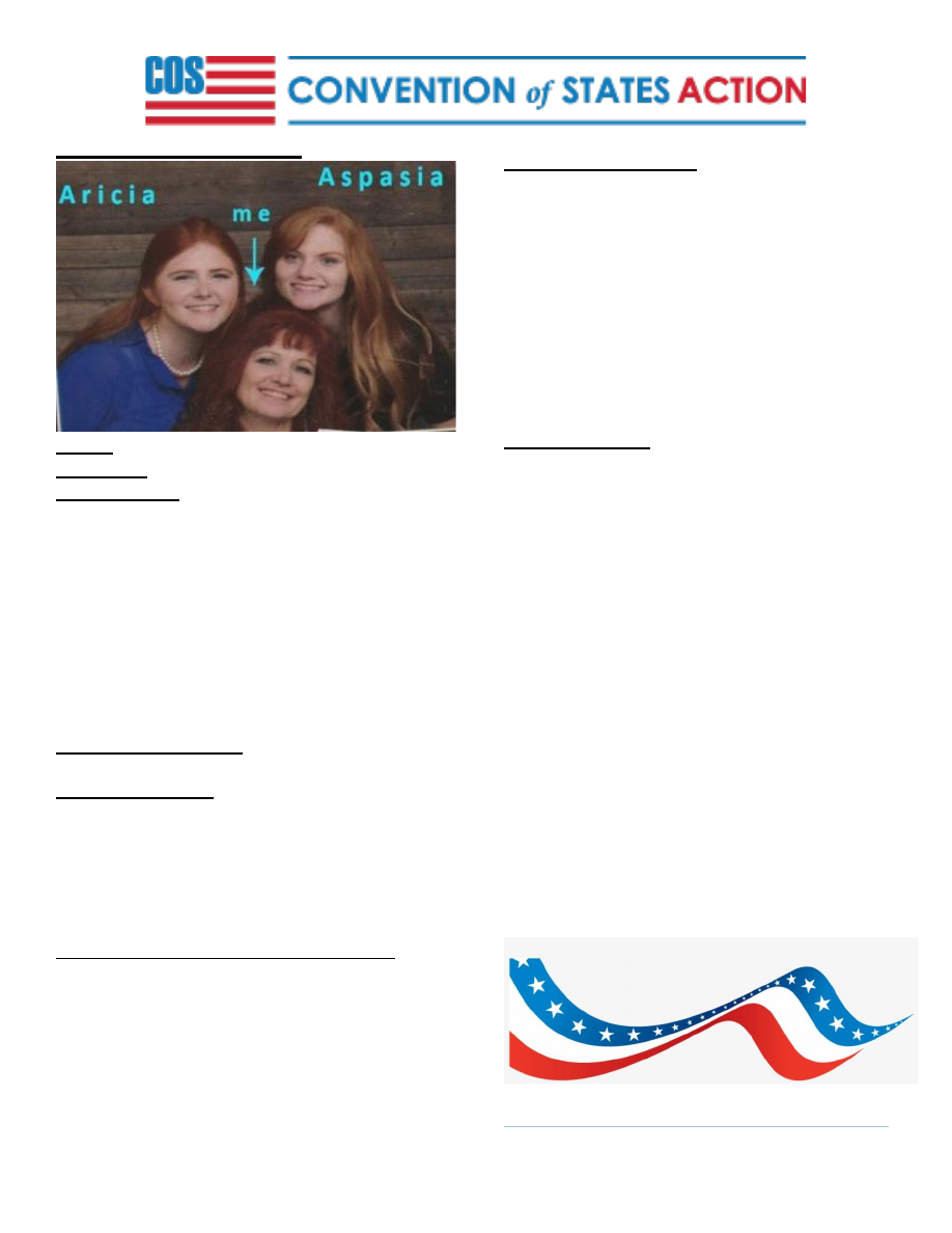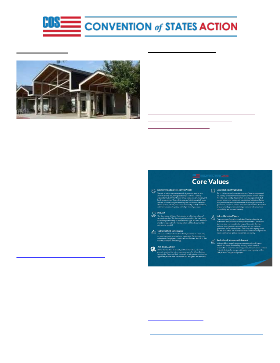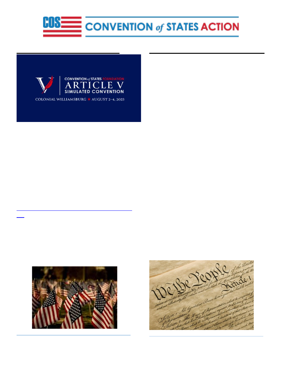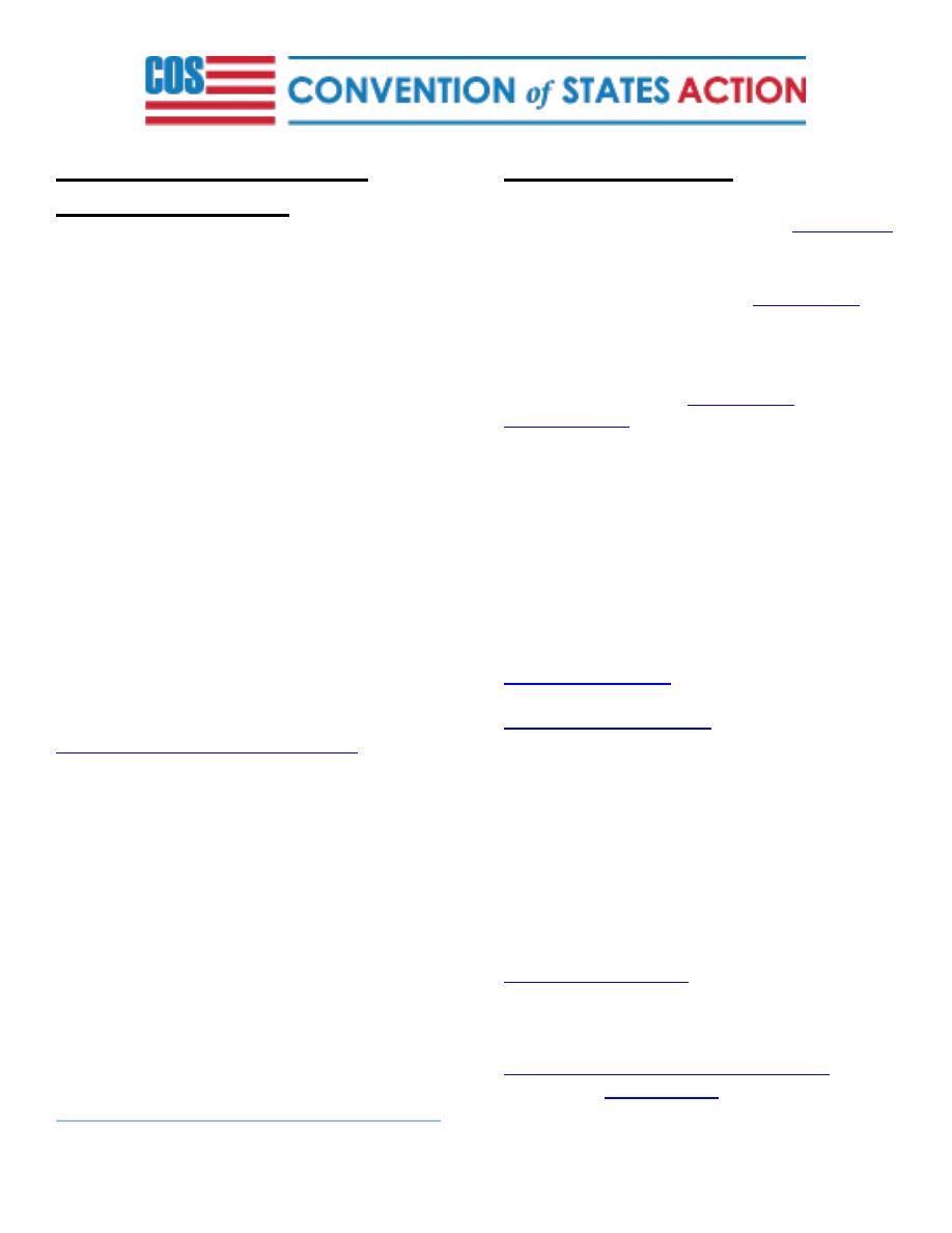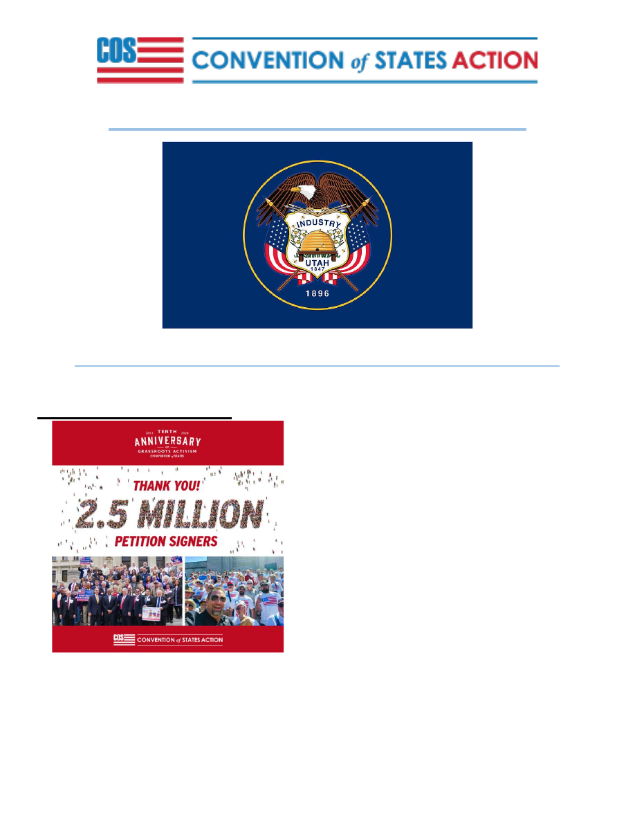 ![]() Page 1 of 7 September 2023 Utah Pioneer Patriots Newsletter Let’s Go Team Utah!! ______________________________________________________________________ COS National Update: At Convention of States, we have 5,410,562 supporters and activists, 2,502,275 petition signers, and 239,302 highly engaged activists and activist leaders. These are not just numbers; Every supporter, every signature, every activist believes that our Constitution is worth fighting for and that our nation's future should be shaped by “WE the people,” not the political elites. Perhaps even more impressive, those 2.5 million petition signers I mentioned above - They're spread across every single statehouse district in America and span every nationality and political orientation. In the midst of this crucial battle we're in, COS is actively educating and nurturing relationships with state legislators, vigilantly tracking resolutions through the legislative process. We participate in state and even national conference calls. We rally grassroots supporters and encourage everyday patriots to amplify their voices and call for an Article V Convention. Mark Meckler President COS Action ![]() Page 2 of 7 COS National Last month: On August 2-4, 2023, Convention of States Foundation hosted an Article V Simulated Convention in Colonial Williamsburg, Virginia! This event provided a special opportunity for a new generation of statesman to test-run this constitutional process and paint a vision of what's possible. Volunteers are encouraged to host watch parties to watch/listen to the recordings: In case you missed it, here is the 2023 Simulation! https:%%//%%www.youtube.com/watch?v=YeJACprcA\\ FQ After the big event, we are inviting COS teams to host town halls with the commissioners so that they can share their experience. This Simulation will be remembered as a turning point in our history and the Convention of States Foundation movement! _____________________________________ Constitution Day – Sept. 17th Each year, on September 17th , Americans celebrate Constitution Day! The Constitution was written during the Philadelphia Convention —now known as the Constitutional Convention —which convened from May 25 to September 17, 1787. It was signed on September 17, 1787. George Washington, as president of the Convention, signed the Constitution first, followed by the other delegates, grouped by states in progression from north to south. James Madison, America's fourth President (1809-1817), made a major contribution to the ratification of the Constitution by writing The Federalist Papers, along with Alexander Hamilton and John Jay. In later years, he was referred to as the “Father of the Constitution.” “We the People of the United States, in Order to form a more perfect Union, establish Justice, insure domestic Tranquility, provide for the common defense, promote the general Welfare, and secure the Blessings of Liberty to ourselves and our Posterity, do ordain and establish this Constitution for the United States of America … _____________________________________ ![]() Page 3 of 7 Utah Update: We will be holding an In-Person Salt Lake County COS multi-Utah House District (HD) and Regional meeting at: Location: Sandy Library, 10100 Petunia Way, Sandy, Utah Date: September 13th (the 2nd Wednesday of each month) Time: 7:00 to 8:00 pm – We want to be respectful of your time and just keep it to an hour, but if you would like to stay longer and chat that would be great. This will be a group of likeminded people meeting together to discuss our ideas on how to progress the COS grass roots movement here in Utah, utilizing COS volunteers and Article V of our divinely inspired constitution. We will be Celebrating Constitution week!!! We will have some lively conversations about freedom and the love we have for our country and constitution. How can you help? If you have any comments or questions regarding this please feel free to contact: debra.peterson.warnas@cosaction.com < > We will be holding our In-Person Utah County COS monthly meeting: Location : American Fork Library Study Rm 2 Date: Sept. 27th . (the 4 th Wed of each month. Time: Meet & greet at 6:30, informational meeting 7:00 to 8:00 pm. COS volunteers, please come and learn more about COS, and bring interested friends! Our focus will be on the Constitution, particularly Article V. Questions? Barbara at 385-201-6839, Nichole at 210-307-8026, or Maurine at 801-636-8659. _____________________________________ Utah Last Month: In-Person recurring monthly meetings: We held a multi-House District (HD) and Regional meeting on August 9 th . We watched the “Stand” video – Here is the link if you would like to watch it or share with your family, friends, and associates: Time to stand up —The Radical Left has our country Under Siege! - COSAction \\ (conventionofstates.com) We discussed COS’s Core Values. Did you know COS had Core Values? Do you know what they are? Here they are for your review and to share with your family, friends, and associates: We discussed contacting your local state Legislator and letting them know you support Convention of States. Do you know who your local state Legislator is? You can click on the link below, put in your home address and it will show you. Utah State Legislative District Maps District Map (utah.gov) _____________________________________ ![]() Page 4 of 7 Legislative Liaison: Be sure to contact your Legislators - Elected officials represent our community and our interests, so let them know who you are and what you care about! Take time to introduce yourself and your organization to public officials serving your community – including both federal and state representatives. Make an appointment and discuss: 1- Their stance on Convention of States. 2- What Bills they are working on that COS could possibly get behind and support. 3- Notify your District Captain, or Regional Captain, or Legislative Liaison with the results afte