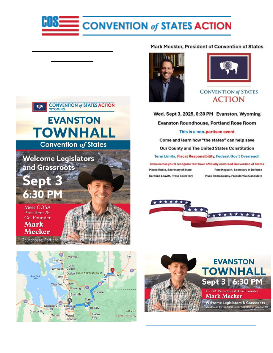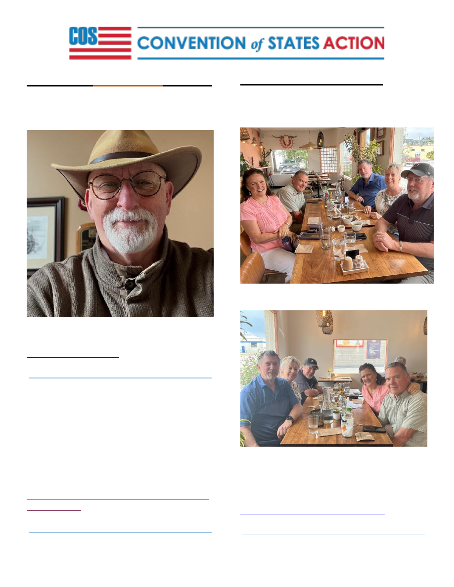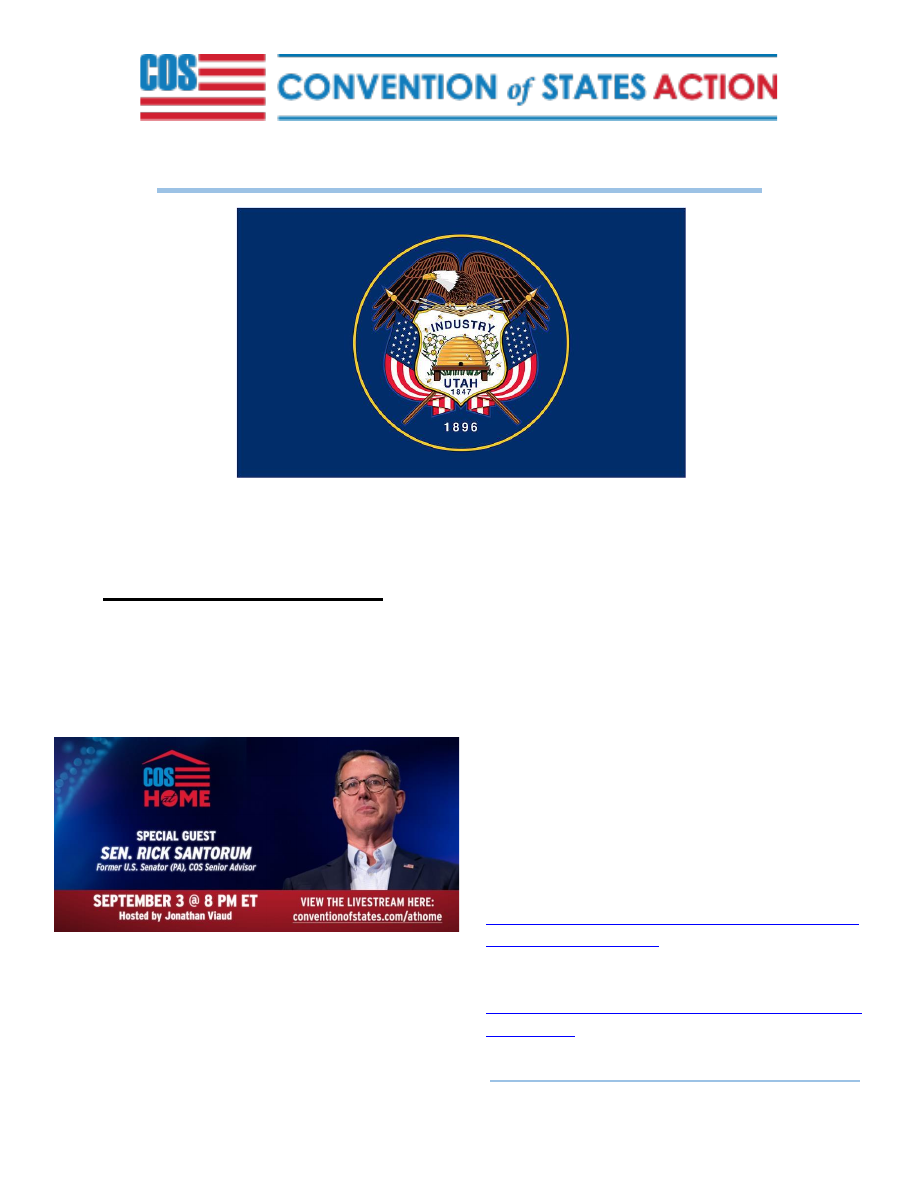 ![]() Page 1 of 8 September 2025 Utah Pioneer Patriots Newsletter Let’s Go Team Utah!! ______________________________________________________________________ COS National Update: September “COS at Home” September 3 at 6:00 pm MTN and 8:00 p.m. ET Few people in American political life have the knowledge and experience to cogently discuss public affairs at the national level and the state- by-state strategy involved in the effort to call an Article V convention as Convention of States Senior Advisor and former U.S. Senator Rick Santorum. That is why you will want to tune in to watch and listen to him on the next edition of “COS at Home”, which airs September 3 at 6:00 pm MTN and 8:00 p.m. ET Santorum will discuss his thoughts about the first seven months of President Donald Trump's second time around in the White House, provide analysis of the 2025 election cycle, and preview the “Race to Freedom” Convention of States Leadership Summit that takes place in Indianapolis in September and at which he will be a featured speaker. Hosted by Jonathn Viaud. Click here to log-in: Rick Santorum on September 3 edition of COS \\ at Home - COSAction And click this link to ask a question: https:%%//%%secure.conventionofstates.com/minutem\\ an-mailbag _____________________________________ ![]() Page 2 of 8 COS National Update Continued: Evanston, Wyoming is only a beautiful short 90 minute drive away from Salt Lake City, Utah. _____________________________________ ![]() Page 3 of 8 COS Utah Sept. 2025 Update: Utah is now in a new COS Region - It is called the “ Flyover ” Region And our new COS Regional Director will be: Dale Tipton COS Regional Director and Amateur (Ham) Radio Coalition Coordinator #KD9ZVP dtipton@cosaction.com < > 219-771-7184 _____________________________________ COS Utah monthly Zoom meeting: 2nd Wednesday of each month at 8:00 pm MTN – Statewide all COS Supporters Zoom call. Debra Peterson-Warnas is inviting you to a scheduled Zoom meeting. Topic: COS Utah Monthly Zoom meeting Date: Wednesday, September 10, 2025 Time: 08:00 PM Mountain Time Join Zoom Meeting: https:%%//%%us06web.zoom.us/j/8964513535?omn=\\ 86156587218 ** ** Meeting ID: 896 451 3535 _____________________________________ COS Utah Last month: Last month we got a few of our COS Utah team members together for a fun August lunch: Left to right: Mary & Tom Wenner, Dave & Debra Warnas, and Scott Pratt. Left to right: Dave & Debra Warnas, Scott Pratt and Mary & Tom Wenner. We had great discussions and a delicious lunch at Contento Café Healthy Mexican cuisine. Contento Cafe - South SLC, Ut. Contento Cafe - South Salt Lake, UT _____________________________________ ![]() Page 4 of 8 COS Transitioning to Zulip : COS National is transitioning from Slack to Zulip. Here is the link for the Utah Zulip site: https://utah.zulip.conventionofstates.com/ https:%%//%%rumble.com/v5hzb8l-exploring-zulip-for-\\ efficient-communication.html If you are having difficulty getting your teams on Zulip , we now have several people we can call on to make that happen. If you need help, reach out to your RD and they can hook you up with assistance! For our state - Utah, our contact will be Susan Sigler ! Let's get our teammates on so we can make it the great communication tool it can be. We would like to see a more robust participation with this new format. Using the Zulip App is much easier than trying to work in a browser. Help your teams use the platform in the most effective way, have them download the app here: https://zulip.com/ _____________________________________ ![]() Page 5 of 8 Legislative Liaison: Be sure to contact your Legislators – YOU ARE THE BOSS!! Act like it!!! Elected officials represent our community and our interests, so let them know who you are and what you care about! Take time to introduce yourself and your organization to public officials serving your community – including both federal and state representatives. Make an appointment and discuss: 1- Their stance on Convention of States. 2- What Bills they are working on that COS could possibly get behind and support. 3- Notify your District Captain, or Regional Captain, or Legislative Liaison with the results after contacting them. Contact Your Government Official| | Utah.gov Contact the House | Utah House of \\ Representatives (utleg.gov) Utah State Legislative District Maps District Map (utah.gov) by Nichole Klosowiak Legislative Liaison Utah _____________________________________ Utah Veterans Update: Welcome to all our Veterans! Thank you for your service to all our citizens and our beloved country! Brett Kulbis, National Veterans Coalition Director _____________________________________ ![]() Page 6 of 8 Training Events: Grassroots Leadership Focus Webinar Description: The Grassroots Leadership Focus Webinar is now on Zoom. Don't miss this chance to connect, collaborate, and lead with impact. We can’t wait to see you there! Date: Tuesday, September 9, 2025 Time: 07:00 PM MTN Here is the registration link for this next call: https:%%//%%us02web.zoom.us/webinar/register/WN_\\ Ltd_mQvxTQiOPZ2dlp9bDA . For America, Hosted by Ginny Rapini Mike Ruthenberg National – Basic Citizen Builder Training – Basic Citizen Builder Training is moving to the 3rd Monday and Tuesday of the Month. September will be the 15 th and 16th. We welcome you to join each month from 6:30 to 8:00 PM EST For an immersive exploration of Citizen Builder and how it works. You’re invited to an evening of team building and Citizen Builder training with Assistant Regional Directors Joyce Berry and Al Torres. Citizen Builder is an essential part of what we do here at COS, keeping our grassroots teams engaged, connected, and empowered. Consequently, it is imperative that every leader acquaints themselves with this indispensable tool and fully leverages its capabilities to drive the advancement of their state team. Here is the link for more info and how to register to attend: https:%
