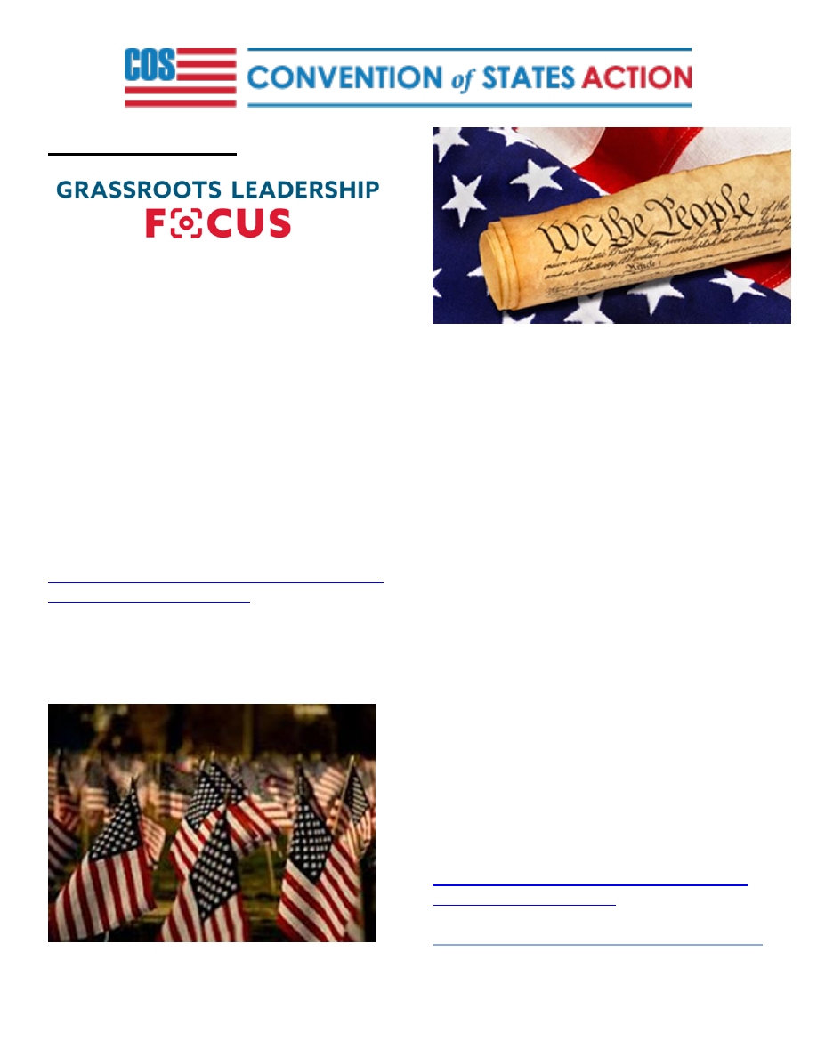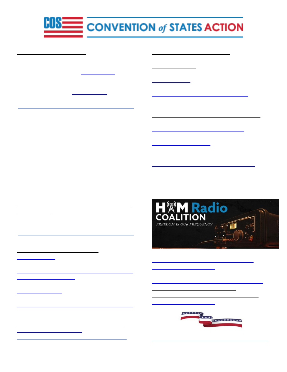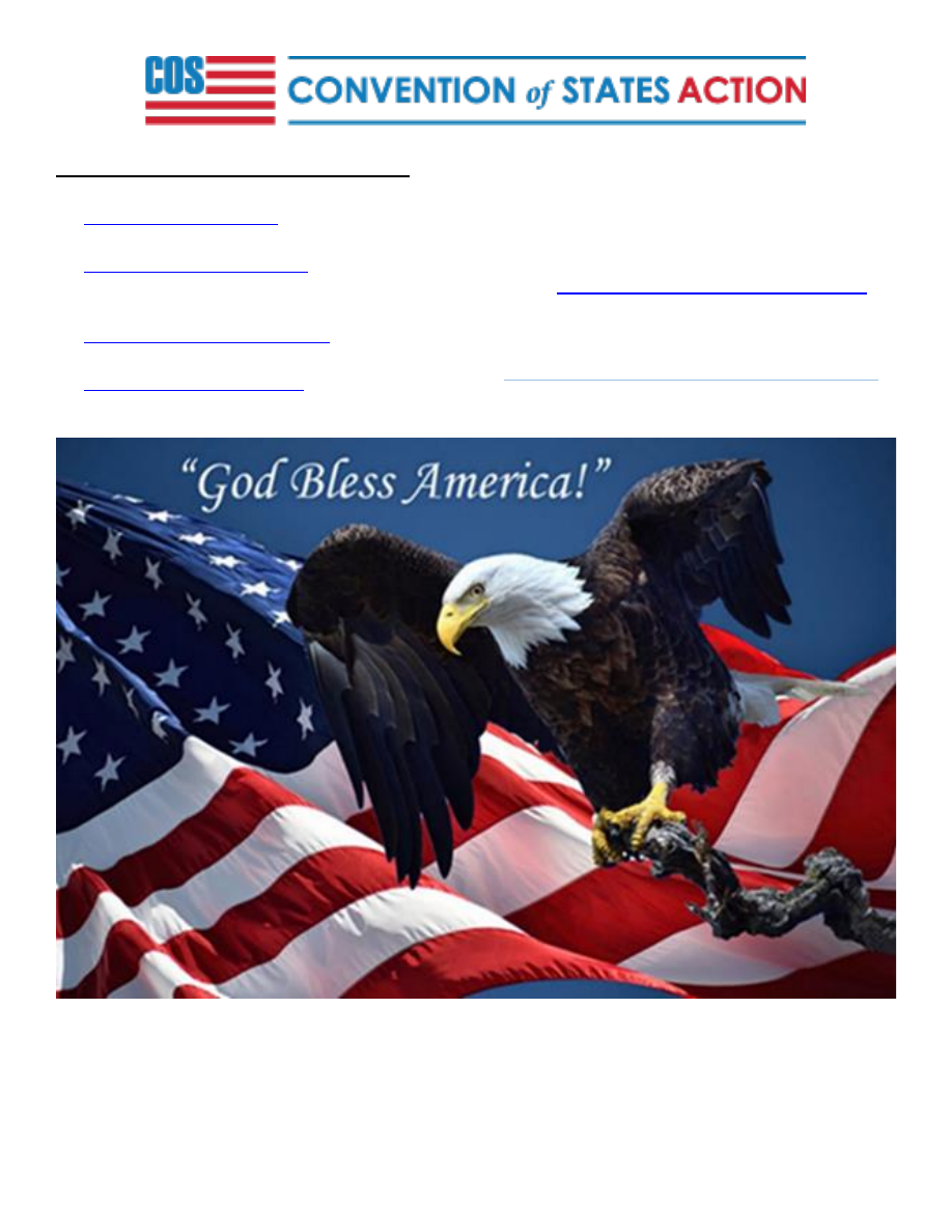 ![]() Page 1 of 8 September 2025 Utah Pioneer Patriots Newsletter Let’s Go Team Utah!! ______________________________________________________________________ COS National Update: September “COS at Home” September 3 at 6:00 pm MTN and 8:00 p.m. ET Few people in American political life have the knowledge and experience to cogently discuss public affairs at the national level and the state- by-state strategy involved in the effort to call an Article V convention as Convention of States Senior Advisor and former U.S. Senator Rick Santorum. That is why you will want to tune in to watch and listen to him on the next edition of “COS at Home”, which airs September 3 at 6:00 pm MTN and 8:00 p.m. ET Santorum will discuss his thoughts about the first seven months of President Donald Trump's second time around in the White House, provide analysis of the 2025 election cycle, and preview the “Race to Freedom” Convention of States Leadership Summit that takes place in Indianapolis in September and at which he will be a featured speaker. Hosted by Jonathn Viaud. Click here to log-in: Rick Santorum on September 3 edition of COS \\ at Home - COSAction And click this link to ask a question: https:%%//%%secure.conventionofstates.com/minutem\\ an-mailbag _____________________________________ ![]() Page 2 of 8 COS National Update Continued: Evanston, Wyoming is only a beautiful short 90 minute drive away from Salt Lake City, Utah. _____________________________________ ![]() Page 3 of 8 COS Utah Sept. 2025 Update: Utah is now in a new COS Region - It is called the “ Flyover ” Region And our new COS Regional Director will be: Dale Tipton COS Regional Director and Amateur (Ham) Radio Coalition Coordinator #KD9ZVP dtipton@cosaction.com < > 219-771-7184 _____________________________________ COS Utah monthly Zoom meeting: 2nd Wednesday of each month at 8:00 pm MTN – Statewide all COS Supporters Zoom call. Debra Peterson-Warnas is inviting you to a scheduled Zoom meeting. Topic: COS Utah Monthly Zoom meeting Date: Wednesday, September 10, 2025 Time: 08:00 PM Mountain Time Join Zoom Meeting: https:%%//%%us06web.zoom.us/j/8964513535?omn=\\ 86156587218 ** ** Meeting ID: 896 451 3535 _____________________________________ COS Utah Last month: Last month we got a few of our COS Utah team members together for a fun August lunch: Left to right: Mary & Tom Wenner, Dave & Debra Warnas, and Scott Pratt. Left to right: Dave & Debra Warnas, Scott Pratt and Mary & Tom Wenner. We had great discussions and a delicious lunch at Contento Café Healthy Mexican cuisine. Contento Cafe - South SLC, Ut. Contento Cafe - South Salt Lake, UT _____________________________________ ![]() Page 4 of 8 COS Transitioning to Zulip : COS National is transitioning from Slack to Zulip. Here is the link for the Utah Zulip site: https://utah.zulip.conventionofstates.com/ https:%%//%%rumble.com/v5hzb8l-exploring-zulip-for-\\ efficient-communication.html If you are having difficulty getting your teams on Zulip , we now have several people we can call on to make that happen. If you need help, reach out to your RD and they can hook you up with assistance! For our state - Utah, our contact will be Susan Sigler ! Let's get our teammates on so we can make it the great communication tool it can be. We would like to see a more robust participation with this new format. Using the Zulip App is much easier than trying to work in a browser. Help your teams use the platform in the most effective way, have them download the app here: https://zulip.com/ _____________________________________ ![]() Page 5 of 8 Legislative Liaison: Be sure to contact your Legislators – YOU ARE THE BOSS!! Act like it!!! Elected officials represent our community and our interests, so let them know who you are and what you care about! Take time to introduce yourself and your organization to public officials serving your community – including both federal and state representatives. Make an appointment and discuss: 1- Their stance on Convention of States. 2- What Bills they are working on that COS could possibly get behind and support. 3- Notify your District Captain, or Regional Captain, or Legislative Liaison with the results after contacting them. Contact Your Government Official| | Utah.gov Contact the House | Utah House of \\ Representatives (utleg.gov) Utah State Legislative District Maps District Map (utah.gov) by Nichole Klosowiak Legislative Liaison Utah _____________________________________ Utah Veterans Update: Welcome to all our Veterans! Thank you for your service to all our citizens and our beloved country! Brett Kulbis, National Veterans Coalition Director _____________________________________ ![]() Page 6 of 8 Training Events: Grassroots Leadership Focus Webinar Description: The Grassroots Leadership Focus Webinar is now on Zoom. Don't miss this chance to connect, collaborate, and lead with impact. We can’t wait to see you there! Date: Tuesday, September 9, 2025 Time: 07:00 PM MTN Here is the registration link for this next call: https:%%//%%us02web.zoom.us/webinar/register/WN_\\ Ltd_mQvxTQiOPZ2dlp9bDA . For America, Hosted by Ginny Rapini Mike Ruthenberg National – Basic Citizen Builder Training – Basic Citizen Builder Training is moving to the 3rd Monday and Tuesday of the Month. September will be the 15 th and 16th. We welcome you to join each month from 6:30 to 8:00 PM EST For an immersive exploration of Citizen Builder and how it works. You’re invited to an evening of team building and Citizen Builder training with Assistant Regional Directors Joyce Berry and Al Torres. Citizen Builder is an essential part of what we do here at COS, keeping our grassroots teams engaged, connected, and empowered. Consequently, it is imperative that every leader acquaints themselves with this indispensable tool and fully leverages its capabilities to drive the advancement of their state team. Here is the link for more info and how to register to attend: https:%