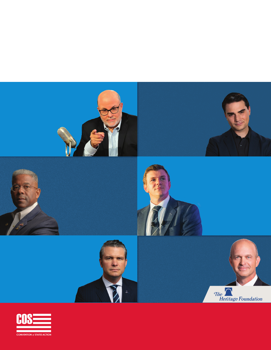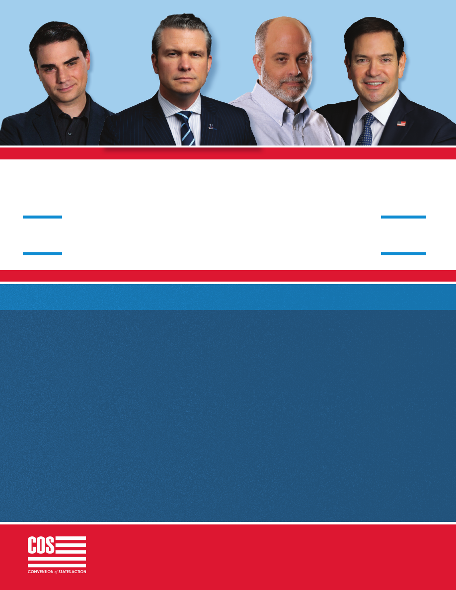 ![]() CONVENTION of STATES IS ENDORSED BY Ben Shapiro Karoline Leavitt Sen. Rand Paul Dr. Kevin Roberts Sean Hannity Kirk Cameron Lt. Col. Allen West Gov. Mike Dunleavy Gov. Sarah Palin David Horowitz Lt. Gov. Mark Robinson Sen. Jim Talent Morton Blackwell Rep. Zach Nunn Gov. Greg Abbott Sec. Pete Hegseth Charlie Kirk Gov. Mike Braun Sen. Rick Santorum Gov. Ron DeSantis Gov. Jeb Bush Rep. Louie Gohmert Rep. Tracey Mann Rep. Chip Roy Sen. Jim DeMint Rep. Eric Burlison Lawrence Jones Bob Vander Plaats Craig Haggard James O’Keefe Mark Levin Dr. James Dobson Gov. Mike Huckabee Michael Farris Rep. Mark Meadows Sen. Ben Sasse Rep. Josh Brecheen Ken Cuccinelli Lawrence Reed Dr. Dave Brat Jenna Ellis Vivek Ramaswamy Dr. Ben Carson Dave Rubin Lt. Col. Bill Cowan Sec. Marco Rubio David Barton Steve Deace Steve Hilton Rick Green Gov. Bobby Jindal Eric Metaxas Rep. Russell Fry Rep. Pat Fallon Rep. Yvette Herrell Rep. Jeff Duncan Rep. Ralph Norman Rep. William Timmons Pete Coors Sign the petition and donate today at conventionofstates.com The Heritage Foundation Texas Public Policy Foundation Mississippi Center for Public Policy ![]() “I absolutely support the Convention of States Project, designed for fulfilling the Constitutional methodologies for protecting our rights. Article V exists so that the people have the final say, not the federal government. Yes, it can happen—and yes, it should happen.” BEN SHAPIRO WASHINGTON IS BROKEN UNELECTED BUREAUCRATS HAVE STRIPPED STATES of their rightful decision-making authority. Consequently, the debt is out of control, regulations crush free enterprise, and our freedoms have been stolen. But we have a solution as big as the problem. Article V of the Constitution allows the states to call a convention for proposing amendments to limit federal spending, debt, and regulations. Amendments can also create better checks on the judiciary and restore the Constitution as written, in place of the Constitution as interpreted by activist judges. “There’s only one movement in America that is standing up to destructive forces and it’s Convention of States. There’s not another one. We want our Constitution back. And we’re gonna take it back whether they like it or not.” MARK LEVIN “The leviathan of today’s federal government continues to grow unabated, pushing the people further away from our Founder’s vision of self-governance. The Convention of States Project is the only constitutional pathway for citizens to save our Republic by restoring it to her citizens.” SEC. PETE HEGSETH SECRETARY OF DEFENSE “I’ve dedicated my life to exposing the lies, the criminal acts, and unethical practices committed by the Deep State in Washington D.C. I am under no illusion that those in D.C. will ever voluntarily give up their power. … Calling an Article V Convention of States will restore liberty and bring the power back to the people where it belongs.” JAMES O’KEEFE “Washington, D.C. is fundamentally broken and it’s past time we look outside the Swamp for answers. … We have a limited window of opportunity left to save our Republic. I call on state legislatures to pass a Convention of States resolution, which just might be our last best hope.” DR. KEVIN ROBERTS PRESIDENT OF THE HERITAGE FOUNDATION “Thank goodness the founders had the wisdom to provide us with Article V of the Constitution, which gives us the right and power to hold an Amending Convention for the purpose of proposing amendments to restrain the scope and power of the federal government… I support the efforts to gather a Constitutional Convention of States consistent with Article V and honoring the 10th Amendment.” LT. COL. ALLEN WEST Sign the petition and donate today at conventionofstates.com |