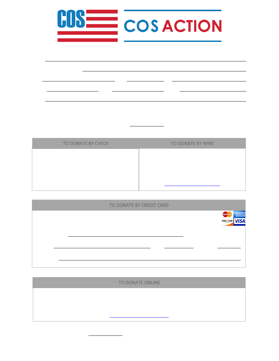 ![]() COS Action is a non-profit section 501©(4) organization . Contributions to COS Action are not tax deductible as charitable contributions. COS Action respects the wishes of its donors to keep their identities confidential. COSA GOTV 5850 San Felipe Street, Suite 580 ⚫ Houston, TX 77057 ⚫ ConventionOfStates.com ⚫ 512-487-5525 Name: Preferred Mailing Address: City: State: ZIP: Phone: Office: Mobile: Email: I would like to help to Get Out the Vote for the Georgia run-off, assist you in the fight to restore the integrity of our electoral system, and continue the good work of COS Action, a 501©(4) nonprofit, with my most generous gift of: $ . To make your contribution by credit card, please fill in the information below: Name on Card: Card #: Exp.: / Sec Code: Signature: TO DONATE BY CREDIT CARD TO DONATE BY CHECK Overnight Mail to: COS Action COS Action 5850 San Felipe St. Ste 580 Houston, Texas 77057 TO DONATE BY WIRE Account #: 659907021 Routing #: 021000021 Contact Patty Meckler at: 512-487-5525 / 737-990-9103 (mobile) pmeckler@cosaction.com < > TO DONATE ONLINE To make your contribution online, please click the link below: Click here to donate online! ![]() CALIFORNIA – Convention of States Action’s audited financial statement is available upon request to Convention of States Action. 0 percent of your gift may be deducted under Federal and State income tax laws. FLORIDA – A COPY OF THE OFFICIAL REGISTRATION AND FINANCIAL INFORMATION MAY BE OBTAINED FROM THE DIVISION OF CONSUMER SERVICES BY CALLING TOLL-FREE, WITHIN FLORIDA, 1-800-435-7352 (800- HELP-FLA). REGISTRATION DOES NOT IMPLY ENDORSEMENT, APPROVAL, OR RECOMMENDATION BY THE STATE. Florida registration number CH40366. GEORGIA – Upon request, Convention of States Action will provide a full and a fair description of this and its other programs as well as a financial statement or financial summary. MARYLAND – A copy of Convention of States Action’s curre nt financial statement is available upon request to Convention of States Action, 1464 Morena Blvd, San Diego, CA 92110. For the cost of postage and copying, financial and other information is available from the Maryland Secretary of State, State House, Annapolis, MD 2140, (410) 974-5534. MINNESOTA – 0 percent of your gift may be deducted as a charitable contribution under Federal and State income tax laws. MISSISSIPPI – The official registration and financial information of Convention of States Action may be obtained from the Mississippi Secretary of State’s office by calling 1 -888-236-6167. Registration by the Secretary of State does not imply endorsement by the Secretary of State. NEW JERSEY – INFORMATION FILED WITH THE ATTORNEY GENERAL CONCERNING THIS CHARITABLE SOLICITATION MAY BE OBTAINED FROM THE ATTORNEY GENERAL OF THE STATE OF NEW JERSEY BY CALLING (973) 504-6215 AND IS AVAILABLE ON THE INTERNET AThttp:%%//%%www.njconsumeraffairs.gov/ocp/charities.htm. REGISTRATION WITH THE ATTORNEY GENERAL DOES NOT IMPLY ENDORSEMENT. NEW YORK – Upon request, a copy of Convention of States Action’s last annual report filed with the Attorney General is available from Convention of States Action or from the New York State Attorney General’s Charitable Bureau, Attn: FOIL Officer, 120 Broadway, New York, NY 10271. NORTH CAROLINA – Financial Information about this organization and a copy of its license are available from the State Solicitation Licensing Branch at (919) 814-5400. The license is not an endorsement by the State. OHIO – Convention of Stats Action is a charity organized under Section 501©(4) and dedicated to developing and advocating legislation to promote self-governance related issues. PENNSYLVANIA – The official registration and financial information of Convention of States Action may be obtained from the Pennsylvania Department of State by calling toll-free, within Pennsylvania, (800) 732-0999. VIRGINIA – Financial and other information is available from the State Office of Consumer Affairs in the Department of Agriculture and Consumer Affairs, P.O. Box 1163, Richmond, VA 23217. WASHINGTON – For additional information regarding Convention of States Action’s activities or financial informat ion, Convention of States Action is registered with the Washington State Charities Program as required by law and information may be obtained by calling 800-332-4483 or 360-725-0378. WEST VIRGINIA – Residents may obtain a summary of the registration and financial documents from the Secretary of State, State Capitol, Charleston, WV 25305. Registration does not imply endorsement. |