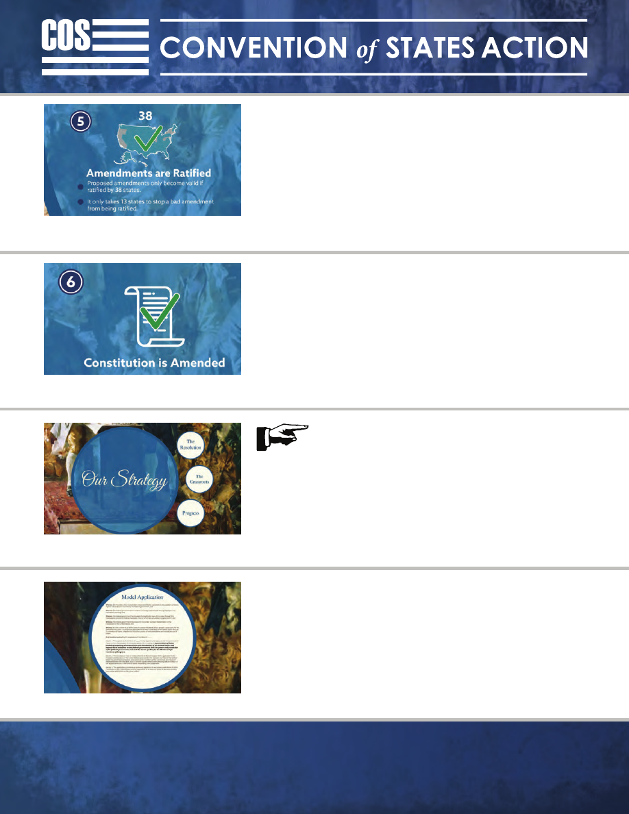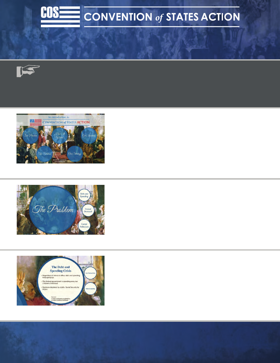 ![]() page 1 For more information on presenting and troubleshooting tips, visit www.conventionofstates.com/presentation INTRODUCTION TO CONVENTION OF STATES PRESENTATION GUIDE INSTRUCTIONS: To advance to the next slide, simply click the white arrow at the bottom of the presentation window. IMPORTANT: For videos, don’t click the “play” button. Click the same white arrow once, and the video will play. When the video is finished, click the arrow again to advance to the next slide. Welcome! My name is _____________, and I’m glad you’re here. Over the next twenty minutes, I’m going to provide everything you need to know about the Article V Convention of States Project – the problem, the solution, how it works, our strategy, and, finally, how to get involved. If you’re unfamiliar with this idea and this movement, don’t worry! I was sitting right where you are not too long ago, and hopefully by the end of our time together you’ll have a good grasp of the basics. The Convention of States Project is designed to address the three biggest problems we see in Washington, DC: the debt and spending crisis, the overreach of the federal government, and the negative ef- fects of career politicians. First, the debt and spending crisis. Here’s the most important fact about our spending problem: party doesn’t matter. INTRODUCTION (1/33) THE PROBLEM (2/33) DEBT + SPENDING (3/33) 1 2 3 page 1 For more information on presenting and troubleshooting tips, visit www.conventionofstates.com/presentation ![]() page 2 For more information on presenting and troubleshooting tips, visit www.conventionofstates.com/presentation Democrats and Republicans both spend far beyond our means, and it’s jeopardizing the future of our children and grandchildren. But we’ll feel the effects of this irresponsible spending even before our grandchildren are saddled with the national debt. According to expert analysis, the Medicare fund will be depleted by 2026 and Social Secu- rity will be gone by 2034. The second problem is government overreach. There are many ways that Washington abuses its power, but one of the most egregious hap- pens every day in federal bureaucracies. Most people don’t realize that bureaucrats are not elected, and yet they are responsible for the vast majority of the laws and regulations under which we live. Here’s the problem: Article I of the Constitution says that “all legisla- tive power is vested in Congress.” I think this video does a great job illustrating how far we’ve departed from that idea. And the federal bureaucracy isn’t the only branch that creates laws out of thin air. The Supreme Court does it too, as Mike Farris explains in this next video. Click button at bottom twice to start video. DEBT GRAPH (4/33) GOVT SPENDING (5/33) REGULATIONS (6/33) LAWS V. REGS (7/33) 4 5 6 7 ![]() page 3 For more information on presenting and troubleshooting tips, visit www.conventionofstates.com/presentation Our Founders never wanted anyone to make a career out of public service. But look how long these men and women from both sides of the aisle have been in Washington. You might say, “What’s wrong with that? Their constituents elect them. Why shouldn’t they continue serving?” The problem is that the longer someone stays in D.C., the more they smell like the swamp. The more they become tied to the bureaucracies and special interests, the less they’re willing to stick their neck out for the good of their constituents or, more importantly, the good of the country. And, as you can see, the problem is getting worse. And why shouldn’t it? Our federal officials – whether we’re talking about bureaucrats, the Supreme Court, or Congresspeople – don’t have any incentive to change the status quo. They’re perfectly happy to continue acquiring more power, wealth, and influence as long as We the People will let them. This is one of our core beliefs at the Convention of States Project: the federal government will never fix itself. They’ll never stop spending, abusing their power, or seeking reelection. 3K PG CONSTITUTION (8/33) CAREER POLITICIANS (9/33) AVG. TENURE (10/33) THE SOLUTION (11/33) 8 9 10 11 Neither bureaucrats nor Supreme Court justices are elected, which takes power away from the people and gives it to entities that are almost never held accountable for their actions. And speaking of unaccountable federal officials… Click button at bottom twice to start video. Fortunately, the Founders predicted this would happen. That’s why they included the Convention of States option in Article V of the Constitution. Click button at bottom twice to advance to slide. ![]() page 4 For more information on presenting and troubleshooting tips, visit www.conventionofstates.com/presentation Read Slide. At its most basic level, Article V allows the state legislatures to call a convention for the purpose of proposing amendments. This convention can only be called if two-thirds of the states – today that would be 34 – pass resolutions calling for such a convention. And note the word “proposing.” An Article V Convention of States is a meeting of states in which they discuss potential amendments to the U.S. Constitution. Those amendments, as Article V says, must then be sent back to the states and ratified by 38 legislatures. This is a very high bar, but it ensures that only the best, most popular amendments will finally be added to our founding document. Our plan is simple – we want to use Article V as the Founders intend- ed. We believe the federal government has gone off the rails, and we want to encourage the states to use their power under Article V to get our nation back on track. Like the colonists during the War for Independence, our desire isn’t to scrap everything and start something brand new. Instead, we want to get back to our founding principles, and we believe the best, most effective way to do that is to call a Convention of States. FOUNDERS SAY (12/3