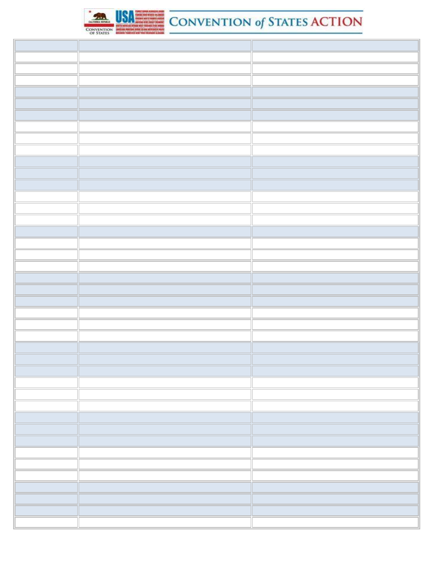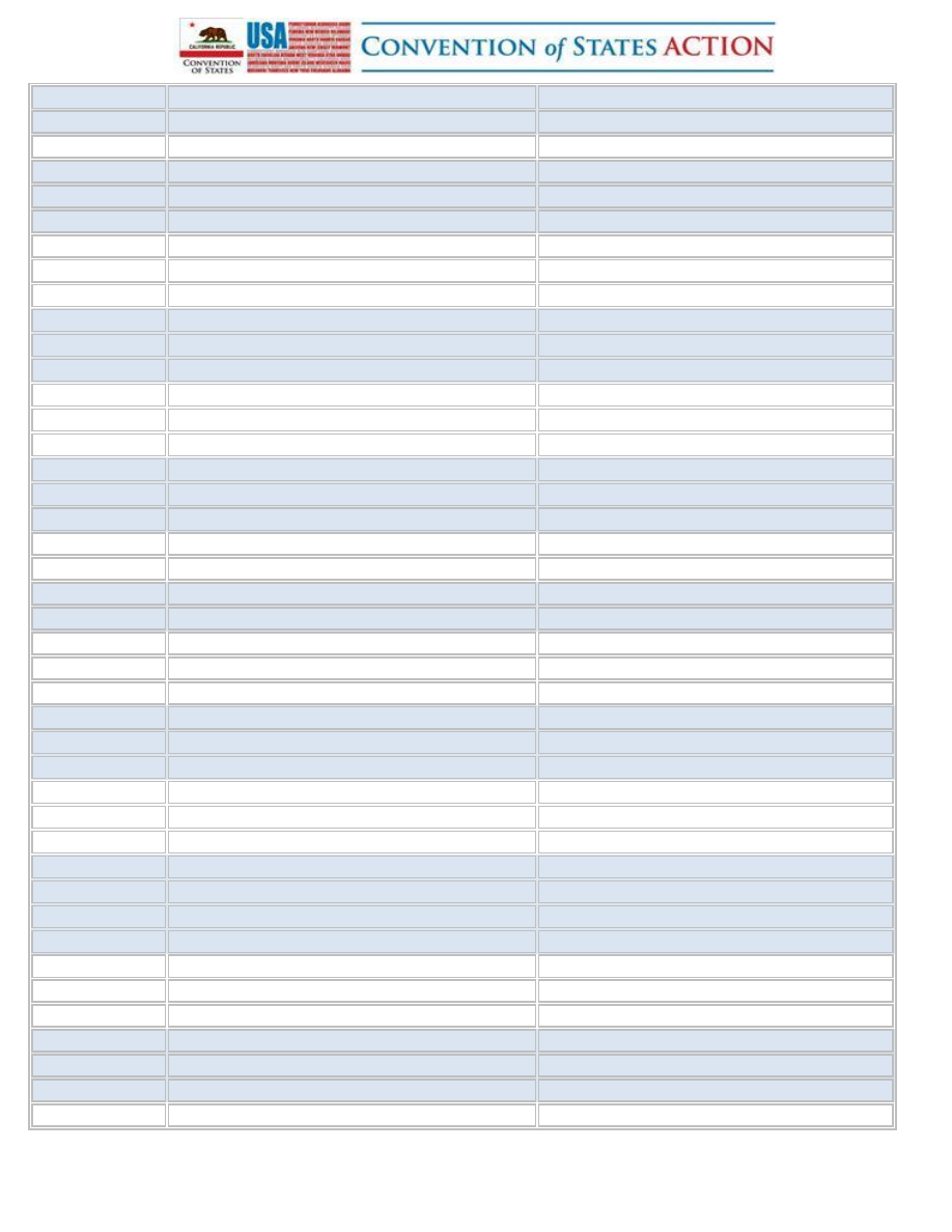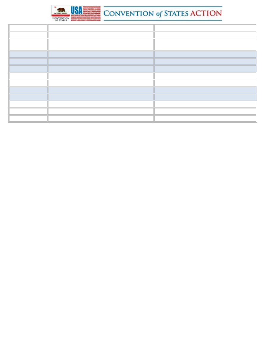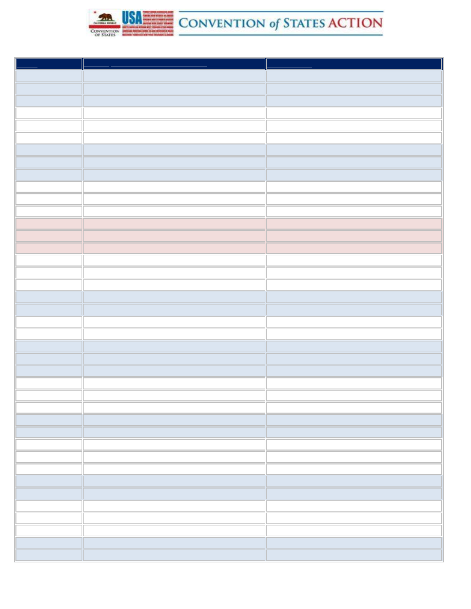 ![]() State Name (Delegation Chairperson in Bold) Committee Alabama Senator Greg Albritton Term Limits and Federal Judicial Jurisdiction Senator Clay Scofield Federal Legislative and Executive Jurisdiction Representative Jack “J.D.” Williams Fiscal Restraints Alaska Represenatative Lynn Gattis Term Limits and Federal Judicial Jurisdiction Representative Shelley Hughes Federal Legislative and Executive Jurisdiction Representative Tammie Wilson Fiscal Restraints Arizona Senator Debbie Lesko Federal Legislative and Executive Jurisdiction Representative Kelly Townsend Term Limits and Federal Judicial Jurisdiction Representative Sonny Borrelli Fiscal Restraints Arkansas Representative Bob Ballinger Term Limits and Federal Judicial Jurisdiction Senator Robin Lundstrum Fiscal Restraints Senator Gary Stubblefield Federal Legislative and Executive Jurisdiction California Assemblyman Brian Jones Federal Legislative and Executive Jurisdiction Dr. John Eastman Term Limits and Federal Judicial Jurisdiction Mr. Dennis C. Revell Fiscal Restraints Colorado Senator Kevin Lundberg Fiscal Restraints Senator Vicki Marble Federal Legislative and Executive Jurisdiction Ms. Laurie Bratten Term Limits and Federal Judicial Jurisdiction Connecticut Senator Joe Markley Fiscal Restraints Representative Rob Sampson Federal Legislative and Executive Jurisdiction Delaware Senator David Lawson Federal Legislative and Executive Jurisdiction Mr. Sam Waltz Fiscal Restraints Florida Representative Matt Caldwell Federal Legislative and Executive Jurisdiction Senator Alan Hays Term Limits and Federal Judicial Jurisdiction Representative Larry Metz Fiscal Restraints Georgia Representative Timothy Barr Term Limits and Federal Judicial Jurisdiction Representative Buzz Brockway Federal Legislative and Executive Jurisdiction Representative Bruce Williamson Fiscal Restraints Hawaii Representative Bob McDermott Term Limits and Federal Judicial Jurisdiction The Honorable G. Lynn Finnegan Federal Executive and Legislative Jurisdiction Idaho Representative James Holtzclaw Term Limits and Federal Judicial Jurisdiction Representative Thomas Loertscher Federal Executive and Legislative Jurisdiction Representative Eric Redman Fiscal Restraints Illinois Representative Thomas Morrison Fiscal Restraints Mr. Nick Sauer Term Limits and Federal Judicial Jurisdiction Indiana Senator Brandt Hershman Fiscal Restraints Senator Travis Holdman Federal Legislative and Executive Jurisdiction Representative Ben Smaltz Term Limits and Federal Judicial Jurisdiction Iowa Representative Jake Highfill Term Limits and Federal Judicial Jurisdiction Senator Charles Schneider Fiscal Restraints Complete List of Commissioners that Attended the 2016 Simulated Convention ![]() Senator Jack Whitver Federal Legislative and Executive Jurisdiction Kansas Representative Pete DeGraaf Fiscal Restraints Representative Brett Hildabrand Federal Legislative and Executive Jurisdiction Representative Bill Sutton Term Lemits and Federal Judicial Jurisdiction Kentucky Senator Tom Buford Fiscal Restraints Representative Tim Couch Federal Legislative and Executive Jurisdiction Senator Wil Schroder Term Limits and Federal Judicial Jurisdiction Louisiana Senator Dan Claitor Term Limits and Federal Judicial Jurisdiction Senator Page Cortez Federal Legislative and Executive Jurisdiction Representative Ray Garofalo Fiscal Restraints Maine Representative Randall Greenwood Fiscal Restraints Senator Garrett Mason Federal Legislative and Executive Jurisdiction Representative Matt Harrington Term Limits and Federal Judicial Jurisdiction Maryland Senator Joan Carter Conway Fiscal Restraints Delegate Tony McConkey Term Limits and Federal Judicial Jurisdiction Delegate Michael McKay Federal Legislative and Executive Jurisdiction Massachusetts Mr. Andrew Beckwith Term Limits and Federal Judicial Jurisdiction Michigan Representative Lee Chatfield Federal Legislative and Executive Jurisdiction Mr. Kurt O'Keefe Term Limits and Federal Judicial Jurisdiction The Honorable Ken Bradstreet Fiscal Restraints Minnesota Representative Cindy Pugh Fiscal Restraints Representative Duane Quam Federal Legislative and Executive Jurisdiction Senator Roger Chamberlain Term Limits and Federal Judicial Jurisdiction Mississippi Representative Chris Brown Fiscal Restraints Representative Dan Eubanks Term Limits and Federal Judicial Jurisdiction Senator Angela Hill Federal Legislative and Executive Jurisdiction Missouri Senator Bob Dixon Term Limits and Federal Judicial Jurisdiction Representative Keith Frederick Fiscal Restraints Representative John Wiemann Federal Legislative and Executive Jurisdiction Montana Senator Doug Kary Fiscal Restraints Representative Theresa Manzella Federal Legislative and Executive Jurisdiction Senator Scott Sales Term Limits and Federal Judicial Jurisdiction Nebraska Senator Laura Ebke Term Limits and Federal Judicial Jurisdiction Senator Curt Friesen Federal Legislative and Executive Jurisdiction Senator Brett Lindstrom Fiscal Restraints Nevada The Honorable Sharron Angle Term Limits and Federal Judicial Jurisdiction Assemblyman Brent Jones Federal Legislative and Executive Jurisdiction Mr. Steven Miller Fiscal Restraints New Hampshire Senator Gary Daniels Fiscal Restraints Representative Eric Eastman Federal Legislative and Executive Jurisdiction Representative Kris Roberts Term Limits and Federal Judicial Jurisdiction New Jersey Assemblyman Robert Auth Fiscal Restraints ![]() New Mexico Representative Yvette Herrell Federal Legislative and Executive Jurisdiction Ms. Carla Sonntag Fiscal Restraints New York Mr. Bobby Massarini Fiscal Restraints North Carolina Representative Bert Jones Term Limits and Federal Judicial Jurisdiction Representative Dennis Riddell Federal Legislative and Executive Jurisdiction Senator Norman Sanderson Fiscal Restraints North Dakota Representative Rick Becker Term Limits and Federal Judicial Jurisdiction Representative Jim Kasper Federal Legislative and E