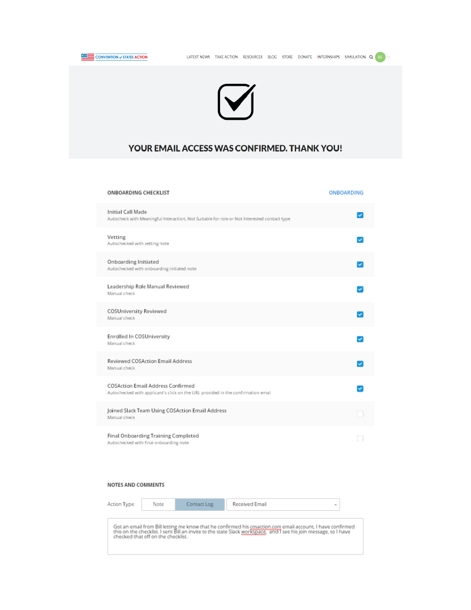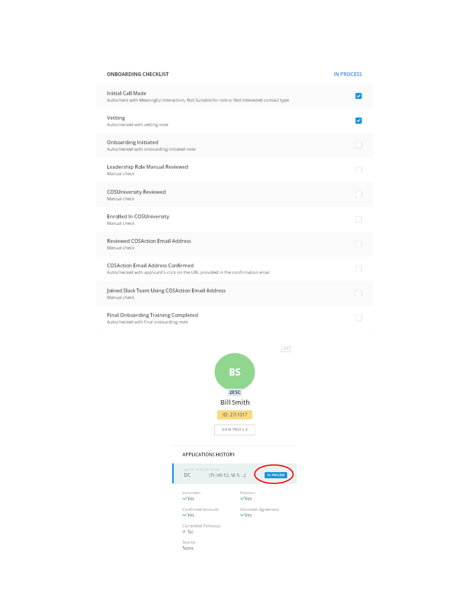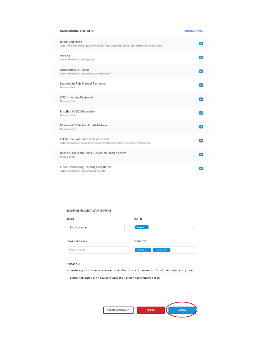 ![]() v1.1 5/8/19 1 Leadership Management Tool – Applicant Processing Overview The Leadership Management Tool (LMT) of CitizenBuilder (CB) has two primary functions, 1) to process applicants for leadership roles, and ultimately either assign or reject the application, and 2) to manage assigned leaders (who may have more than one assigned role). This document focuses on the process flow for handling the applicants. LMT includes a separate row in the list for each role for each leader, regardless of how that role was associated with the leader’s profile. The normal means for a new role to appear in LMT is for the volunteer to submit an application on the Take Action page of the website, but in some limited situations, some leaders have access to a Leader Positions tab of the profile where a role can be immediately assigned, and it will also appear in LMT. Roles shown in LMT can be in one of the following statuses: Open – New (or reopened) application that has not yet begun the vetting process In Process – The vetting process has been started Onboarding – Applicant has been vetted and is working through the on-boarding steps Assigned – Active leader Former – Previously Assigned , and has been Unassigned Rejected – Not assigned to the role (this also includes most Former leaders from NationBuilder) When first opening LMT, the Status filter will default to Assigned , so to review for open applications, the filter needs to be set to Any , Open , or Open/In Process . To review for applicants working through the on-boarding process, set the filter to Any or Onboarding . The current application flow for roles on the Take Action page requires the applicant to complete the following steps: • Sign in with their CB account – they will need to create an account if one does not already exist • Sign the COS petition, if not already signed • Sign the Volunteer Confidentiality Agreement, if not already signed • Enter or update the contact information, and complete the survey questions (if applicable) • Click Submit Application button ![]() Leadership Management Tool – Applicant Processing v1.1 5/8/19 2 Normal Process Flow Immediately upon submitting the application, it will appear in LMT in Open status. The key steps in the normal flow for processing an application through to Assigned or Rejected status is: • Add Called – Meaningful Interaction note (assigns leader to the application, but stays in Open status; auto-checks the Initial Call Made checklist item) • Add Vetting note (changes status from Open to In Process ; auto-checks the Vetting checklist item) • Add Onboarding Initiated note (changes status from In Process to Onboarding ; auto-checks the Onboarding Initiated checklist item) • Manual check of the following checklist items: o Leadership Role Manual Reviewed o COSUniversity Reviewed o Enrolled in COSUniversity o Reviewed COSAction Email Address • Create the cosaction.com email account, and click on the Send Confirm cosaction Email button (activity note for the account creation appears in the Profile Dashboard, not LMT) • Check for applicant confirming their cosaction.com email account by looking for the auto-check of the COSAction Email Address Confirmed checklist item (any number of resends of the confirm email may be sent if needed) • Send an Invite to the new leader to their state Slack workspace using their cosaction.com account, and when accepted, manually check the Joined Slack Team Using COSAction Email Address checklist item • Add Onboarding Training Completed note (auto-checks the Final Onboarding Training Completed checklist item; enables the Assign button in the Role/Assignment Management section at the bottom) • Adjust the Role and Assignments as appropriate, then click the Assign button (changes status from Onboarding to Assigned ). The new leader’s User menu will now include Dashboard as an option, with access based upon their role and assignments. If at any time during the above process, an applicant is determined not to be a fit for the role being processed, click on the Reject button in the Role/Assignment Management section, and the status will be changed to Rejected , finishing the process. Although LMT allows the above steps to be performed in any order (except Assign must always be last), the above is the logical progression, and not following this order may disrupt the application status updates. For example, if subsequent steps are performed without adding the Vetting note, the status will still remain as Open . The Volunteer role is treated slightly differently than the other System Roles. The Onboarding Checklist will not be shown for this role, and it thus is not subject to the structured on-boarding flow described above. A cosaction.com email account is also not normally created for this role. NOTE: The Onboarding Checklist will only appear for applications submitted, or reopened, after May 6, 2019 (date that this feature was implemented). ![]() Leadership Management Tool – Applicant Processing v1.1 5/8/19 3 Additional LMT Processing Details Notes At each appropriate step in the process, it is important to add detail notes describing each contact with the applicant, and other information relevant to the vetting and on-boarding process. This is critical both for your own recollection, but also for others who later may need to review or manage this leader. This is just as important for Rejected or Unassigned leaders as it is for new applicants, so that others will know whether a Former or Rejected leader should be eligible for reconsideration, should they reapply or express renewed interest. The available choices for the Contact Log notes are: Any action taken in the Role/Assignment Management section requires entry of a comment in the Reason field, which will be included in the automatic activity note. Notes added in LMT are role-specific, meaning that if someone has more than one role, the notes entered while proc