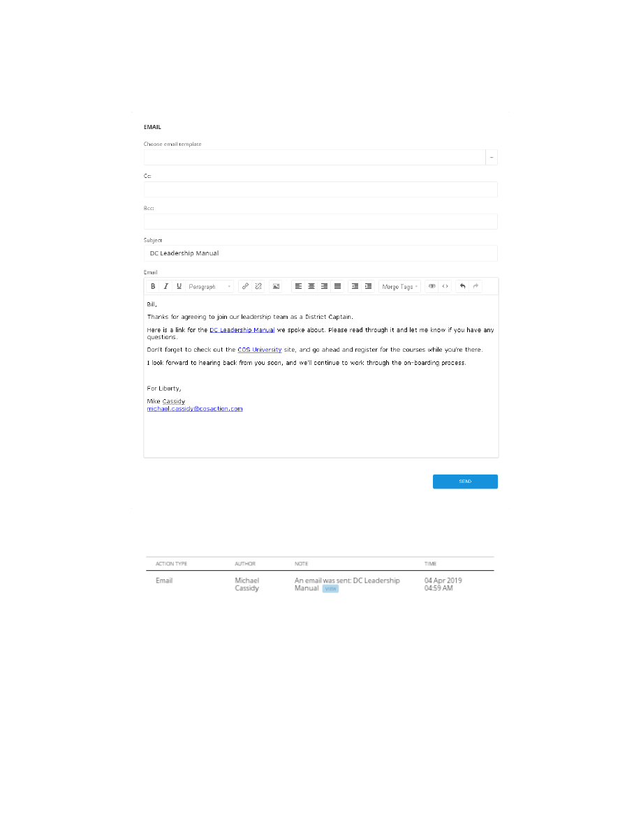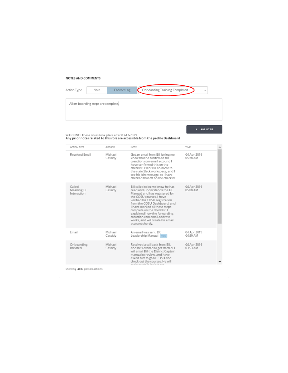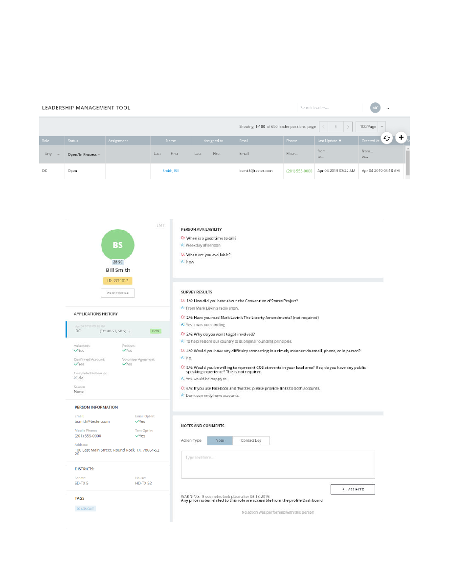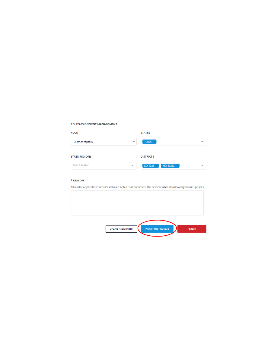 ![]() v1.1 5/8/19 1 Leadership Management Tool – Applicant Processing Overview The Leadership Management Tool (LMT) of CitizenBuilder (CB) has two primary functions, 1) to process applicants for leadership roles, and ultimately either assign or reject the application, and 2) to manage assigned leaders (who may have more than one assigned role). This document focuses on the process flow for handling the applicants. LMT includes a separate row in the list for each role for each leader, regardless of how that role was associated with the leader’s profile. The normal means for a new role to appear in LMT is for the volunteer to submit an application on the Take Action page of the website, but in some limited situations, some leaders have access to a Leader Positions tab of the profile where a role can be immediately assigned, and it will also appear in LMT. Roles shown in LMT can be in one of the following statuses: Open – New (or reopened) application that has not yet begun the vetting process In Process – The vetting process has been started Onboarding – Applicant has been vetted and is working through the on-boarding steps Assigned – Active leader Former – Previously Assigned , and has been Unassigned Rejected – Not assigned to the role (this also includes most Former leaders from NationBuilder) When first opening LMT, the Status filter will default to Assigned , so to review for open applications, the filter needs to be set to Any , Open , or Open/In Process . To review for applicants working through the on-boarding process, set the filter to Any or Onboarding . The current application flow for roles on the Take Action page requires the applicant to complete the following steps: • Sign in with their CB account – they will need to create an account if one does not already exist • Sign the COS petition, if not already signed • Sign the Volunteer Confidentiality Agreement, if not already signed • Enter or update the contact information, and complete the survey questions (if applicable) • Click Submit Application button ![]() Leadership Management Tool – Applicant Processing v1.1 5/8/19 2 Normal Process Flow Immediately upon submitting the application, it will appear in LMT in Open status. The key steps in the normal flow for processing an application through to Assigned or Rejected status is: • Add Called – Meaningful Interaction note (assigns leader to the application, but stays in Open status; auto-checks the Initial Call Made checklist item) • Add Vetting note (changes status from Open to In Process ; auto-checks the Vetting checklist item) • Add Onboarding Initiated note (changes status from In Process to Onboarding ; auto-checks the Onboarding Initiated checklist item) • Manual check of the following checklist items: o Leadership Role Manual Reviewed o COSUniversity Reviewed o Enrolled in COSUniversity o Reviewed COSAction Email Address • Create the cosaction.com email account, and click on the Send Confirm cosaction Email button (activity note for the account creation appears in the Profile Dashboard, not LMT) • Check for applicant confirming their cosaction.com email account by looking for the auto-check of the COSAction Email Address Confirmed checklist item (any number of resends of the confirm email may be sent if needed) • Send an Invite to the new leader to their state Slack workspace using their cosaction.com account, and when accepted, manually check the Joined Slack Team Using COSAction Email Address checklist item • Add Onboarding Training Completed note (auto-checks the Final Onboarding Training Completed checklist item; enables the Assign button in the Role/Assignment Management section at the bottom) • Adjust the Role and Assignments as appropriate, then click the Assign button (changes status from Onboarding to Assigned ). The new leader’s User menu will now include Dashboard as an option, with access based upon their role and assignments. If at any time during the above process, an applicant is determined not to be a fit for the role being processed, click on the Reject button in the Role/Assignment Management section, and the status will be changed to Rejected , finishing the process. Although LMT allows the above steps to be performed in any order (except Assign must always be last), the above is the logical progression, and not following this order may disrupt the application status updates. For example, if subsequent steps are performed without adding the Vetting note, the status will still remain as Open . The Volunteer role is treated slightly differently than the other System Roles. The Onboarding Checklist will not be shown for this role, and it thus is not subject to the structured on-boarding flow described above. A cosaction.com email account is also not normally created for this role. NOTE: The Onboarding Checklist will only appear for applications submitted, or reopened, after May 6, 2019 (date that this feature was implemented). ![]() Leadership Management Tool – Applicant Processing v1.1 5/8/19 3 Additional LMT Processing Details Notes At each appropriate step in the process, it is important to add detail notes describing each contact with the applicant, and other information relevant to the vetting and on-boarding process. This is critical both for your own recollection, but also for others who later may need to review or manage this leader. This is just as important for Rejected or Unassigned leaders as it is for new applicants, so that others will know whether a Former or Rejected leader should be eligible for reconsideration, should they reapply or express renewed interest. The available choices for the Contact Log notes are: Any action taken in the Role/Assignment Management section requires entry of a comment in the Reason field, which will be included in the automatic activity note. Notes added in LMT are role-specific, meaning that if someone has more than one role, the notes entered while proc