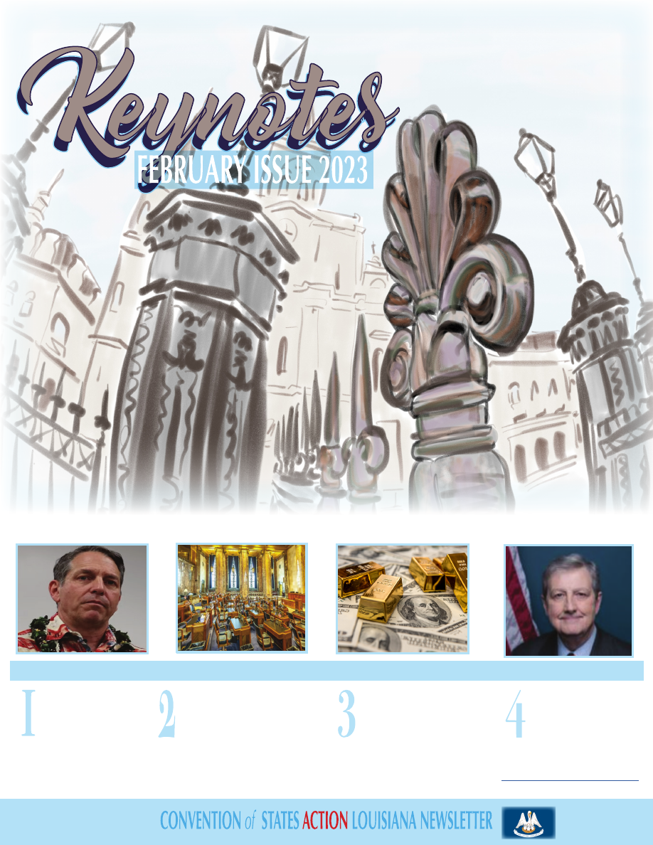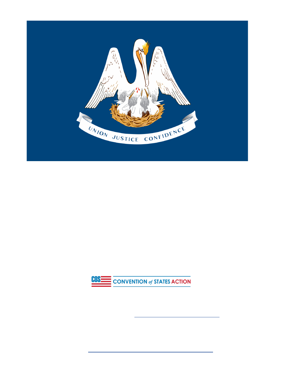 ![]() 1 Be a part of History, participate with the LA COS team on one of the most important state team events of the year. page 4-5, 8-9 LA Senator John Kennedy perplexes Judicial nominee Charnelle Bjelkengren “What kinds of amendments will actually come out of the convention?” page 6-7 Self-Governance! Join us at the Capitol! Stop Inflating Away Our Wealth Article V? State of the Convention of States Watch Mark and Tucker Carlson page 2-3 https://youtu.be/RNlfbQ-WbFY ![]() 2 3 No one is coming to “save” us from the tyrannical, inflated, intrusive, over-taxing, freedom-eroding Administration. Our Founding Fathers must be turning over in their graves and we have the obligation, duty and ability to do something about it. We all know the answer and it’s a Convention of States. The purpose would be to propose amendments under Article V to remove the power from the Federal Government and return it to the people and the state. A Convention of States is Not a Constitutional Convention that starts from scratch and writes an entirely new constitution. According to Mark Meckler, President and co-founder of Convention of States Action; COS is the largest non-partisan grassroots organization in the nation with 5 million supporters strong across every legislative district in all 50 states. We hope to get 34 states by 2026 and have more states join us this year. Mark states that we are watching for North Carolina, Ohio, Pennsylvania, Montana, and Wyoming to join our ranks. Our great state of Louisiana has 36,974 current petition signers. Let’s show our legislators that WE the People are in charge of our government and continue to build an engaged army of self-governing grassroots activists. Watch Tucker Carlson with Mark Meckler’s, full interview available free on bitchute . https://www.bitchute.com/video/zeB5RB1w4Ote/ WE the People are in charge of our government! Glenda Hardey ![]() 4 5 https://youtu.be/KASlFaWS04s Advocacy Day Advocacy Day April 26, 2022 Interview with Senator “Big Mike” Fesi HD 20 B B e a part of History! Participate with the LA COS LA COS team on one of the most important state team events of the year. We will meet and greet our legislators, and together we can reach and teach them about our vision and goal of having a Convention of Convention of States States utilizing Article V. Article V. We will hand-deliver to as many legislators as possible educational materials regarding Article V Article V and a list of their constituents who signed the petitions. We desire to encourage our State Legislators to learn more about their duty and authority under Article V Article V of the U.S. Constitution, develop strong relationships with them and build team camaraderie. Advocacy Day Information-pages 8-9. at the State Capitol JOIN OUR LA COS Team! ![]() 6 7 Stop Inflating Away our Wealth ow that 19 states have passed resolutions calling for an Article V convention of the states, people are asking, “What kinds of amendments will come out of the convention?” The three pillars of the Convention of States Article V project are: term limits for Federal officials; fiscal restraint, and limiting the power and jurisdiction of the Federal government. One amendment related to fiscal restraint that Congress could propose is to control inflation, which is likely the most powerful enemy of the American economy. Fiat currency is the cause of every economic problem in America. The economy suffers from the effects of this grand theft of over printing and spending of fiat money. Our Constitution says, “No state shall ….make anything but gold and silver coin a tender in payment of debt.” Article 1, section 10. Article 1, sections 8 & 10 can only be restored by a constitutional amendment. Congress never amended our Constitution to authorize the Federal Reserve Act. The Federal Reserve Act of 1913 began using fiat currency (government-issued currency not backed by gold or silver). Most Americans blithely accept its constitutionality simply because it was passed by Congress and signed into law by President Wilson. The Federal Reserve Note is wholly unconstitutional if no constitutional amendment authorizes the Federal Reserve or its control of our monetary system. The fact that this isn’t challenged is our nation’s most significant fiscal problem. Many, if not all, of our economic challenges originate with violating this constitutional provision. Could the first step in restoring fiscal restraint be to end fiat currency? It is already quite evident that if Congress halts fiat money creation, a cascade of consequences would precipitate the appropriate corrections throughout our economy. The use of the Article V amendment process is a vital instrument for the correction of such problems. If our Congress has no interest in correcting problems, it will fall to the second process for amendments, a convention of states. Join the millions of people nationwide who have signed the petition to call for a convention to propose amendments such as ending fiat money. Sign the petition at https://conventionofstates.com Dave Landry Our Constitution says, “No state shall ….make anything but gold and silver coin a tender in payment of debt.” Article 1, Sections 8 & 10 ![]() 8 9 Packaging Party Packaging Party Monday, April 10th, EBR Main Library, Baton Rouge, LA Prepare the dessert bags and materials for the legislators. EBR Main Library; 7711 Goodwood Blvd., Baton Rouge, LA 4:00 p.m. to 6:00 p.m. Those who attend Friday night might want to make plans to go to dinner after we finish at the library. Advocacy Day Advocacy Day Tuesday, April 11th, The Capitol, Baton Rouge, LA Breakfast at Another Broken Egg 8:00 a.m. -2531 Citiplace Ct. Unit 100 Baton Rouge, LA 70808 Set up tables in the Rotunda of the State Capitol from 10:00 to 11:00 a.m. You may bring your items to the back of the Capitol and drop them off for the trustees to bring upstairs if you wish. Otherwise, bring them upstairs with y