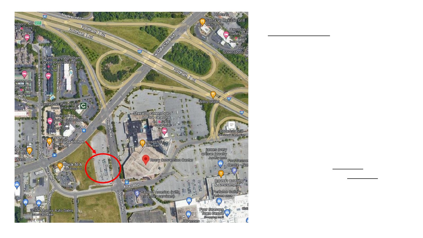 ![]() Concord Mills Pickup Bass Pro Shops 8181 Concord Mills Blvd. Concord, NC 28027 Exit I-85 on Bruton Smith Blvd. west to Concord Mills. Enter Concord Mills on your left to Bass Pro Shops Arrive no later than 7:00 a.m. Bus departs promptly at 7:15 a.m. Park here ![]() Greensboro Pickup Koury Convention Center 3121 W. Gate City Blvd. Greensboro, NC 27407 Exit I-40 on W. Gate City Blvd. south toward Koury Convention Center. Turn left on Pinecroft Rd. and park in lot on right side of street, directly opposite the convention center. Arrive no later than 8:15 a.m. Bus departs promptly at 8:30 a.m. Park here —- ====== Document Outline ====== * Slide 1 * Slide 2 |