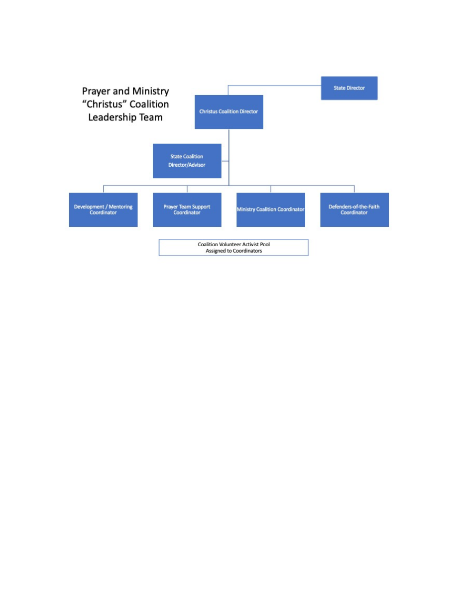 ![]() (v1.0) 5/14/22 1 DRAFT CHARTER Prayer and Ministry “Christus” Coalition Leadership Team PURPOSE To achieve, in the State of Texas, the Convention of States aspirational goal of leading a spiritual reawakening driven by a realization, reaffirmation and recommitment to our creator God and the truth and principles of his Word. FOCUS Strategies and implementation for: • Promoting spiritual development and mentoring COS Volunteer Activists. • Building a powerful prayer team to support all COS functions. • Creating a network of like-minded churches and ministries to extend the reach of COS in affecting the spiritual reawakening. • Building an army of Defenders-of-the-Faith-Leaders to educate the religious community about threat posed by the cult of progressive ideology (Wokeness) to spiritual reawaking and to the fabric of our American society. TEAM SPONSOR State Director TEAM LEADER Christus Coalition Director TEAM MEMBERS • Development/Mentoring Coordinator • Prayer Team Support Coordinator • Ministry Coalition Coordinator • Defenders-of-the-Faith Coordinator ![]() (v1.0) 5/14/22 2 KEY ACTIVITIES / DELIVERABLES Team Building • Christus Coalition Director will: o Develop a communication/recruiting package that effectively outlines the Christus Coalition mission and Call to Action to motivate VAs to participate in the Coalition. o Develop a companion communication package to be used for church, ministry, and Texas citizen outreach. o Identify the skillsets/experience requirements needed for each Coordinator position. o Onboard Coalition VAs from Texas HDs into Coordinator and supporting roles. o Develop ongoing high-level relationships with church and ministry leaders and create an external Ministry Advisory Board to advise the Christus Coalition team. o Provide training for COS Coordinators as Facilitators for Servant Leadership, Constitutional and Biblical Citizenship classes. Development and Mentoring • Target Group: Texas COS Volunteer Activists and COS Leaders • Goals: o Promote spiritual development, encouragement, and maturity for Target Group. o Promote biblically based leadership development skills and capabilities for Target Group. • Activities – Development and Mentoring Coordinator will lead a team to: o Facilitate Servant Leadership Classes for Target Group within Texas and assure coordination with National Servant Leadership training. o Facilitate Constitutional/Biblical Citizenship classes for Target Group to equip them with Constitutional literacy. o Facilitate Bible Study classes to develop spiritual maturity of Target Group. Prayer Team Support • Target Group: Texas COS Volunteer Activists, COS Leaders, and Texas Legislators • Goal: o Ensure the prayer needs of the Target Group are fully met. • Activities – Prayer Team Support Coordinator will lead a team of Volunteer Activists to: o Incorporate the COS Prayer Warriors into the Prayer Team Support Group o Support the prayer needs at COS Texas events including: § Block Walking Events § Capitol Visits § Legislator/Officials Meetings § COS Public Presentations/Training Events § COS Internal Events o Facilitate the monthly Texas State Legislators Prayer Request Calls o Support specific prayer needs for individual Texas Legislators, COS Volunteers and COS Leaders. Ministry Coalition • Target Group: Churches, Ministries, Like-Minded Self-Governing Liberty-Loving Groups with Spiritual Focus • Goal: o Build a Network of like-minded ministries and groups to help facilitate the “spiritual awakening” required to transform Texas and the Nation. ![]() (v1.0) 5/14/22 3 • Activities – Ministry Coalition Coordinator will lead a team of Volunteer Activists to: o Develop a COS Spiritual Transformation and Self-Governance Program of training/education targeting Texas citizens suitable for use by the Target Group. o Identify and onboard local churches and ministries within the Target Group willing to engage their community and participate in the COS Spiritual Transformation and Self- Governance Program lead by COS Christus Coalition by: § Engaging in face-to-face spiritual/physical mentoring for those in need. § Hosting events and engaging the community in the transformation process. § Further extend the spiritual their reach by finding and engaging other activist groups. § Sponsoring events that encourage spiritual transformation and self-governance through knowledge and education with programs such as: • “Rebuilding the self-governing family unit” • “Parenting – Fathers: How to become your family’s spiritual leader” • “Conflict resolution through spiritual transformation” Defenders-of-the-Faith • Target Group: Texas COS Volunteer Activists and COS Leaders, Churches, and Ministries. • Goal: o Equip COS Volunteers and extended ministries with the knowledge and tools to combat the destructive cult of progressive left Wokeism. • Activities – Defenders-of-the-Faith Coordinator will lead a team of Volunteer Activists to: o Develop an education/action package to be rolled out to the Target Group that covers three key topics: § Wokeism origins and its goals to transform America § The dangers it poses to COS aspirational goal § What we of faith must do to stop Wokeism from destroying our country o Lead the Target Group in efforts to educate Texas citizens in the dangers of this cult and their role in countering this disease through a Call to Action. KEY INTERFACES • State Director • State Coalitions Director/Advisor • Christus Coalition Coordinators • HD District Captains • COS Prayer Warriors • State Grassroots Coordinators • Ministry Advisory Board PERFORMANCE (Early Stage) All Coalition Coordinators will have shared goals with respect to advancing the purpose stated in the Christus Coalition Charter. Identify and onboard the Ministry Advisory Board within the first two months of startup. ![]() (v1.0) 5/14/22 4 MEASURES (Early Stage) Team B