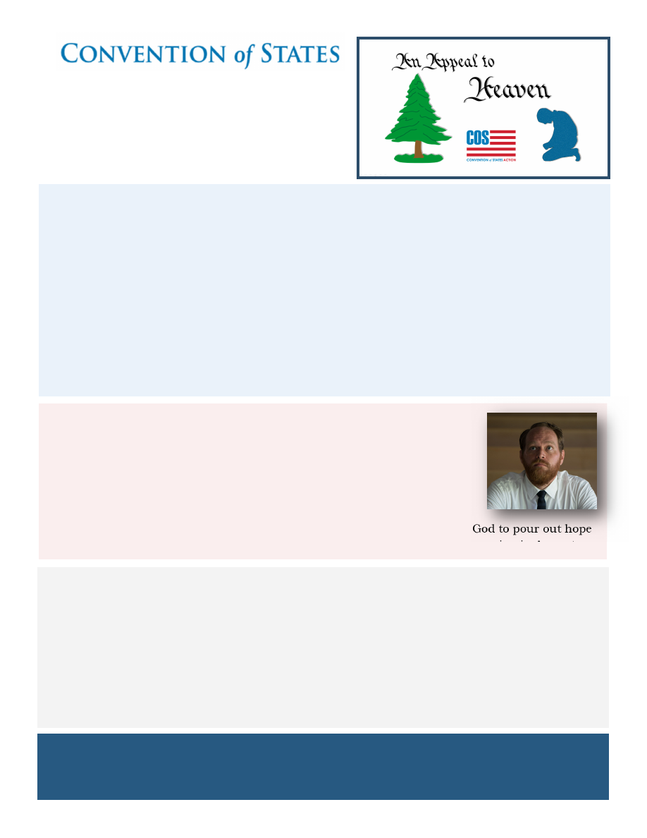 ![]() Prayer Warriors Battle Plan July 2021 July Events and Requests • Lift up the national staff meetings in Colorado, July 14-19. Ask God to grant wisdom, discernment, and unity, and specifically guidance with regard to plans for adding staff to the national team. • Continue to pray for someone to share the load with Mark with regard to traveling, speaking, and testifying. Ask God to sustain and protect Mark during the intensely busy times. • There are many COS leaders who are experiencing serious illnesses. Ask God for healing and for his comforting presence. Leadership Prayer Focus Pastor Chris Thomas is the new COS National Mentor Associate. He teaches servant leadership and men’s Bible studies and offers one-on-one discipleship for men involved in COS. Pray God to give Chris wisdom and strength in his mentoring role and use him to draw folks into a relationship with the Lord. Also pray for Chris’s extended family as he lost his only sibling to suicide a few months ago. Ask God to pour out hope and comfort, and especially lift up plans for a rememberance gathering happening in August. Scripture of the Month Proclaim liberty throughout the land to all the inhabitants thereof. —Leviticus 25:10 Our Founding Fathers adopted this verse as an expression of the freedom they envisioned for the United States of America. The Year of Jubilee that this verse announces is a beautiful picture of the political freedom and economic opportunity that Americans have always valued, and foreshadows the spiritual freedom offered in the Christian gospel. Lord, we pray that political liberty, economic opportunity, and spiritual freedom would always characterize America. We spiritually and prophetically join with our Founding Fathers in proclaim- ing this across our nation, and also ask that you would continue to use the USA to share the model of freedom and message of salvation to many nations around the world. Second Sunday Prayer Call - Sunday, July 11, 9:00 pm Eastern On line: https://meet.jit.si/cosprayerwarriors, password: liberty By phone: 512-647-1431, access code: 533 792 80# ![]() Daily Prayer Guide for July 2021 1 Massachusetts : lift up a new plan to make meeting and training content more consistent throughout the state. 2 Utah : COS will have a presence at the Freedom Fest this weekend in Provo. Pray for many meaningful interactions. Give thanks for the spirit of unity and optimism on the team. 3 Indiana , Florida, and Kansas : pray blessings and success on 4th of July events happen- ing tomorrow. 4 Happy Fourth of July! Ask God to bring to fulfillment his purposes for America in history and in the world. 5 The Biblical Citizenship course starts again today. Ask God to use it to educate and inspire volunteers. 6 South Dakota : ask for great success in the meetings happening in July. Pray for more roles to be filled, especially district captains. 7 Arkansas : pray for SD Jacque Martin’s presentation to a Rotary Club, and for open doors for meetings with county political committees. Ask God to supply a GC, an SCC, and four RCs. 8 Arizona : continue to pray that the audits underway will reflect the truth about the 2020 election. Pray about similar efforts that could happen in other states. 9 Minnesota : ask for God to send energized, self-governing activists to two town hall meetings in Grand Rapids tomorrow and in Bemidji on July 24. 10 Connecticut and Tennessee : ask blessings on the state strategy meetings today. 11 Kansas : pray for increased grassroots outreach and for wisdom in recruiting leaders in critical locations in the state. 12 North Carolina : pray for two volunteers bat- tling cancer: Linda Moss and Dan Hayden. 13 Wyoming: pray for Sandra McGee as she undergoes and recovers from lung surgery. Ask God to soften the hearts of legislators and for successful town hall meetings. 14 Florida: pray for comfort for GC/RC Jean Borden on the recent loss of her father, and encouragement for DC Eve Maddox in vari- ous issues that are weighing on her. 15 Kentucky : lift up COS participation in a pa- rade in Oldham County on July 17. Pray for safety, plenty of volunteers, and for an in- crease in COS activism in this part of KY. 16 Vermont : pray for the block walking effort that is being developed. 17 Rhode Island : pray for a rally today—the first event since the lockdown lifted. 18 Delaware: ask God to raise up a legislative liaison who is well-connected, self-starting, and team-oriented. 19 Indiana : pray for George Ward’s son Michael to recover from a nasty wound caused by a fall, and Tim Heidenreich’s daughter Jennifer as she battles ovarian cancer. 20 Georgia : pray that parents will actively op- pose the teaching of Critical Race Theory and other progressive agendas. Ask God to raise up school board members. 21 Pray for the fear of the Lord to be poured out on our nation which will lead us to live in wisdom, according to Proverbs 9:10. 22 Idaho : conversation is opening up with the John Birch Society. Pray for open hearts and minds, clarity of thought and speech, and wisdom and guidance—especially for Marty Frantz as he arranges meetings between COS and JBS. ![]() 23 Arkansas : ask for God’s healing touch on Randy Alexander’s son Clint who is suffering from seizures, Jim Graham who is experi- encing back and neck pain, and Jacque Martin after a set-back in her recovery from COVID—pray against long-term lung damage. 24 Massachusetts: lift up the state strategy meeting going on today. 25 Maine : pray for a grassroots coordinator to volunteer. 26 Arkansas and Florida : lift up plans for the state strategy meetings in August and Sep- tember, respectively. 27 Kansas : ask blessings on the COS presence at the Leavenworth and Johnson County Fairs happening today through Saturday. 28 Nevada : please pray for the development of a State Director and Grassroots Coordinator. The NV team is doing great work but needs senior leadership. 29 Pray for protection over our technol