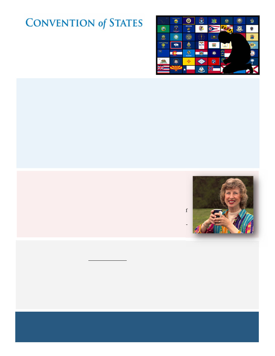 ![]() Prayer Warriors Battle Plan June 2020 June Events and Requests • Continue to pray for the OpenTheStates effort. Specifically ask for wisdom and courage for the national leadership as they contemplate efforts that could possibly bring government ac- tion their way, as they comply with the constitution and not the mandates of men. • Pray that COS donors will understand OpenTheStates to be part of the battle that they need to engage in and contribute to. • Pray for states that still have legislative sessions in progress as the restrictions begin to ease, that COS efforts will be able to regain momentum. Leadership Prayer Focus Susan Peters is a Regional Director overseeing efforts in several northeastern states: ME, NH, RI. PA, and VT. She hails from the state of Virginia. Susan asks for wisdom in helping her teams tailor the Convention of States message specifically to each state. Also pray that these state teams would be able use the opportunities given them in the corona- virus panic to their greatest possible advantage. Scripture of the Month Will you not revive us again, that your people may rejoice in you? Show us your unfailing love, Lord, … let us not return to folly. Surely his salvation is near those who fear him, that his glory may dwell in our land. Love and faithfulness meet together; righteousness and peace kiss each other. — Psalm 85:6-10 Lord, right now our nation seems thoroughly broken. From the halls of power to the city streets, we see corruption and injustice and violence. We confess we have lost our fear of you and theorefore are wallowing in foolishness. We are helpless to fix ourselves without your reviving power. Show us mercy, Lord, even though we don’t deserve it. Pour out a revival and reveal your glory in our land. Let wisdom, righteousness, and peace reign! Second Sunday Prayer Call - Sunday, June 14, 9:00 pm Eastern By phone: 712-770-5505, access code: 256438# On line: https://join.freeconferencecall.com/sharonjc1 ![]() Daily Prayer Guide for June 2020 1 Pray for the COVID-19 crisis to serve as a wake-up call to many Americans regarding the fragile state of liberty in this nation. 2 In the past month, new information has been brought to light regarding corruption in high places. Call on God for justice. 3 Wisconsin: we are still hopeful of getting a final vote in the Senate. Pray for key Senators to come on board. 4 Mississippi: pray that the COS resolution (passed in March 2019) will get properly memorialized in Congress. 5 Lift up many state teams as they work to schedule state strategy meetings. Many of these meetings have been postponed due to the shutdowns. 6 Ask God to raise up a great team of social media warriors to share the COS message on Facebook and Twitter, and that Colossians 4:6 will always be true of them. 7 Arkansas: give thanks for a new grassroots coordinator and lift up the process of finish- ing their orientation. 8 Claim Psalm 91:3-6 for medical staff in the form of extra strength and super-natural protection. 9 Pray specifically for business owners and leaders who are in a position to confront government overreach. Claim 2 Timothy 1:7. 10 Pray for justice to be done in the recent high- profile racially-charged criminal cases. Ask God to bring racial healing to our nation. 11 Mississippi: lift up former Deputy State Director Bruce Cook and his wife Carol as he undergoes treatment for cancer. 12 Pray for guidance and inspiration for researchers who are working on vaccines and treatments. 13 Delaware and Illinois : give thanks for the growth of these grassroots teams! 14 Happy Flag Day! Pray that the American flag would be a symbol of liberty and justice to the entire world. 15 South Dakota: give thanks that venues for Meet & Greets and Educational Forums are opening. Pray for the leadership team to continue growing. 16 Virginia: ask God to raise up a state director. 17 Claim Daniel 2:20-22 for those who need insight into the dynamics surrounding COVID-19. 18 Massachusetts and New Jersey : pray for success in recruiting district captains. 19 As restrictions begin to ease, pray for wisdom for church leadership in handling the logistics of services and ministry events. Prayer Goals for 2020 • Here are the national team’s goals for grassroots leadership engagement: • 575 active District Captains across COS • 160 active Regional Captains • 95 active Grassroots Coordinators • One or two “headliners” to come alongside Mark Meckler and share the load of speaking at events and testifying in state legislatures • A breakthrough in Eagle Forum's opposition to COS ![]() 20 Arkansas: lift up the planning of the strategy meeting and the development of the legisla- tive strategy for 2021. 21 Happy Father’s Day! America is suffering a crisis of masculinity. Ask God to restore our understanding of godly manhood. 22 Efforts to promote vote-by-mail have raised concerns about election integrity. Pray for Americans and especially those overseeing the election process to be vigilant. Specif- ically lift up the efforts of True the Vote. 23 Pennsylvania: continue to lift up the movement of the COS resolution in the legislature. 24 Pray for public officials to make decisions for the good of the people, not their own political benefit. 25 New Mexico: lift up a major coalition building effort and for wisdom for developing leader- ship and appropriate messaging. 26 Claim Psalm 25:21 for the COS organization and pray that we would always be character- ized by impeccable integrity. 27 Continue to pray for God’s comfort and peace for those who have lost loved ones. 28 The John Birch Society is a strong right- wing opponent of COS. Pray for them to value truth. 29 Vermont and Maine : pray for God to raise up state directors for these states. 30 Pray for the fear of the Lord to be poured out on our nation which will lead us to live in wisdom, according to Proverbs 9:10. Fly the Flag! Flag Day — June 14 |
