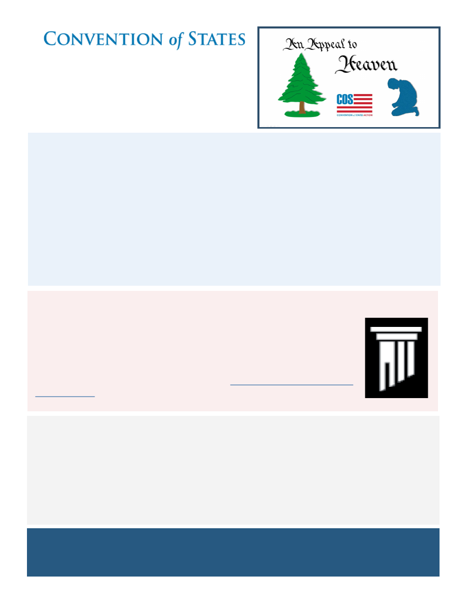 ![]() Prayer Warriors Battle Plan June 2021 June Events and Requests Lift up plans for regional leadership summits that are happening throughout the late summer and early fall. Continue to pray for the COS process in North Carolina and South Carolina—specifically that the legislators who say they are supportive will be true to their word. Also ask God to raise up the necessary support in the Wisconsin Senate. We have many state leaders who are suffering from health issues or family losses. Liberty Prayer Focus First Liberty Institute is the largest legal organization in the nation dedicat- ed exclusively to defending religious liberty for all Americans, regardless of belief or lack thereof. It was founded in 1997 by Kelly Shackleford, and he and his team understand that the rights protected by the First Amendment are foundational to the American ethos. Check out their recent and current cases here: https:%%//%%firstliberty.org/cases- status/active/ . Scripture of the Month The kingdom of this world is become the kingdom of our Lord and of his Christ, and He shall reign forever and ever. —Revelation 11:15 Lord God, we are so grateful for the picture given to us in the book of Revelation of your ultimate victory. We know that in the end you will triumph and your Kingdom will prevail over the power of evil, Remind us of this when the darkness seems heavy around us. Give us a vision of how we can bring the truth and light of your kingdom to bear on the world around us—in our personal lives, in society and culture, and in our political systems. Use Convention of States as a force for your kingdom purposes and may we live and operate as your ambassadors. We proclaim that your kingdom is coming and we are sharing in it! Second Sunday Prayer Call - Sunday, June 13, 9:00 pm Eastern On line: https://meet.jit.si/cosprayerwarriors, password: liberty By phone: 512-647-1431, access code: 533 792 80# ![]() Daily Prayer Guide for June 2021 1 California: ask God to bless our Convention of States volunteers as they courageously push themselves to increase their capabili- ties spreading the Article V message of hope for rational, hard working citizens securing their future through disciplined liberty. 2 Wyoming: lift up the team after a disappoint- ing defeat in the Senate, and ask for wisdom for the leadership to keep momentum going. Also pray for the legislators to understand their authority to use the Constitution. 3 The John Birch Society is a strong right- wing opponent of COS. Pray for them to value truth. 4 Florida: pray that the falsehoods of the 1619 Project would be exposed and that this material would be withdrawn from the state curriculum. Also pray that schools will be fully open in September. 5 Georgia: pray for successful implementation of the Georgia Legislature Prayer Team. Specifically lift up the volunteers: Rob, Shannon, Anne and Mike. 6 South Dakota: ask for great success in the parades and booths happening in June. Pray for more petition signers to step up and become district captains. 7 North Carolina: there is some very powerful opposition in NC. Pray for a new Media Liaison to help push back on the opposition via op-eds in local publications. 8 Nevada: pray that twice-monthly statewide meetings would continue to be informative and spirit-filled so the team can be motiv- ated and encouraged. One of these is tonight. 9 New Hampshire: pray for a full complement of volunteers at the 9-day Laconia Motor- cycle Week (June 12-20), and give thanks for all those who are stepping up. This is NH's most ambitious event to date. 10 Wisconsin: the GOP state convention is this month. Pray for volunteers to man the COS table. 11 Massachusetts and Idaho: ask God for phys- ical healing and recovery for Mark Marshall, Dusty Friday, and Gerald Brown and his wife. The Browns suffered a serious accident. 12 Utah: the grassroots coordinator has unex- pectedly had to step back from leadership. Ask God to raise up a new GC as well as a state director. Also lift up Regional Director Jonathan Viaud as he fills in the gaps. 13 Texas: lift up GC Erika Hatfield as she starts a new job and finds balance with her COS responsibilities. Also ask that Erika’s husband’s pulmonary embolism would completely dissolve. 14 Today is Flag Day. Pray that the American flag will forever be a symbol of freedom and opportunity. 15 North Carolina: pray for passage in the Senate before the end of June! 16 New York: Ask God to open up event opportunities throughout the state. Give thanks for the excellent growth in the NY leadership. 17 For decades Christians have engaged cultur- ally and politically from a defensive, fearful posture. Pray that we will move to a offen- sive position—one of faith and courage. 18 New Jersey: lift up an event with Mark Meckler happening tomorrow. 19 Massachusetts: pray for a successful “Founding Fathers Day” event at the National Monument to the Forefathers. 20 Maine: Pray for a Grassroots Coordinator to be raised up, and give thanks to God for event opportunities. ![]() 21 Rhode Island and Vermont: thank God for new leadership and event opportunities. Pray for continuing growth in leadership numbers, specifically for a State Director in VT. 22 California: ask God to bless our children's future, that it may be as hopeful, spiritual, prosperous, and self-sufficient as it was for us. 23 Virginia: pray for a State Director and that like-minded delegates will be elected to the Virginia Assembly. 24 Claim Proverbs 3:5-6 for the COS move- ment—that we would always acknowledge the Lord and trust in his direction. 25 Pennsylvania: pray for increased, regular engagement of supporters with their legislators. 26 Maryland: pray for a successful state strategy meeting today. 27 Tennessee: lift up plans for the state strate- gy meeting in July. Also ask God’s healing touch on SMW Myra Chesterton’s husband Allen—a spot was found on his lung and he has a history of cancer. 28 Wisconsin: pray f