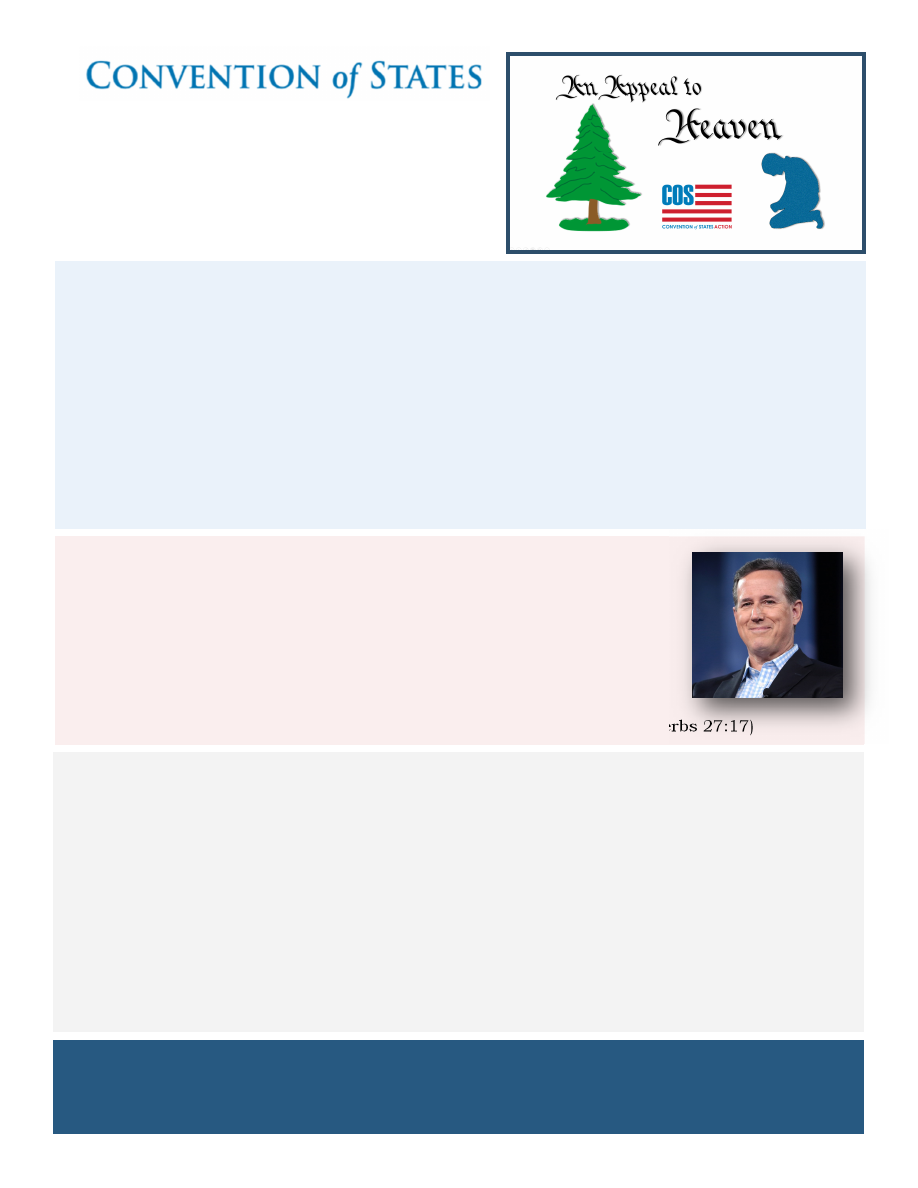 ![]() Prayer Warriors Battle Plan November 2021 November Events and Requests • Lift up the movement of the resolution in several states. Wisconsin is key right now. Also pray for the teams in PA, NC, OH, and SC. • We are expecting an influx of new people coming to us due to the Epoch Times and Daily Wire ads that are coming out. Pray for the teams to be on top of them and reach out to each person that comes in. • Many leaders have been suffering with serious health issues: COVID, cancer, and other major health concerns. We've seen some recent deaths so pray for their families. • Continue to pray for staff to lead Bible studies and provide mentoring for the many volunteers who desire them. There is a waiting list—a wonderful problem to have! Leadership Prayer Focus We are grateful for our new Senior Advisor, Rick Santorum , former U.S. Senator from Pennsylvania. We prayed for many months that God would raise up a nationally-recognized figure to assist Mark Meckler in speaking and traveling, and Sen. Santorum was the answer! Pray for safety and strength in traveling and effectiveness in representing the COS cause. Also pray that he and Mark will have a relationship char- acterized by encouragement, fellowship, and “iron sharpening iron.” (Proverbs 27:17) Scripture of the Month Bless the Lord, O my soul, and forget not all his benefits. — Psalm 103:2 Father, we have so very many things to be grateful for. First of all, we thank you for your love and faithfulness, and that you will never leave us or forsake us. We are grateful for salvation and your true and powerful Word that you have revealed to us. We are so blessed to live in this country of freedom with a Christian heritage and the opportunity for self-governance. We acknowledge that our immense material prosperity is a gift from your hand; may we always use it to bless others and accomplish your will. Thank you for the COS movement and its leaders and volunteers. Give us hearts of gratitude and praise to you for your many blessings. Second Sunday Prayer Call - Sunday, November 14, 9:00 pm Eastern On line: https://meet.jit.si/cosprayerwarriors, password: liberty By phone: 512-647-1431, access code: 533 792 80# ![]() Daily Prayer Guide for November 2021 1 Wisconsin : give thanks for the recovery of Sen. Andre Jacque, our Senate sponsor, who suffered a near-fatal bout with COVID. Pray for his full recovery so that he can participate in the Senate floor vote which is the last step needed in Wisconsin. Pray for final passage in November! 2 Lift up elections happening in states such as Virginia and New Jersey. Ask God to place godly people in office who value liberty and respect the Constitution. 3 Utah : lift up the state strategy meeting happening today. Pray for the team’s enthu- siasm to be renewed and that it would set them up well for the next endeavors. 4 North Carolina : praise God that the team has seen a few Senators move toward support for COS. Pray for the remaining “flips” that are needed, and give thanks in faith that North Carolina will pass the resolution soon! 5 Pennsylvania : a Senate roundtable discus- sion has been postponed multiple times. Pray for it to be held before Thanksgiving and that both Senators and staff will attend. 6 Minnesota : pray blessings on a town hall event today in Edina and on Nov. 11 in Lonsdale. 7 Indiana : pray for success at an upcoming gun show in Auburn. Also lift up several family needs: Tim Heidenreich’s daughter Jennifer (cancer), Patrick Romack’s wife (heart surgery recovery), and Marty Wood’s daughter’s family (job loss). 8 New York : pray for good attendance at the House minority caucus event that showcases COS. 9 Idaho : pray for healing from COVID for team members Bryan, Joni, and Scott. Lift up town hall and gun shows this month; pray for great response with many new volunteers. 10 Arkansas : thank God for the increase in the number of district captains. Pray for more regional captains and other leadership roles. 11 Rhode Island : pray for those making decisions about vaccination mandates— and in many other states as well. 12 Give thanks for our Founding Fathers and their commitment to liberty. 13 California and South Dakota : lift up cam- paigns to encourage letter-writing to legislators, particularly in preparation for the legislative sessions in January. CA is planning a Lobby Day in January. The Power of Prayer How to get every prayer answered: You must believe that it is God’s will to answer all who pray to Him in faith in the name of Jesus according to His promises, so that: 1) He can be glorified: “Whatever you ask in my name, this I will do, that the Father may be glorified in the Son.” — John 14:13 2) Your joy may be made full: “Until now you have asked nothing in my name. Ask, and you will receive, that your joy may be full.” — John 16:24 ![]() 14 Minnesota : give thanks for the new State Co-Directors Mary Jo Baarsch and Amy McCutcheon. Pray blessings on them and the team as they adjust to the departure of SD Jackie Burns who has moved to Oregon. 15 Nevada : pray that the newest district captains and other volunteers will have the ability to learn their responsibilities. 16 Thank the Lord for COS’s partnership with Patriot Academy and for the leadership of Rick Green in teaching the Constitution. 17 Iowa : pray that a Zoom call can be arranged with two key senators to encourage their support. Also lift up a town hall and Conver- sation with Conservatives events today. 18 Praise God for our 15 passed states! 19 Give thanks for the vision of Michael Farris who originally conceived the idea of the Convention of States Project. Also praise God for the recent religious liberty victories won by the Alliance Defending Freedom, the organization Mike now heads up. 20 Maine : give thanks for the volunteers working a gun show today. 21 Virginia : continue to ask God to raise up a state director. Also lift up the newly-elected leaders, for 