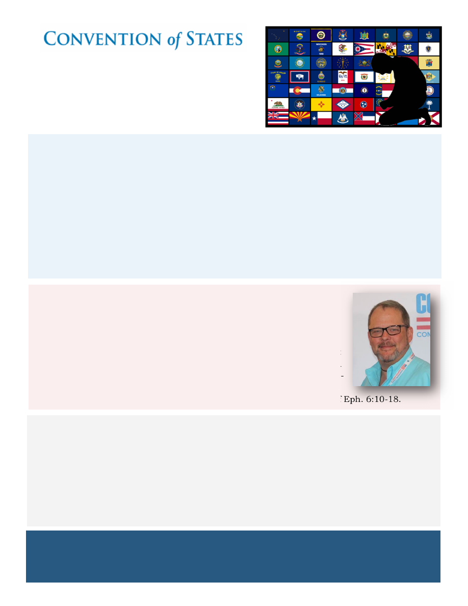 ![]() Prayer Warriors Battle Plan September 2019 September Events and Requests • Let’s give thanks for a amazing national Leadership Summit in Williamsburg last month! Pray for ongoing impact and enthusiasm. • Ask God to bless the development of training and leadership courses in COS University. • Pray for the tech team as they work to maintain and improve the website, tools, and systems. • September 17 is Constitution Day. Pray for volunteers who are working on presentations and other projects to celebrate the day. Leadership Prayer Focus Things are hopping in the state of Massachusetts since Michael Arnold recently stepped into the role of State Director! Michael shared prayer requests immediately after the excitement of the Leadership Summit: “The faith, patriotism, and love that swept over me at the summit is still fresh in my veins.” He asks prayer for his own eyes and heart to be open to God’s truth, and that we COS patriots would find effec- tive ways to “connect the dots” for Americans between the unease in their hearts and the self-evident truths before their eyes. Michael reminds us of Eph. 6:10-18. Scripture of the Month May the favor of the Lord rest on us; establish the work of our hands for us— yes, establish the work of our hands. — Psalm 90:17 Lord, without your favor, we know our cause will not succeed. And without your favor and mercy, we know our beloved country is doomed as well. So God, we ask for your favor to rest on us. Give us favor among leaders and legislators and our fellow citizens. We boldly call on you to work mira- cles and acts of providential grace. Establish the work of our hands so that it will bear the fruit that you intend for it to have. Raise up district captains, social media warriors, and media liai- sons, and empower them to be effective in their roles. Allow us to change history for your glory. Second Sunday Prayer Call - September 15, 9:00 pm Eastern By phone: 712-770-5505, access code: 256438# On line: https://join.freeconferencecall.com/sharonjc1 ![]() Daily Prayer Guide for September 2019 1 Florida: as I write this, Hurricane Dorian is bearing down on the state. Pray for all those responding to the storm and its impact. 2 Arkansas: and Kansas: ask God to supply volunteers to help with fairs and gun shows in September and for grassroots growth as a result. 3 Wisconsin: pray for a favorable outcome in committee and (possibly) floor votes! 4 New Mexico: lift up presentations that are being given around the state in September. Also pray for an important doctor visit for Keith Dotson’s wife Agnes—today. 5 Pray that when we arrive at the convention, a strong foundation of constitutional under- standing will be in place to support the proposed amendments. 6 South Carolina: ask God to give favor with two key Senators and two key Representa- tives who are standing in the way of a floor vote. 7 New York: SD Lois Alimonti asks prayer that the inspiration and enthusiasm from the national summit will be passed on to all their volunteers and supporters and will result in new patriot recruits. 8 Call on God to raise up state directors for the following states: DE, ME, MI, NE, NV, OR, RI, VT, WV. Praise for a new FL SD! 9 Michael Farris, co-founder of COS, now leads Alliance Defending Freedom. Pray for success in their legal battles to protect religious liberty. 10 Virginia: pray for leaders to commit them- selves to resisting the destruction of our Constitution and liberties. 11 Georgia: ask God’s blessings on upcoming strategy meetings and ongoing connections with the staff of a large church. 12 Speak agreement with Philippians 4:19 for COS and ask a blessing on Patty Meckler, VP of Development. 13 New Jersey: pray for a well-attended event with Pete Hegseth tomorrow and that it will have a great impact. 14 Arkansas: pray for good attendance and safe travel to the AR leadership summit today. 15 Indiana: pray for the team to have a strategy to recruit petition signers and District Cap- tains—often a challenge with passed states. 16 Pray for unity and support among family members of COS volunteers who are impact- ed by the demands of the effort. 17 Today is Constitution Day! Let’s thank God for this tremendous gift and blessing to the American people. Prayer Goals for 2019 • Increase in the number and engagement level of grassroots leaders—specifically by the end of summer—as follows: • 925 active leaders across COS (867 as of mid-July) • 525 active DCs across COS (491 as of mid-July) • 90 active GCs across COS (75 as of mid-July) • Two more states to pass the resolution before the end of 2019, which will bring us to a total of 17, half-way to our goal of 34 states. • A distinct increase in the number of COS presentations given by volunteers across the country. • A breakthrough in Eagle Forum's opposition to COS (this may need a longer-term prayer focus beyond 2019). ![]() 18 Minnesota: continue to lift up the health concerns of various team members. 19 Pennsylvania: pray for forward motion for the COS resolution in the legislature and passage in 2019! 20 Ask God to raise up a great team of social media warriors to share the COS message on Facebook and Twitter, and that Colossians 4:6 will always be true of them. 21 Connecticut: give thanks for the new Grass- roots Coordinator and pray blessings on her as she learns the role. 22 Kansas: Lift up DC Frank Beattie who has been diagnosed with cancer. 23 Wisconsin: join in asking God to provide a Legislative Liaison, Events Coordinator, Coa- lition Director and many District Captains. 24 New Mexico: the team is excited about initial responses they’ve seen with faith and busi- ness coalitions. Pray for open doors . 25 Minnesota: pray for the MN team and SD Jackie Burns as they develop a District Captain mentoring program. 26 South Carolina: join the team in asking for God to change the heart of Evan Mulch of the John Birch Society, a strong opponent of COS. 2