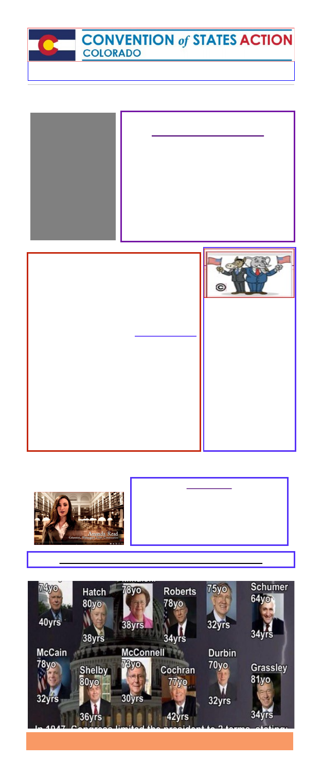 ![]() NORTH FRONT RANGE Our challenge goals to November Elections Generate New Volunteers Add District Captains for Districts now without a DC … Maybe you ? Contacting our newest legislators (and returning ones) about COS Adapt - Adopt - Learn better responses to the QUESTION: WHY COS ? Check out information on ideas how in the Video and pictures below “ The care of human life and happiness , and not their destruction, is the first and only legitimate object of a good government” ~ Thomas Jefferson In this issue: • New Colorado StateGrassrootTeam • Challenge Goals • 3 minute Video on Article V ’ s power • Term Limit Benefits • Founding ‘ Fathers ’ monthly quotation QUARTERLY NEWSLETTER - JULY 2002 Editor/ Author: R. Wayne Walvoord, SIA Team Member solicits input from NFR Volunteers. Colorado ’ s COS Organization A “ Virtual ” Workplace > Loretta Perry , Urban Region, Denver > Rik King , Rural Region, Mancos > Shawn Smith, SGC Team, CO Springs Introducing our Regional State Grassroots Coordinators (SGC) https://www.youtube.com/watch?v=oVQH0JbwIgA Specifics on > Amendment Process & Protections > Article V We the People POWER > Arguments re: “ Runaway Congress ” Succinct Three minute Video about COS Amanda Reed, Columnist |
