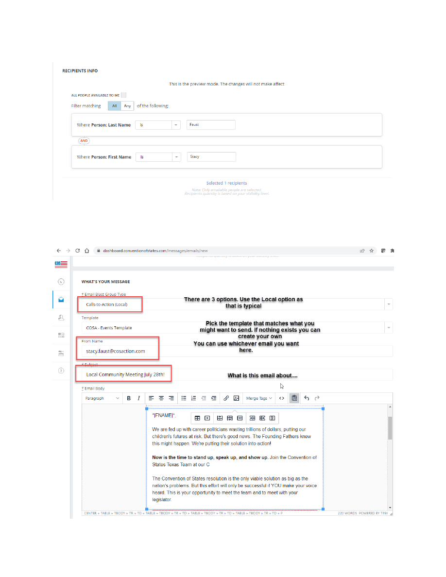 ![]() Email Blast Training Version 1.0 5/16/2022 ![]() Se$ng up your Account and Logging in Visit www.conven-onofstates.com and create an account or Log In first. Once you log in you will see the following page. In the top right corner, you will see your ini<als. Click on the Arrow Down and select DASHBOARD . 1 ![]() The following Page appears once you select Dashboard. Drag your mouse to the left side of the screen and a menu will appear. Click on Messages > Email Blasts 2 ![]() Once you click on Email Blasts this screen will appear and you will click New Email Here you will be selec<ng your criteria to Who you want to send out this blast to. Click on Add Criteria and the drop down appears. They are not intui<ve so you have to just look through the op<ons to see what you want. It is first recommended you send a test email to yourself so you can 3 ![]() see what it will look like. Once you have your criteria you want to decide what you want your email to say. You can use a template or create your own. 4 ![]() You can update the body of the email as well and include an invite link if you are hos<ng a mee<ng. Once you think you are ready to send Hit the SAVE buTon at the boTom of the page. This screen will appear and let you know when it is completed. You verified in your test email it looks good and now you are ready to have it reviewed by someone else. The COS team would like to have the email reviewed before it is sent. You can copy the link and paste it into Slack in the “email_review channel” or forward to someone you know and trust. Once you have the approval to send you will update your Recipients to your target audience. Today I want to send an email blast to all my volunteers in my House District. Therefore I add my criteria for my District and if they selected Volunteer Interest. From the drop down selec<ng Vo<ng > Lower House to send to your District. 5 ![]() I also only want to include those that are interested in volunteering so I added another layer. Scroll down 6 ![]() Click Ready For Review 7 ![]() COS Recommends scheduling your email 15 mins in the future in case you have a last minute thought. Send. Once the email is sent the confirma<on appears. 8 ![]() 9 —- ====== Document Outline ====== * Visit www.conventionofstates.com and create an account or Log In first. |